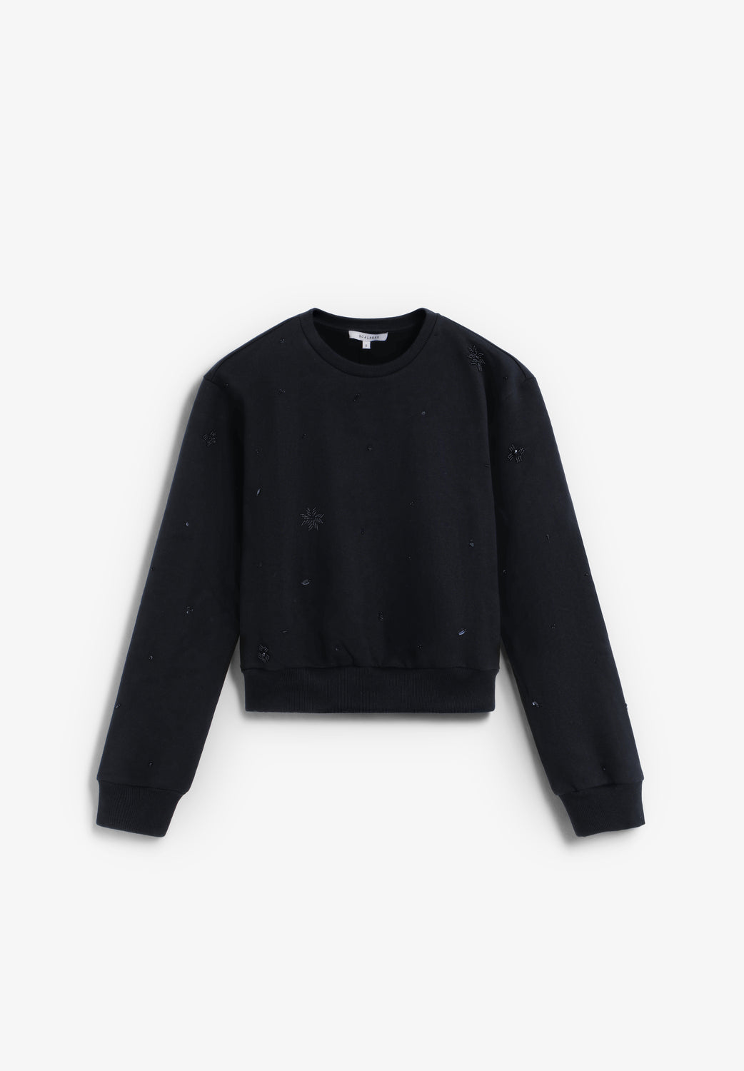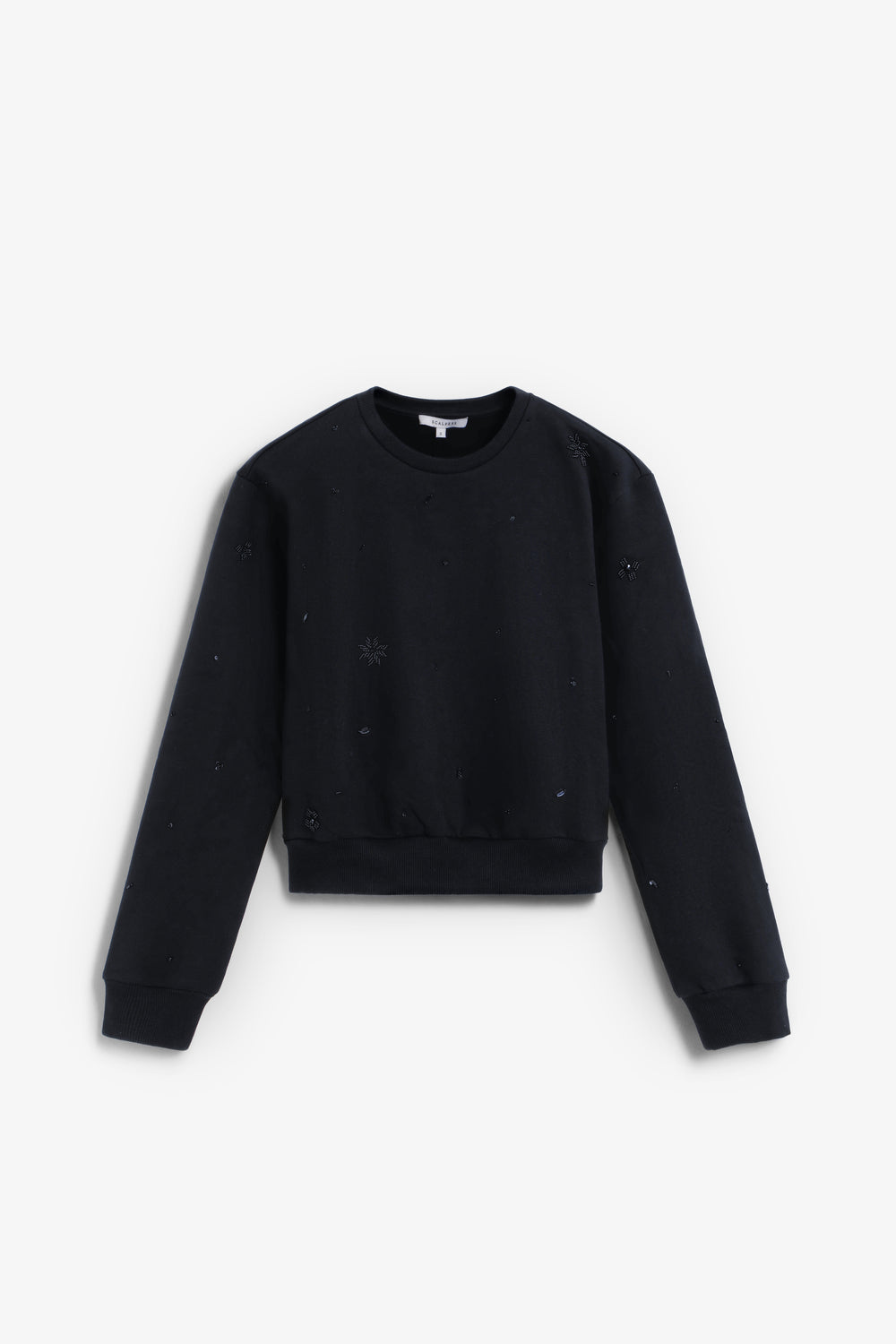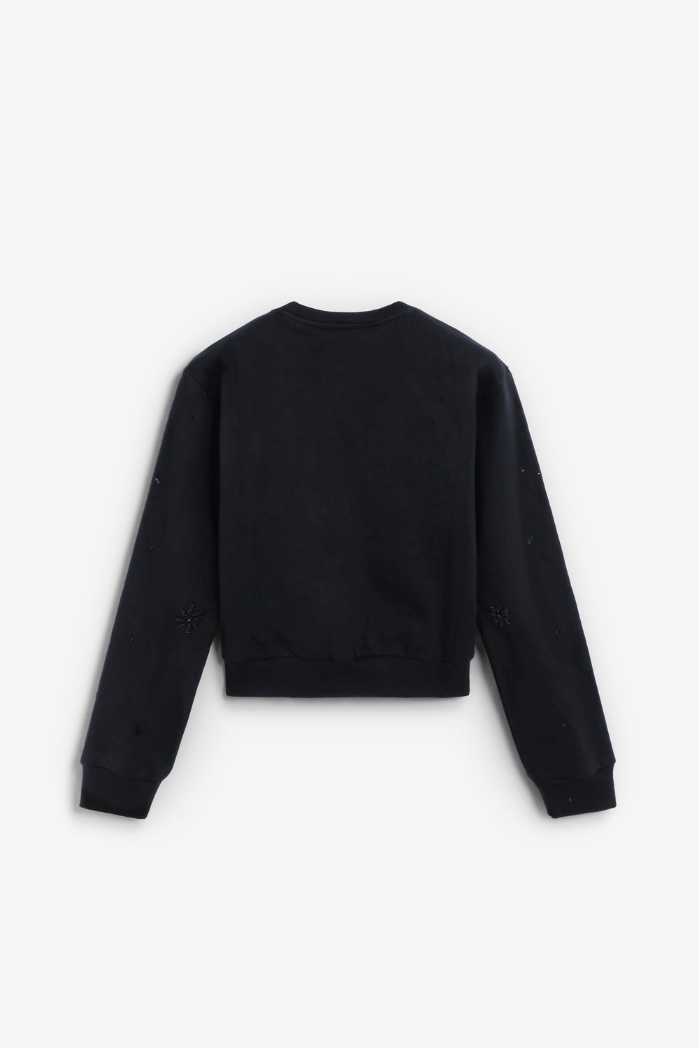 Sudadera confeccionada en 100% algodón con detalles bordados de strass. Regular fit. Cuello redondo y manga largo con acabados en rib.