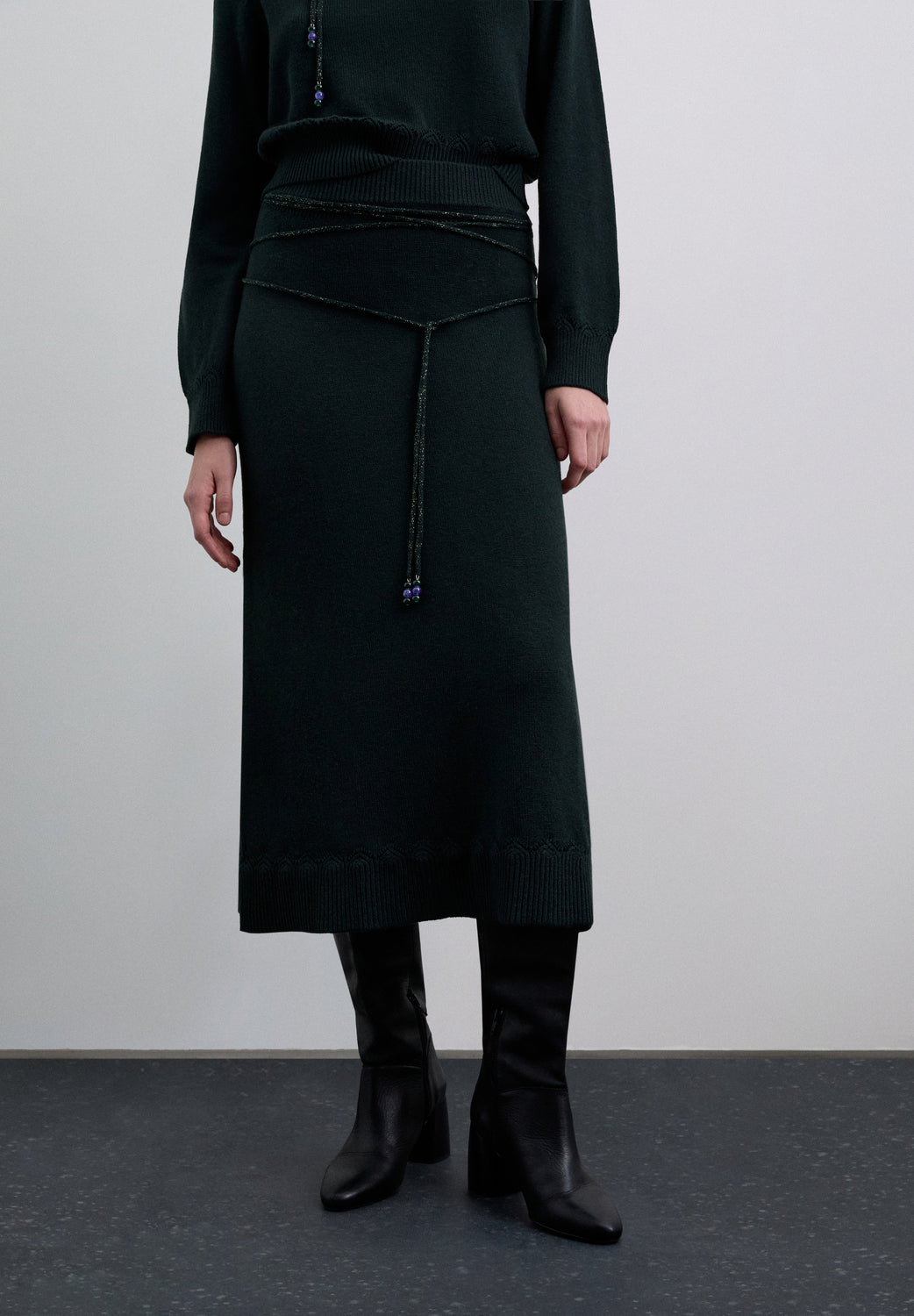 Falda de punto confeccionada en mezcla de lana. Regular fit. Corte midi. Cinturilla elástica. Detalle de cordón con hilo metalizado y cuentas en cintura.