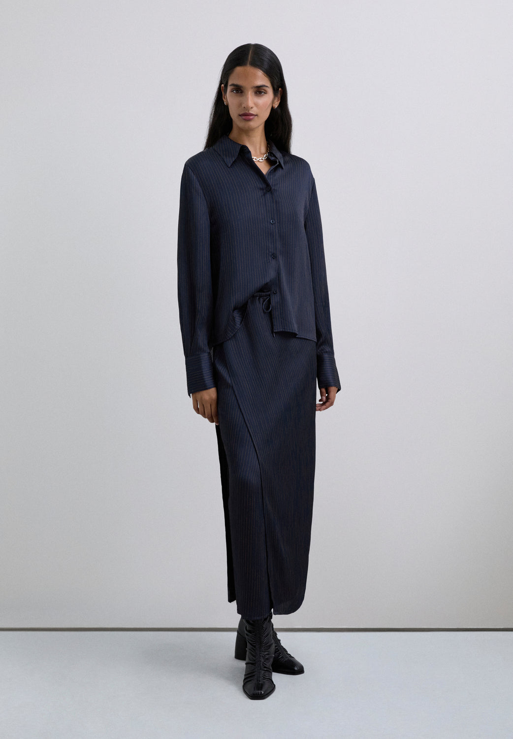 Falda larga de rayas diplomáticas. Cintura elástica con cordón ajustable. Corte recto con abertura lateral