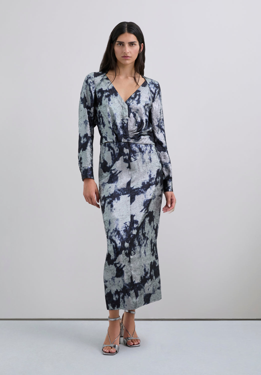Falda confeccionada en tejido fluido con estampado tie-dye con detalles metalizados. Corte slim fit. Midi. Abertura trasera. Cierre con cremallera lateral oculta.