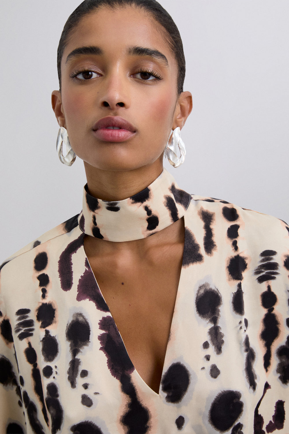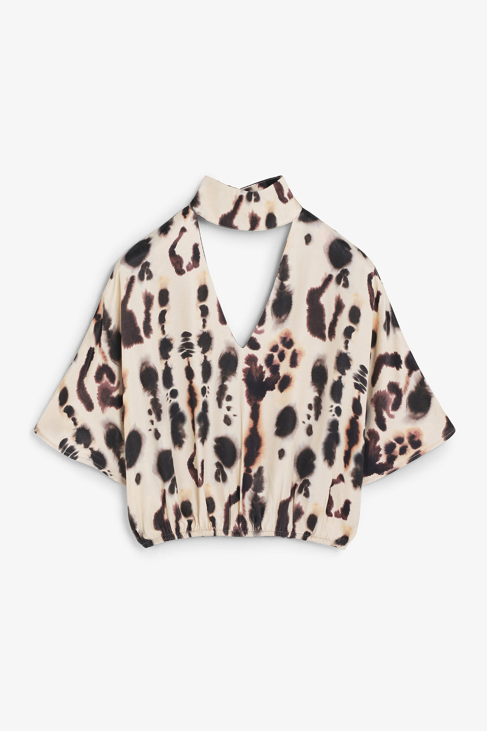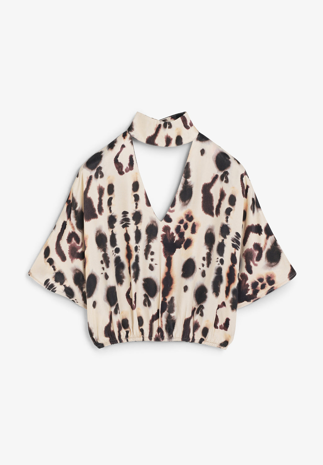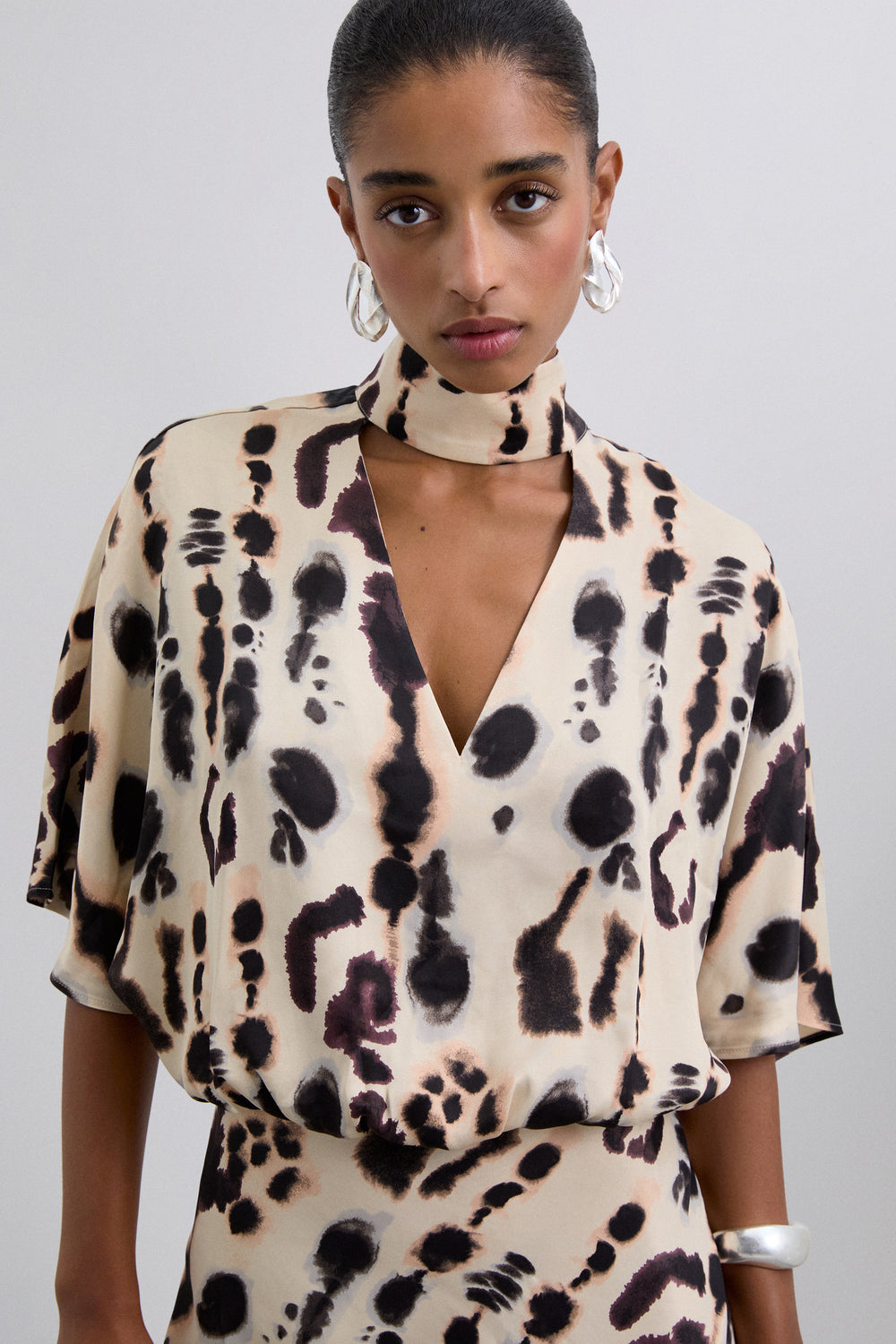 Camisa satinada de manga corta y detalle en cuello. Escote en pico y cogido al cuello. Camisa fluida estampada.