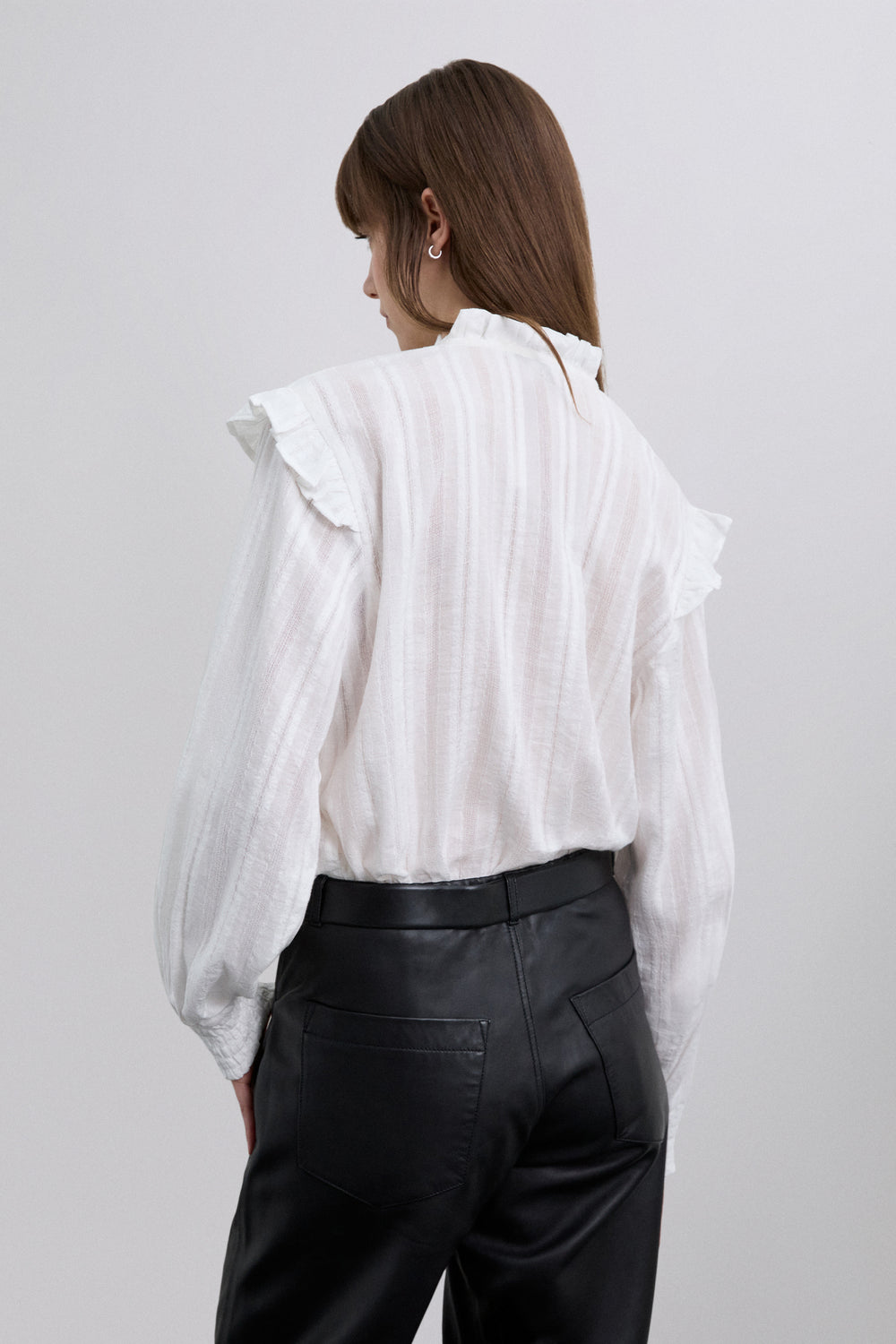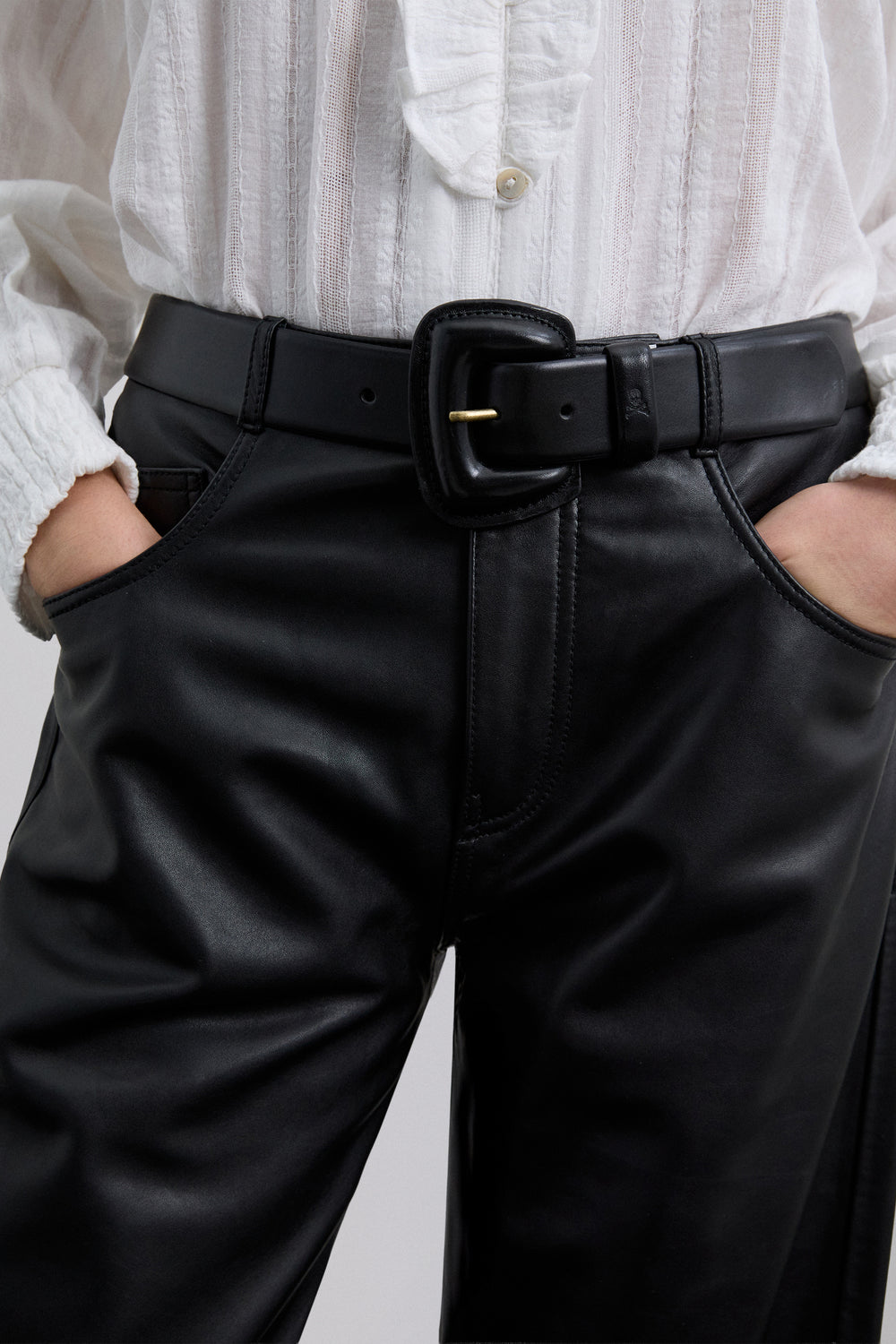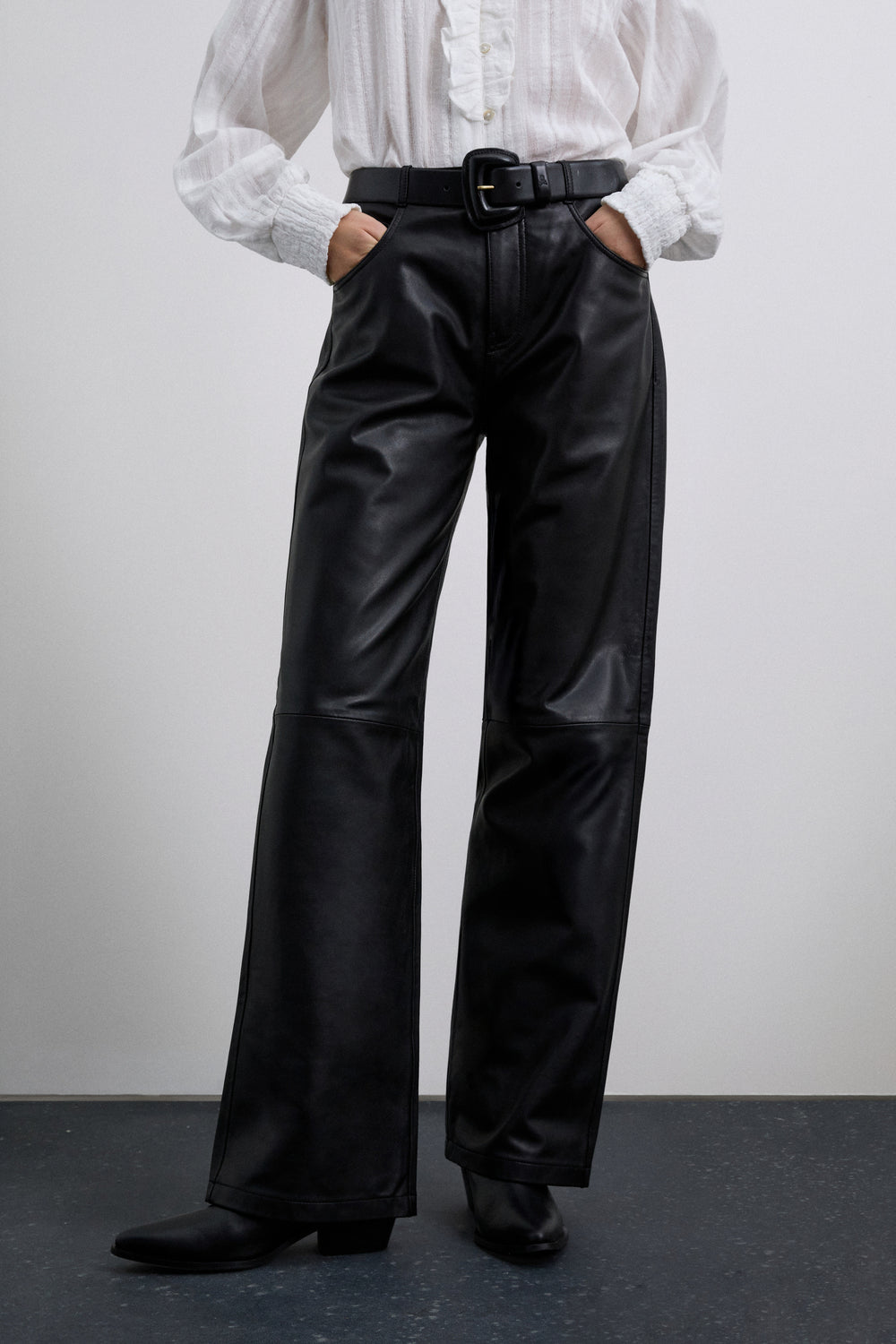Pantalón de tiro alto realizado en piel 100%. Pierna ancha. Cierre con cremallera y bolsillos en parte delantera y trasera. Detalle de costura a mitad de pierna.