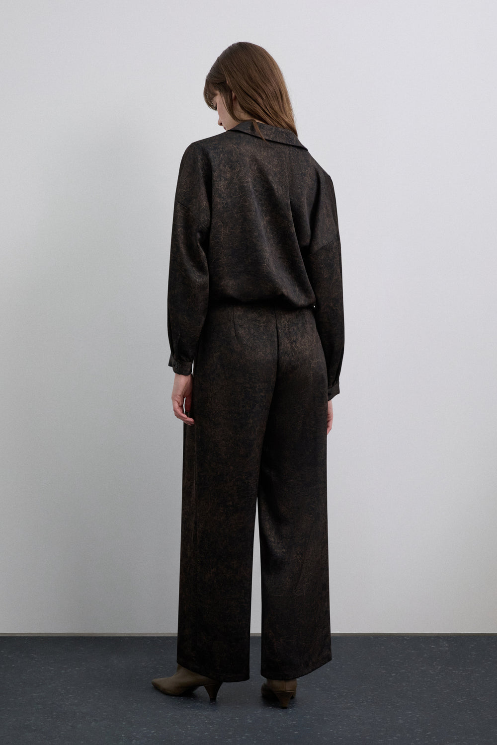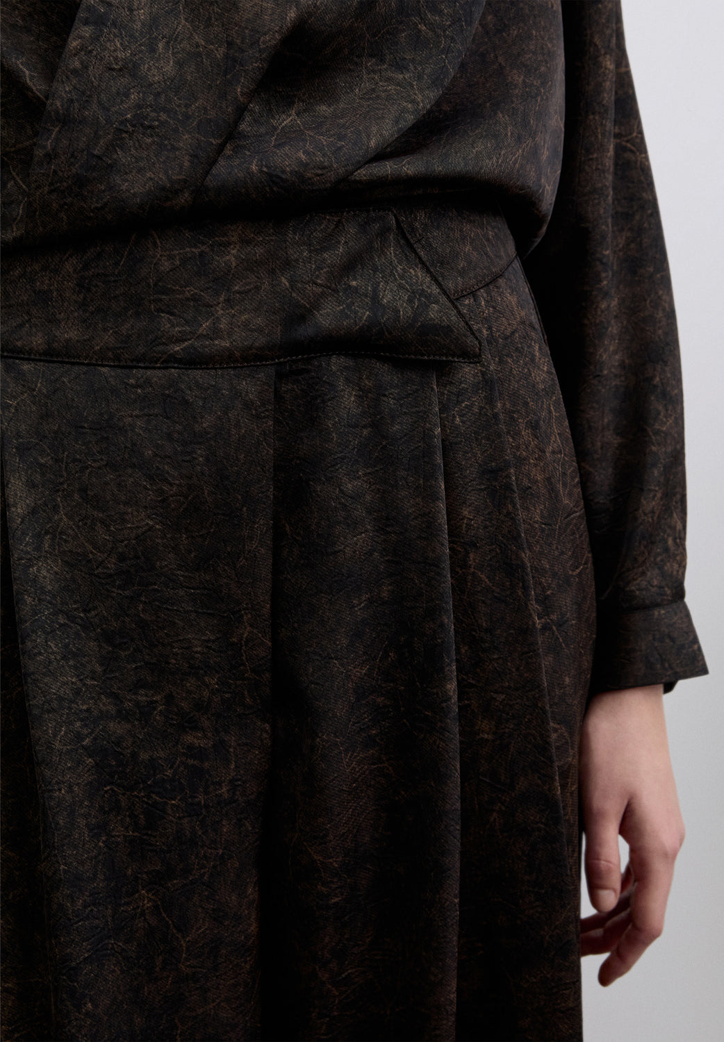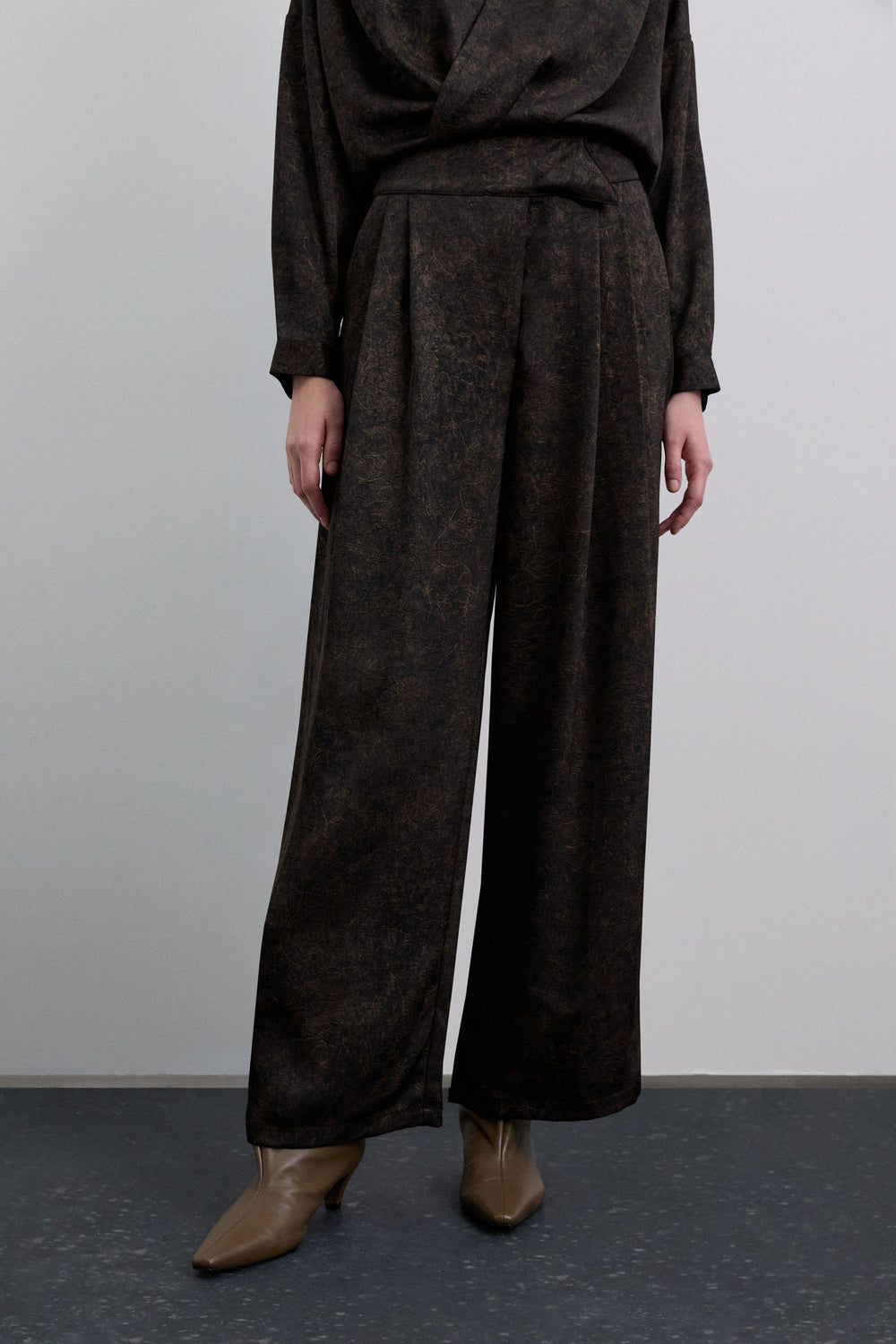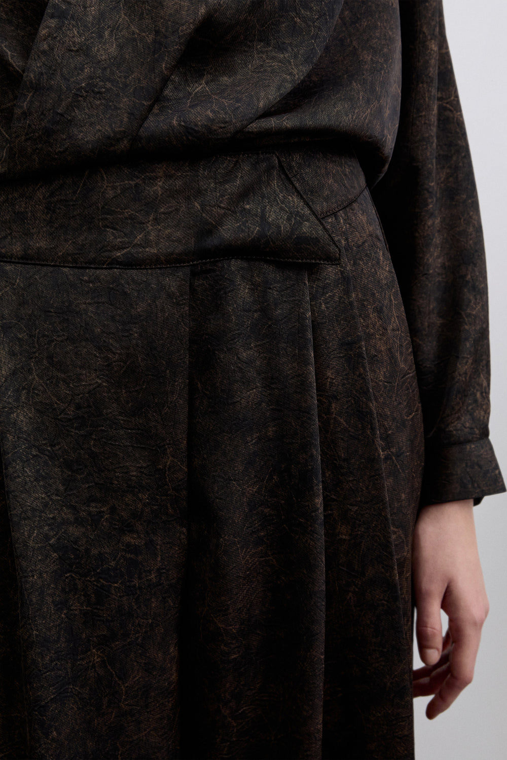 Pantalón confeccionado en tejido fluido con acabado satinado. Estampado de efecto mármol. Corte culotte. Cierre con cremallera frontal y bolsillos laterales.