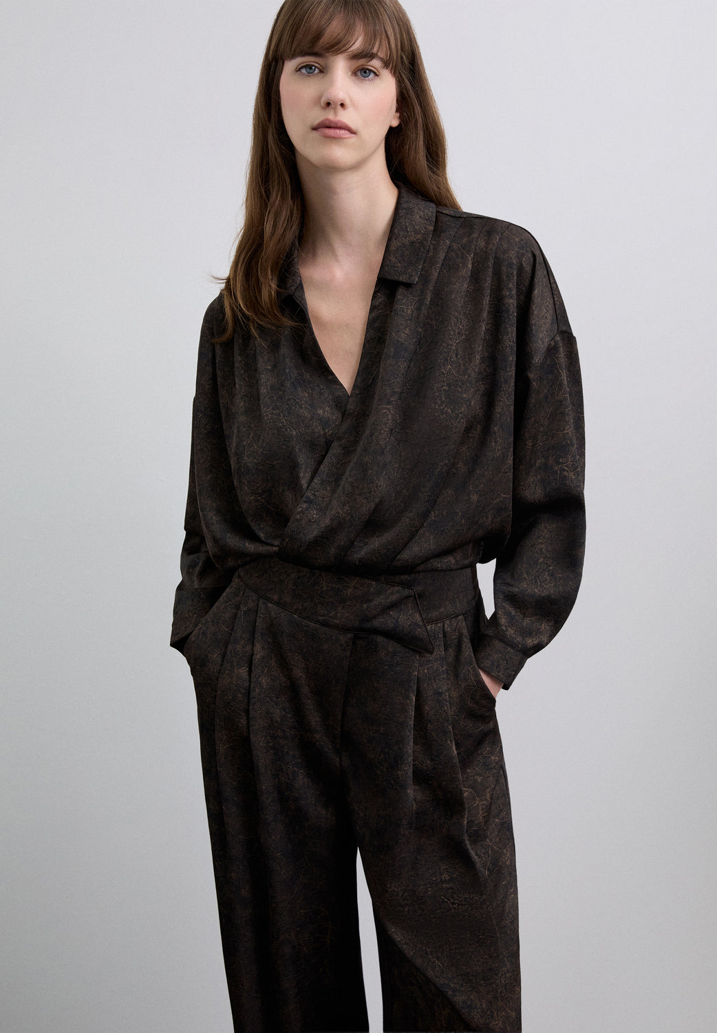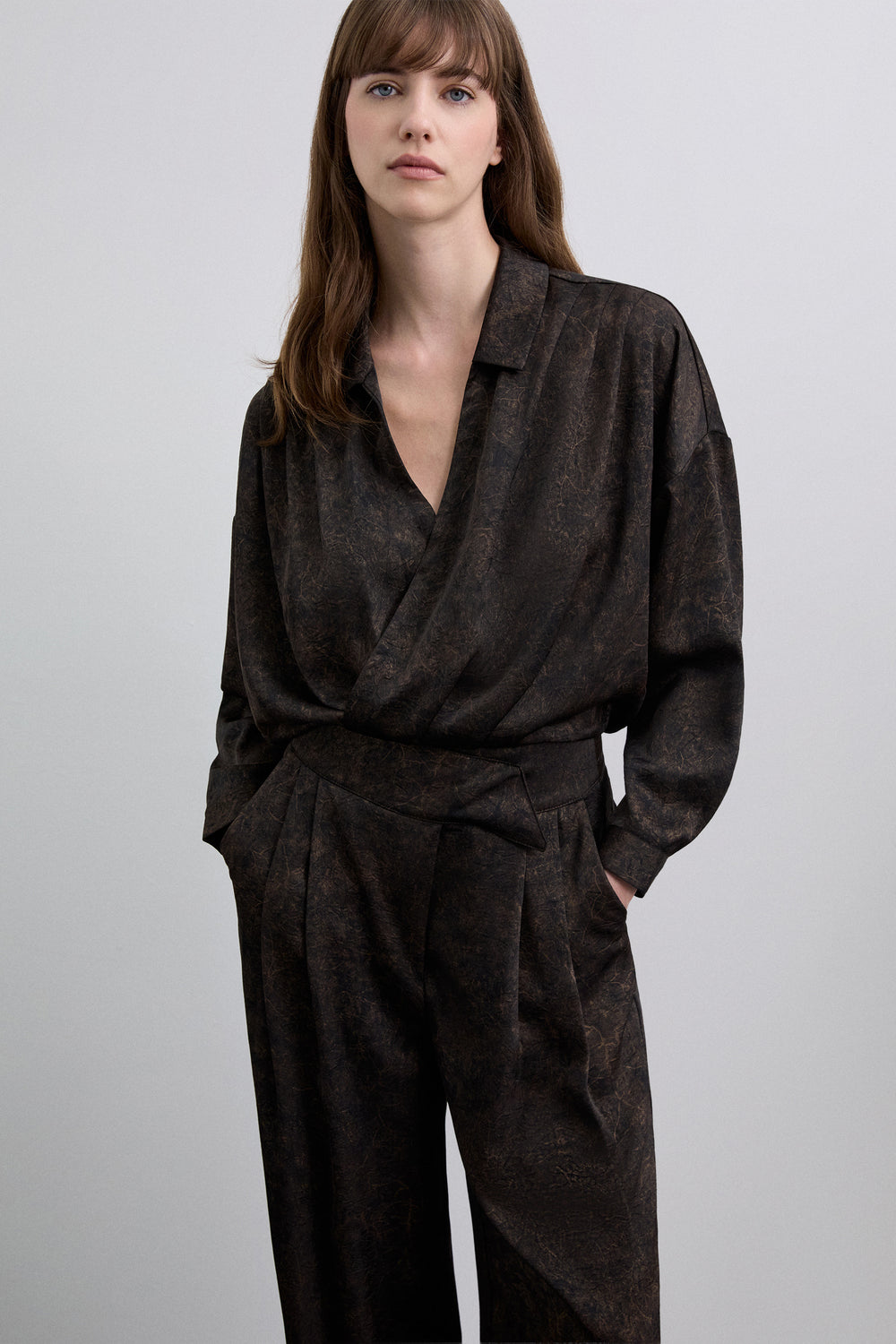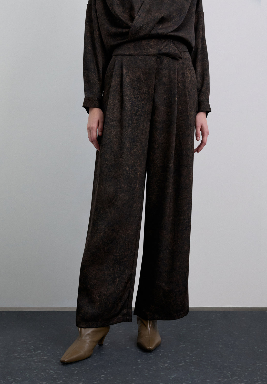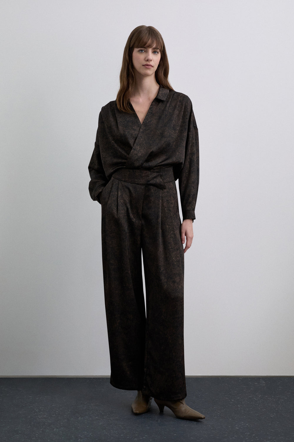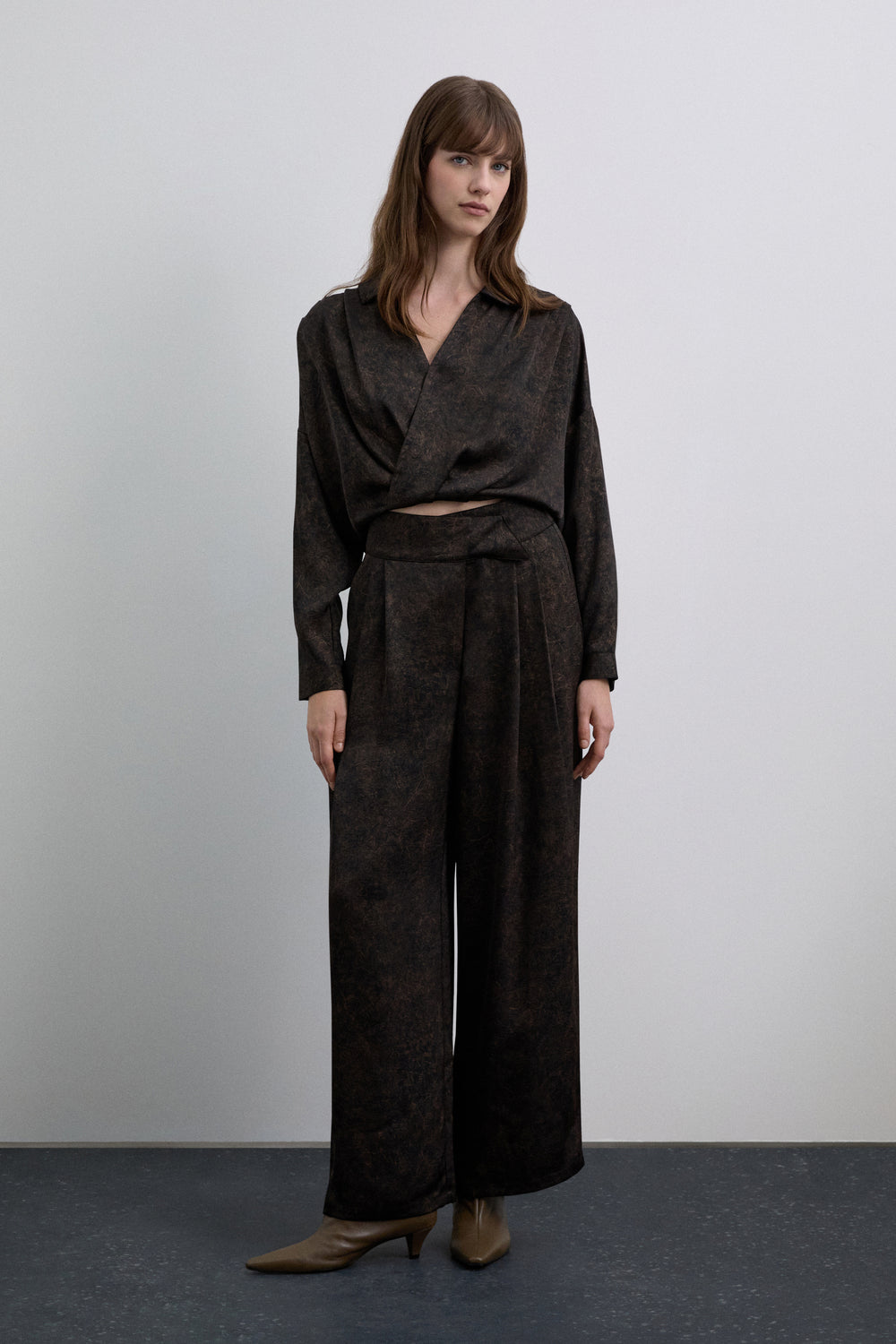 Pantalón confeccionado en tejido fluido con acabado satinado. Estampado de efecto mármol. Corte culotte. Cierre con cremallera frontal y bolsillos laterales.
