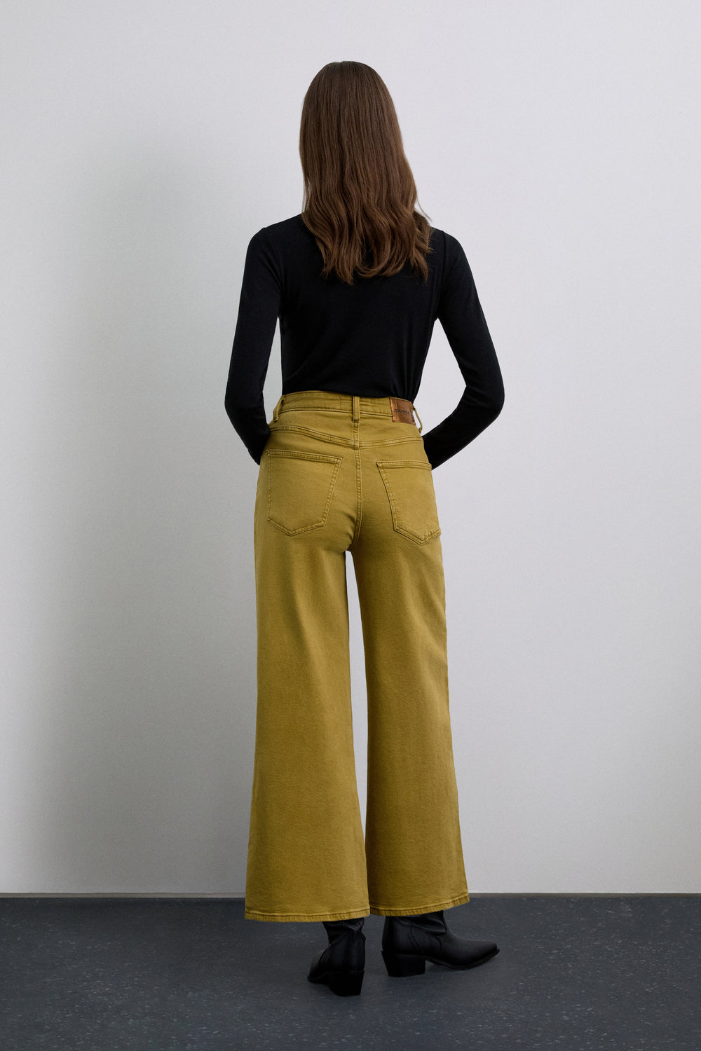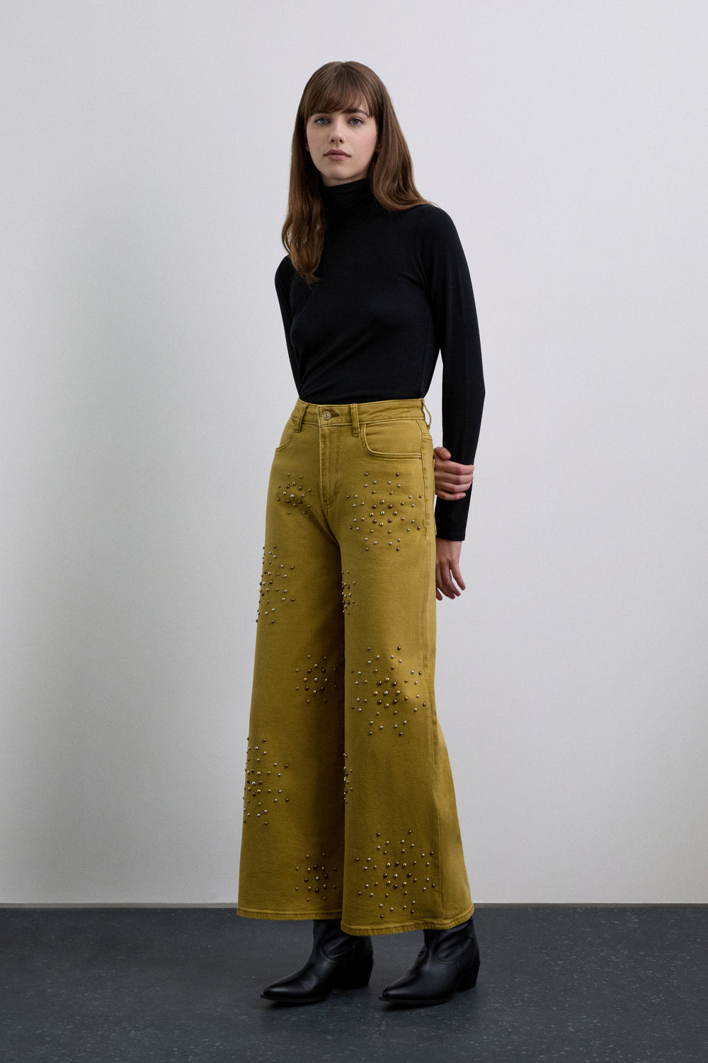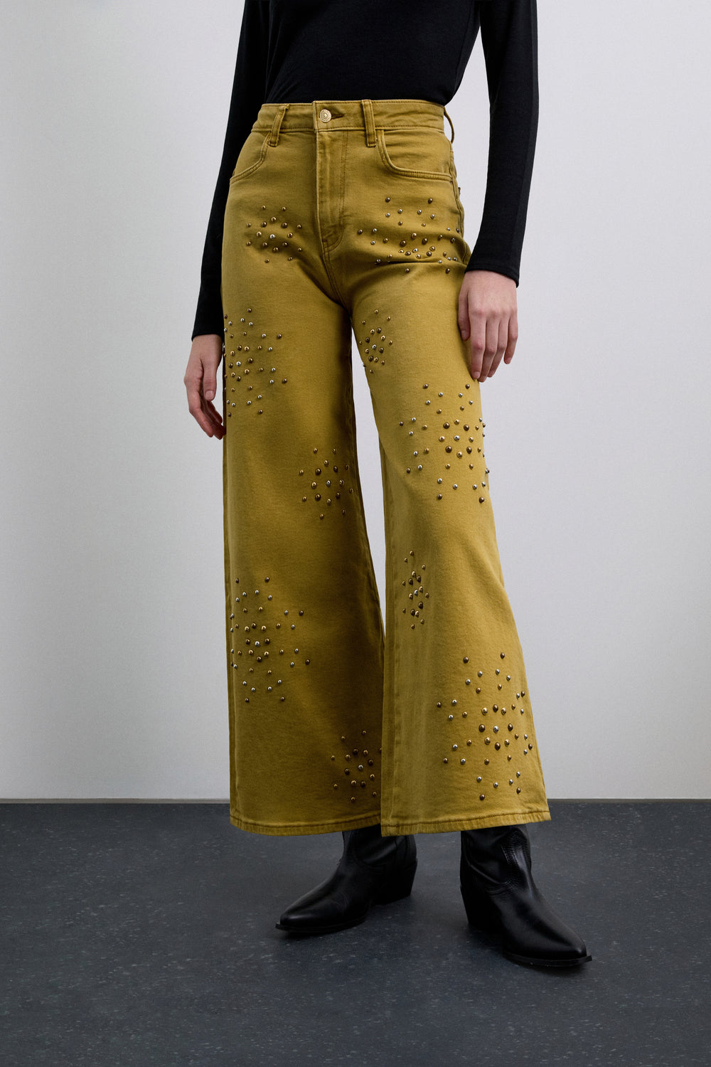 Pantalón denim confeccionado en algodón y elastano. Detalle de tachuelas en parte delantera. Corte culotte, cintura alta y cierre con cremallera y botón. Bolsillos delanteros y traseros.
