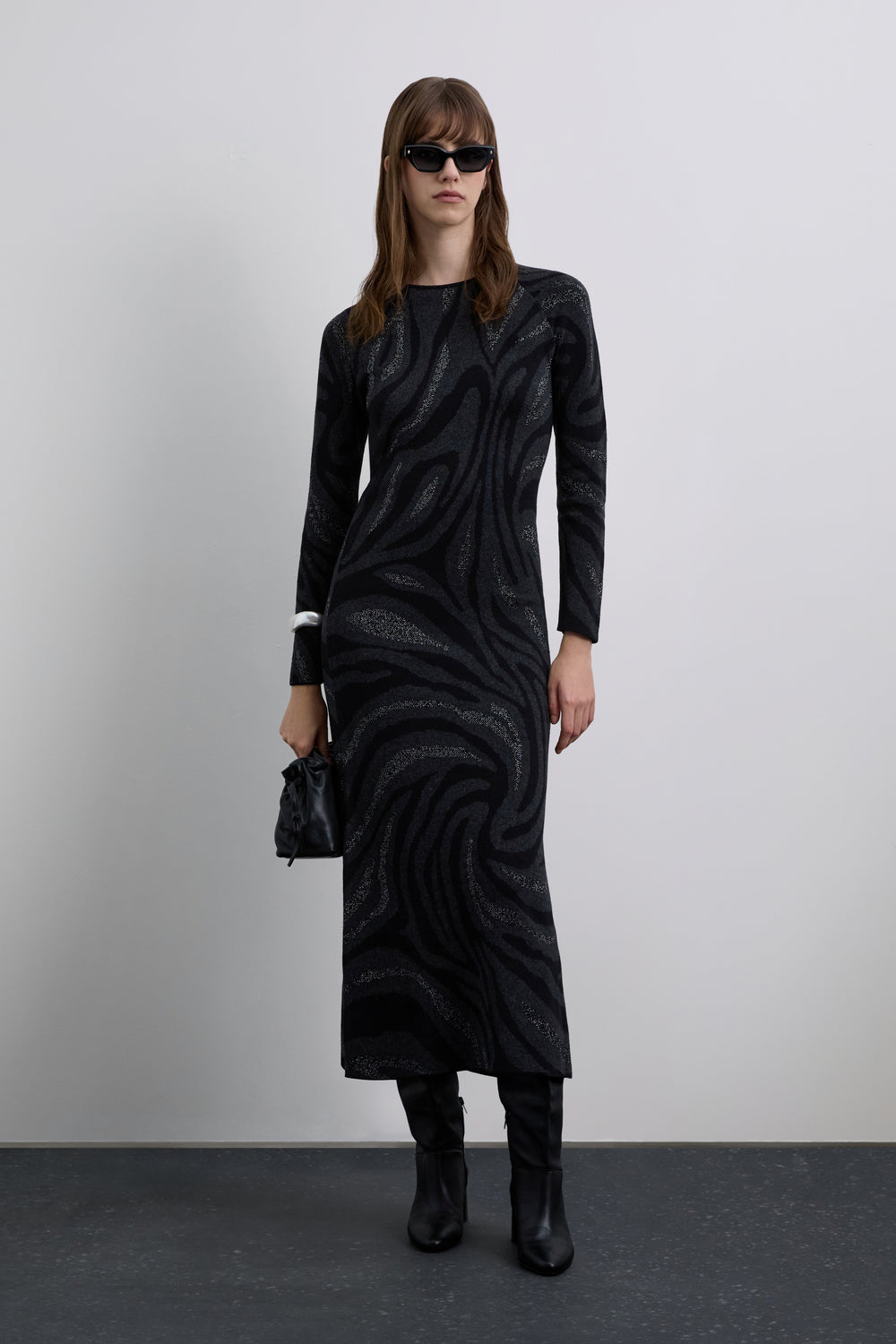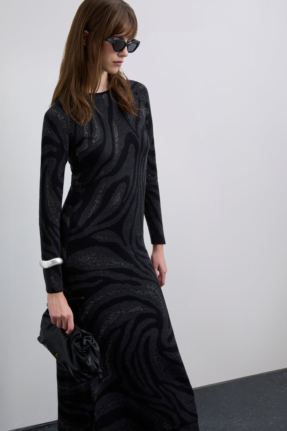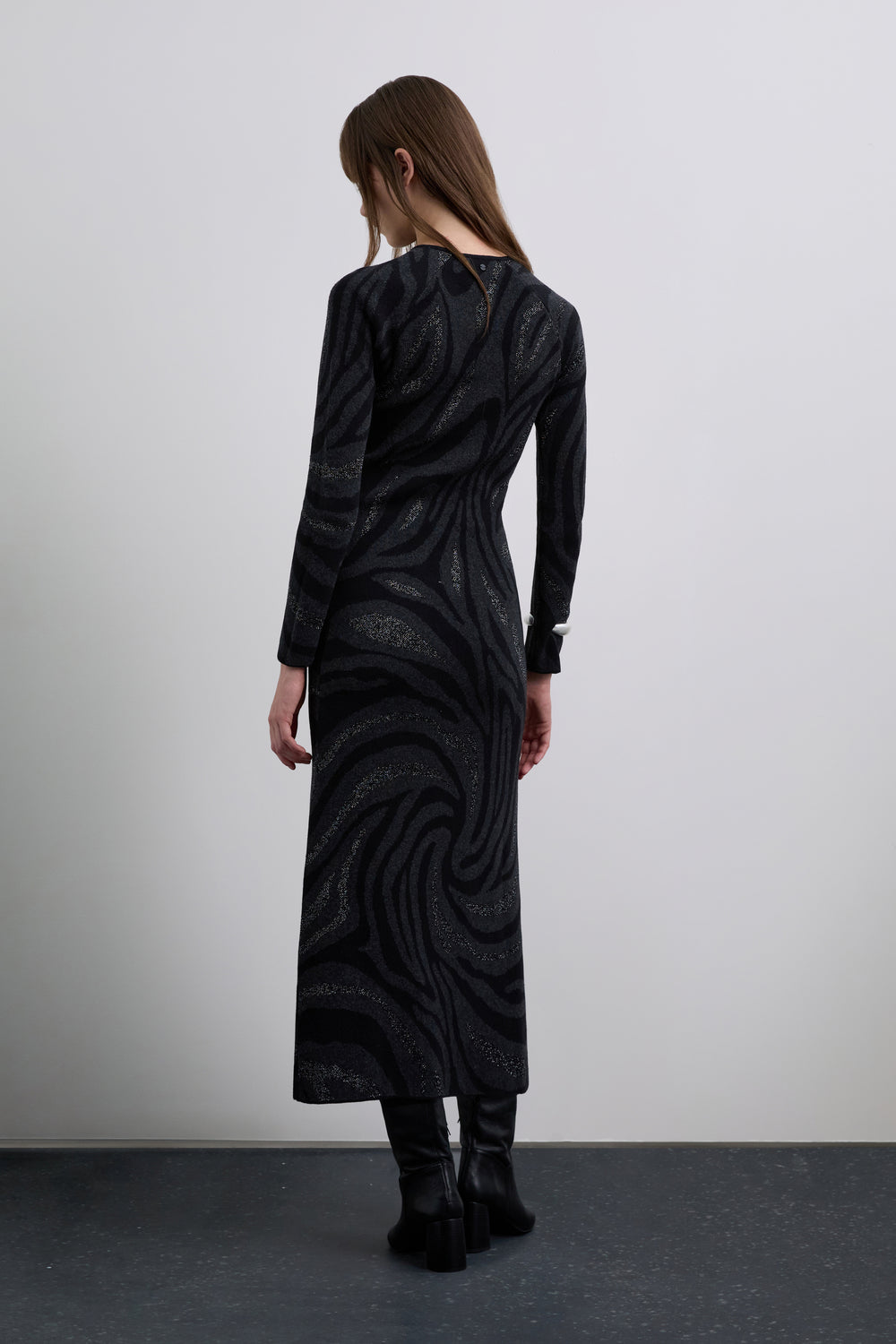Vestido largo estampado de punto. Manga larga. Cuello redondo. Detalle de aplique metálico en parte posterior a tono con logotipo.