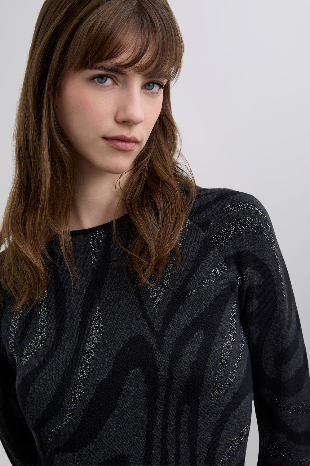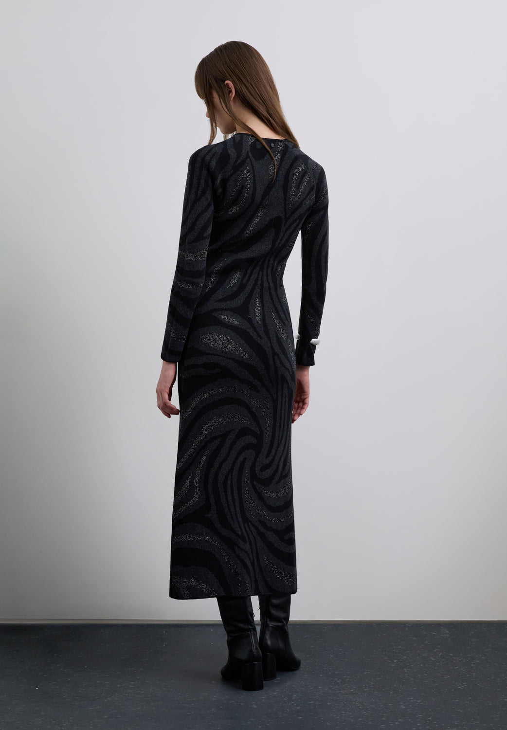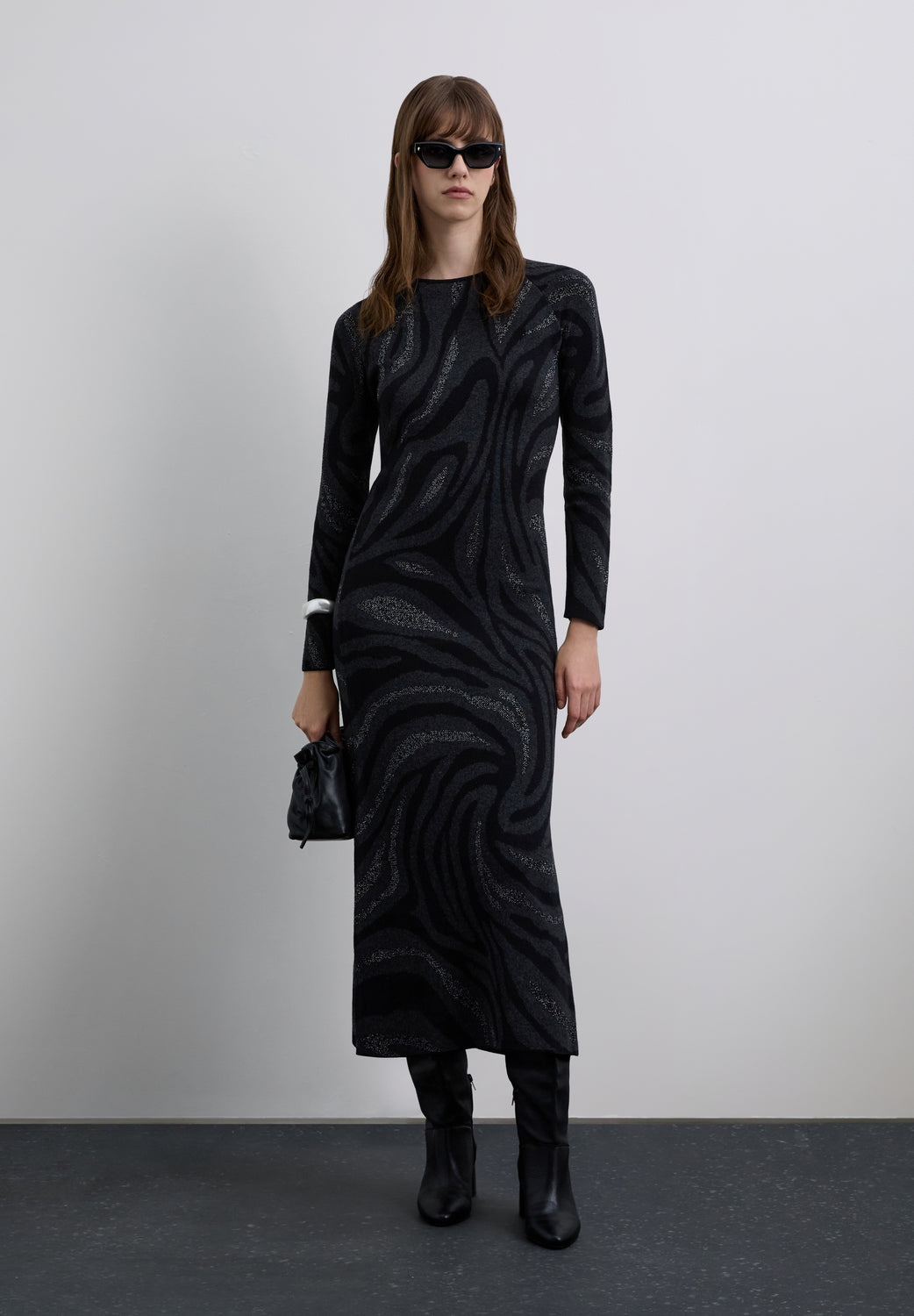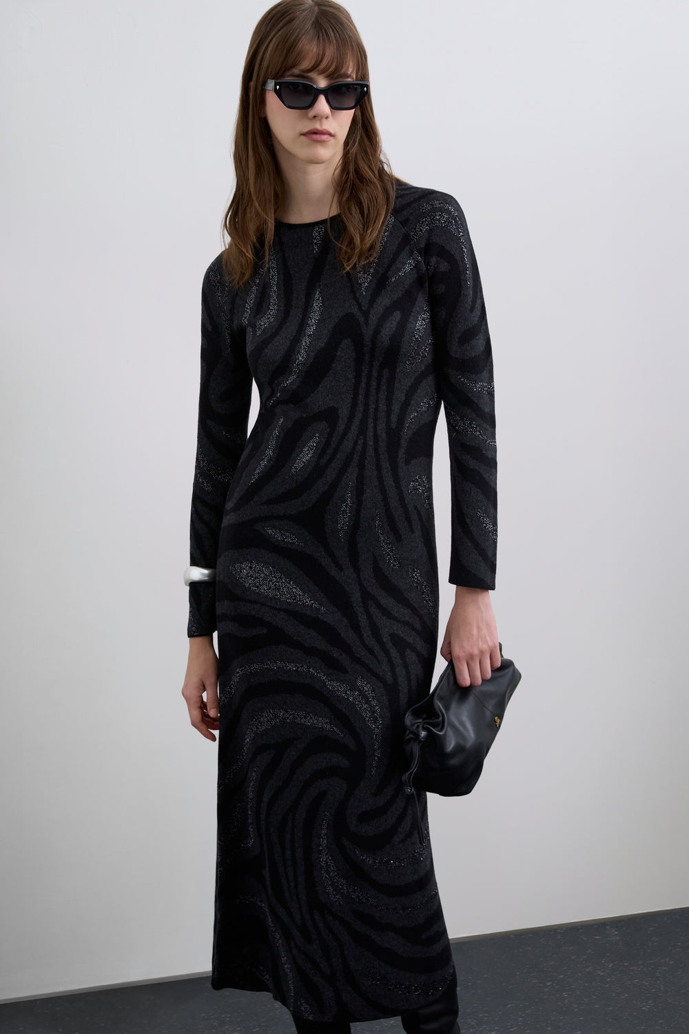 Vestido largo estampado de punto. Manga larga. Cuello redondo. Detalle de aplique metálico en parte posterior a tono con logotipo.