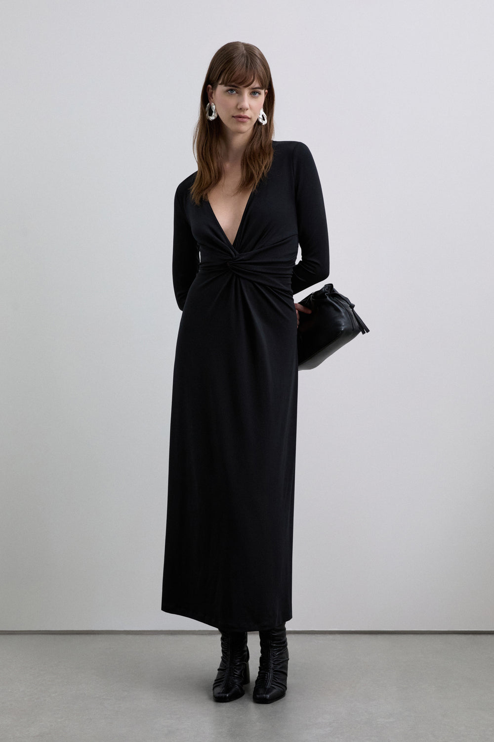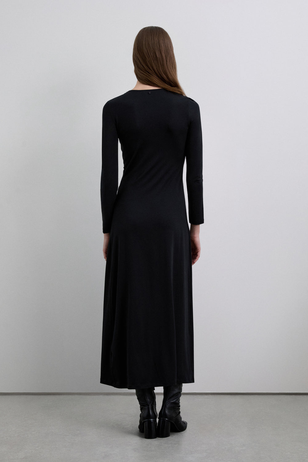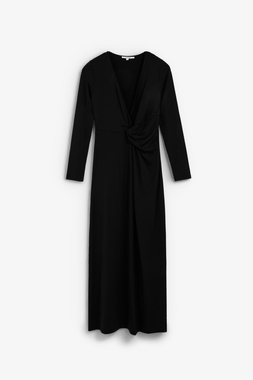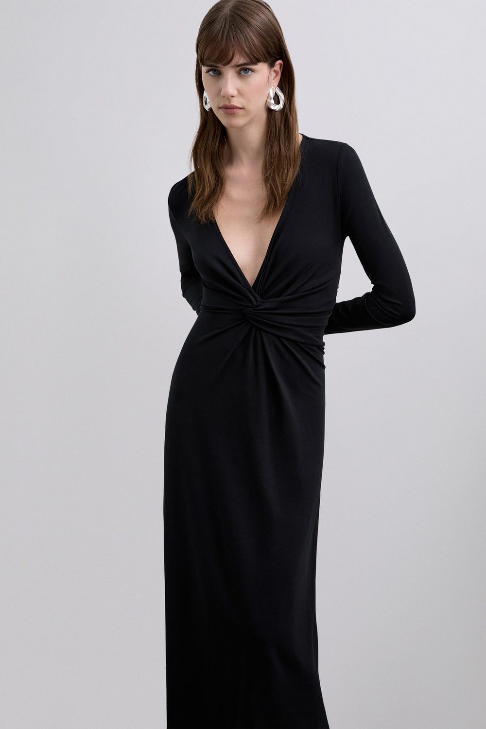 Vestido midi con mangas largas y un escote en pico, tiene una caída fluida.