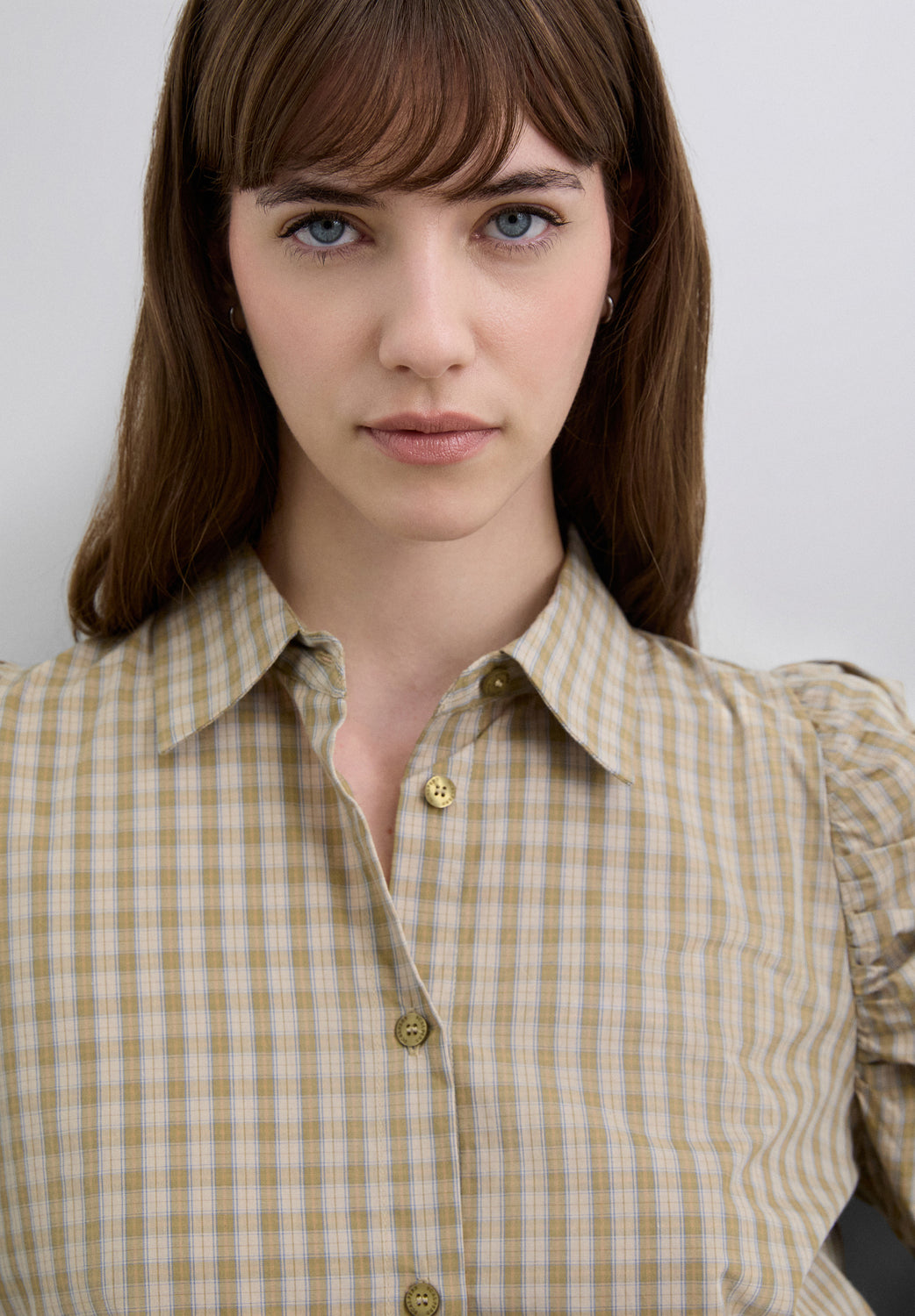 Camisa estampada confeccionada en 100% algodón. Manga larga abullonada. Bajo asimétrico. Cierre mediante abotonadura en frontal.