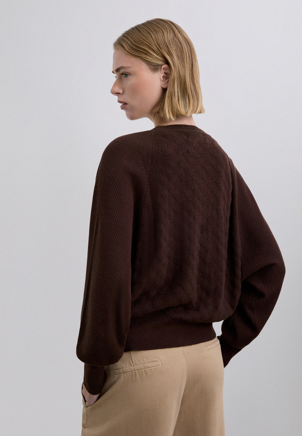 Cárdigan con cuello en V, mangas largas raglán y un corte ligeramente corto. Confeccionado en un punto con patrón decorativo. Las mangas, el escote, el bajo y la tapeta de botones son de canalé.