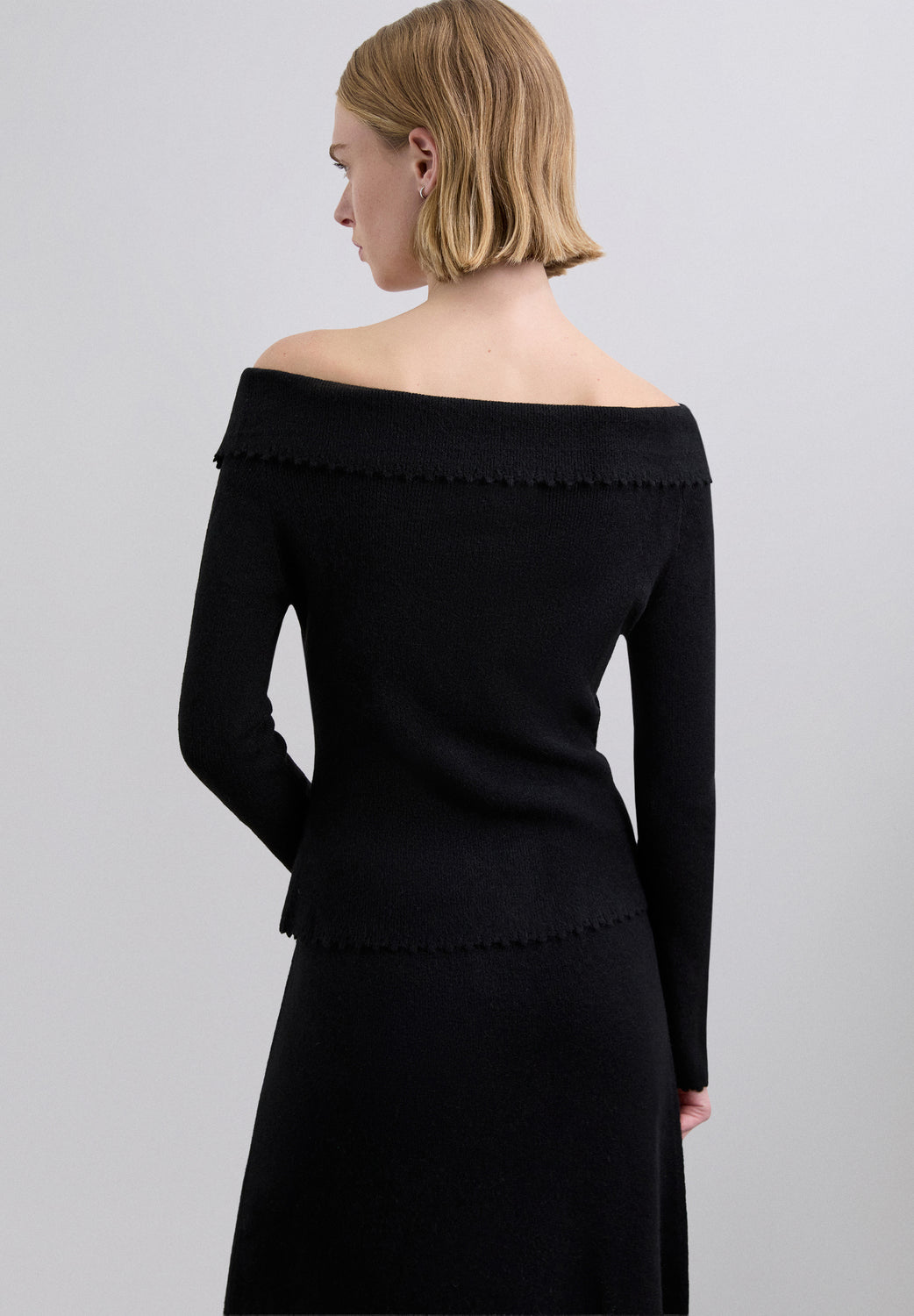 Jersey con hombros descubiertos y mangas largas. El escote presenta una pieza doble que se pliega y se extiende sobre los hombros. Bajo asimétrico. El escote, el bajo y los puños cuentan con un acabado de punto especial.