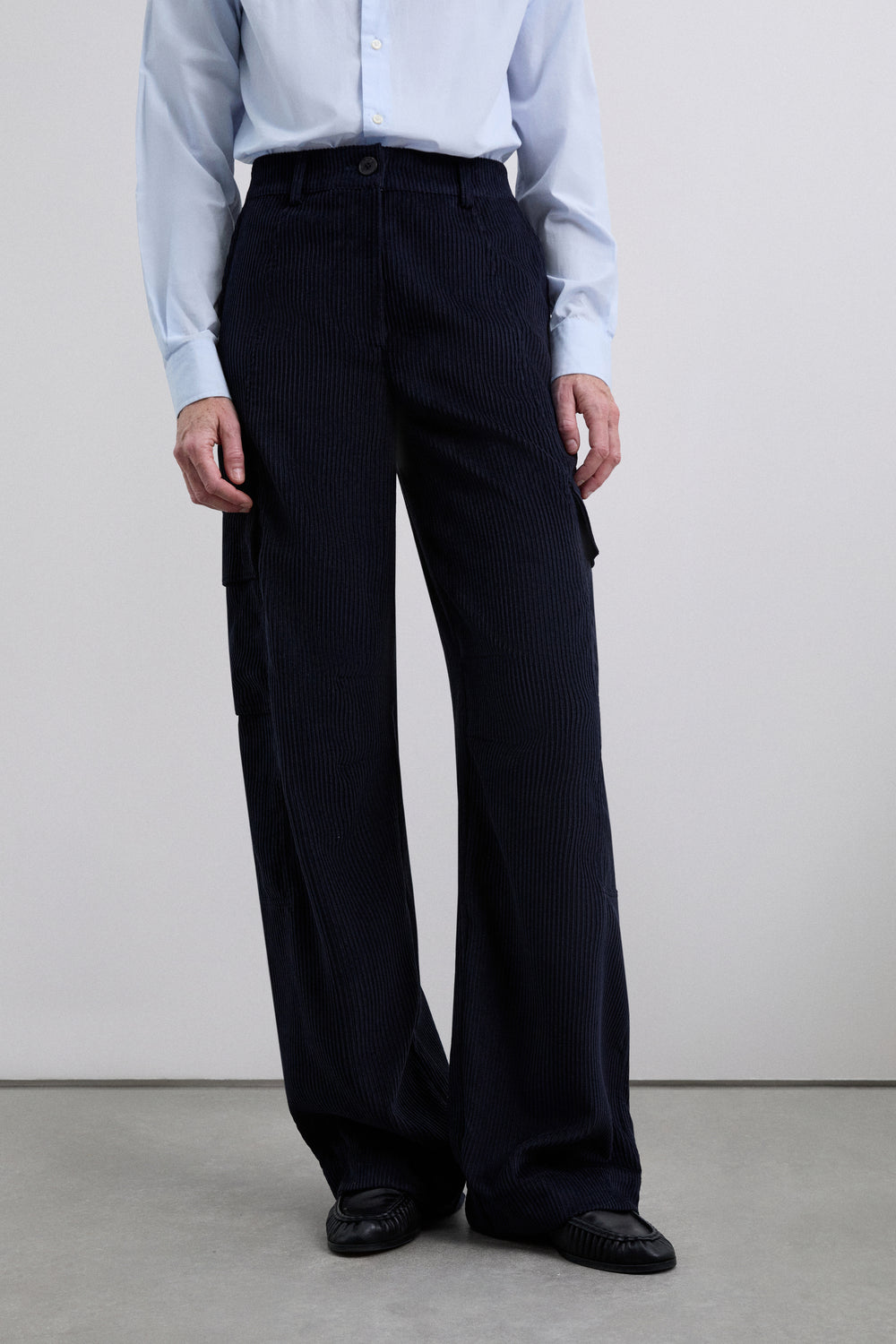 Pantalón de pana cargo de tiro alto. Largo completo. Bolsillos de parche en el lateral. Dos bolsillos frontales y posteriores. Trabillas en cintura. Cierre mediante botón y cremallera.
