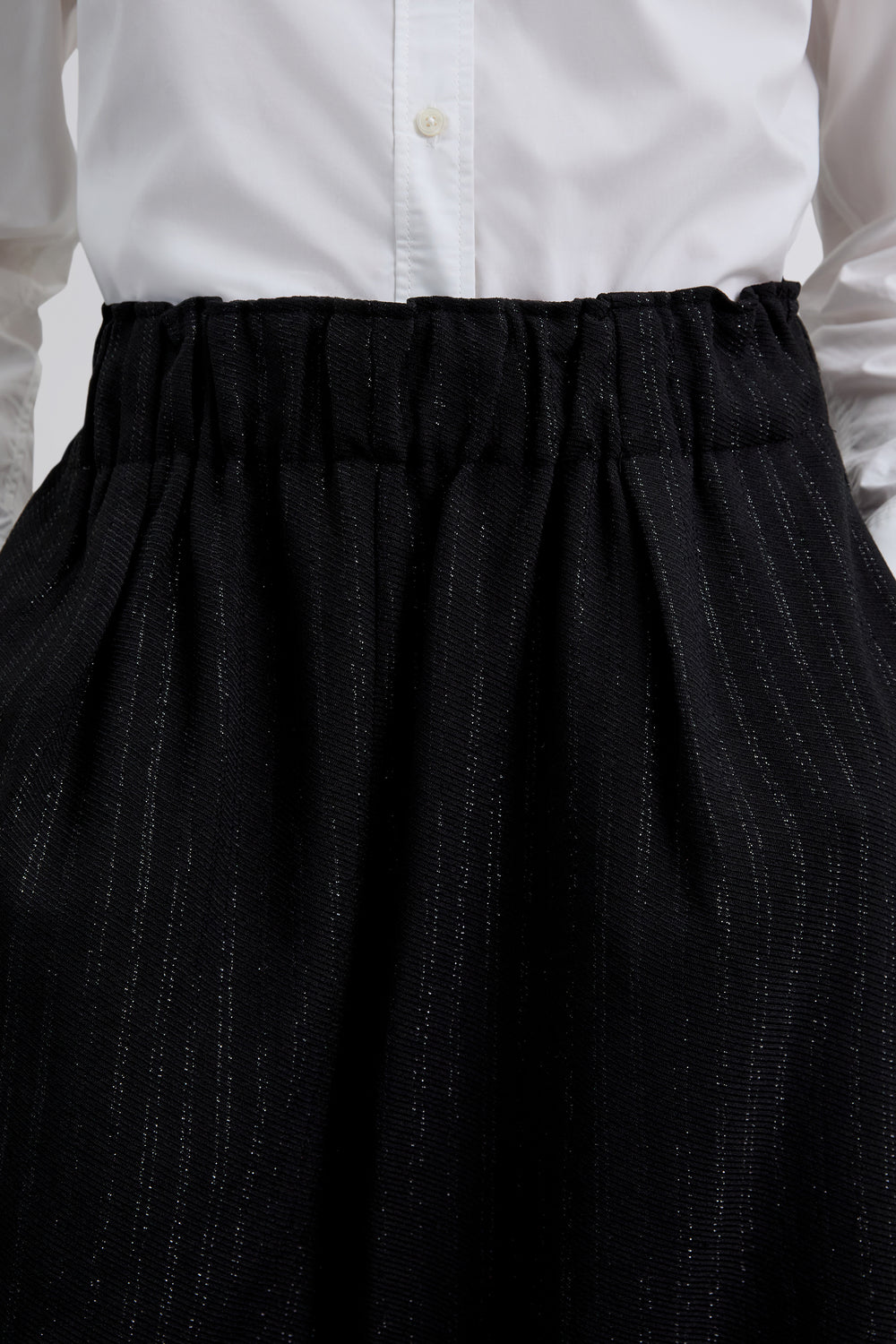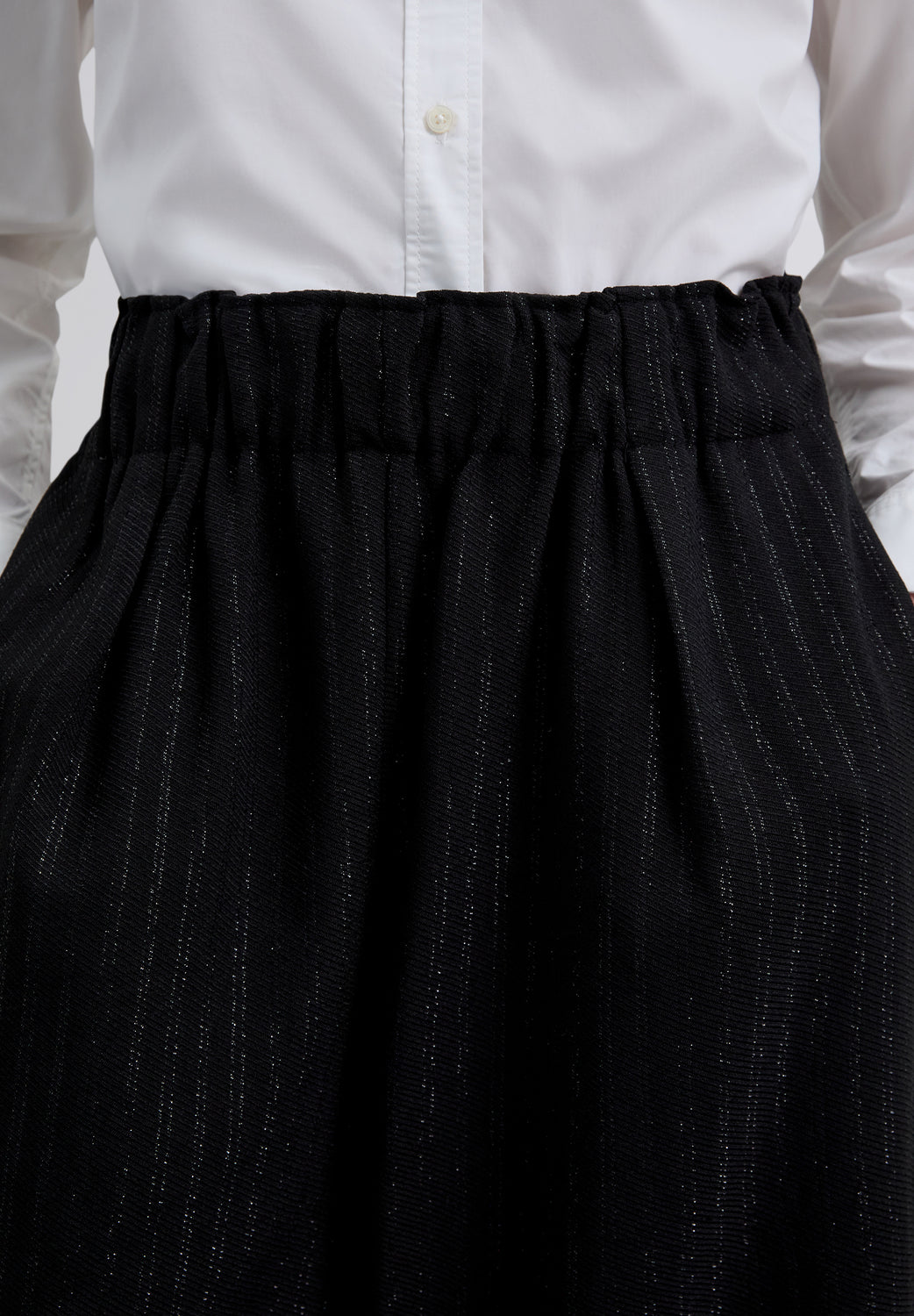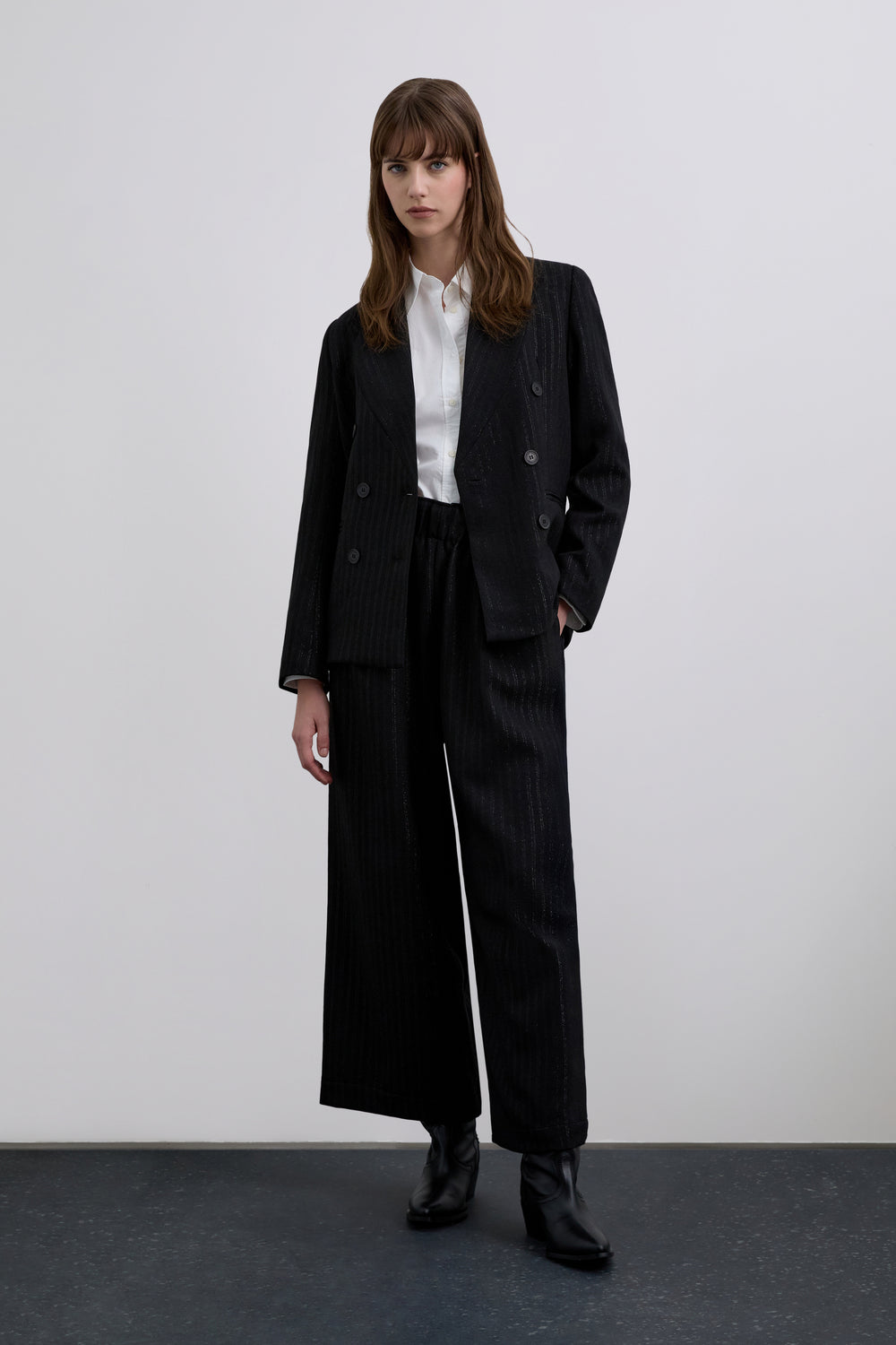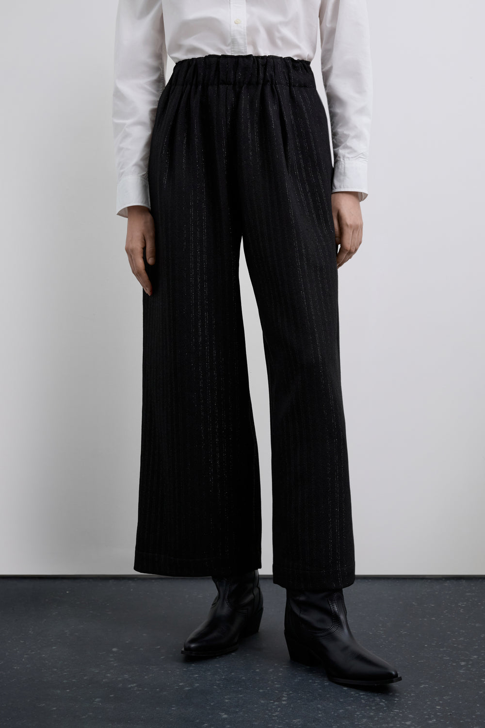 Pantalón de raya diplomática con diseño metalizado. Cintura fruncida. Corte regular.