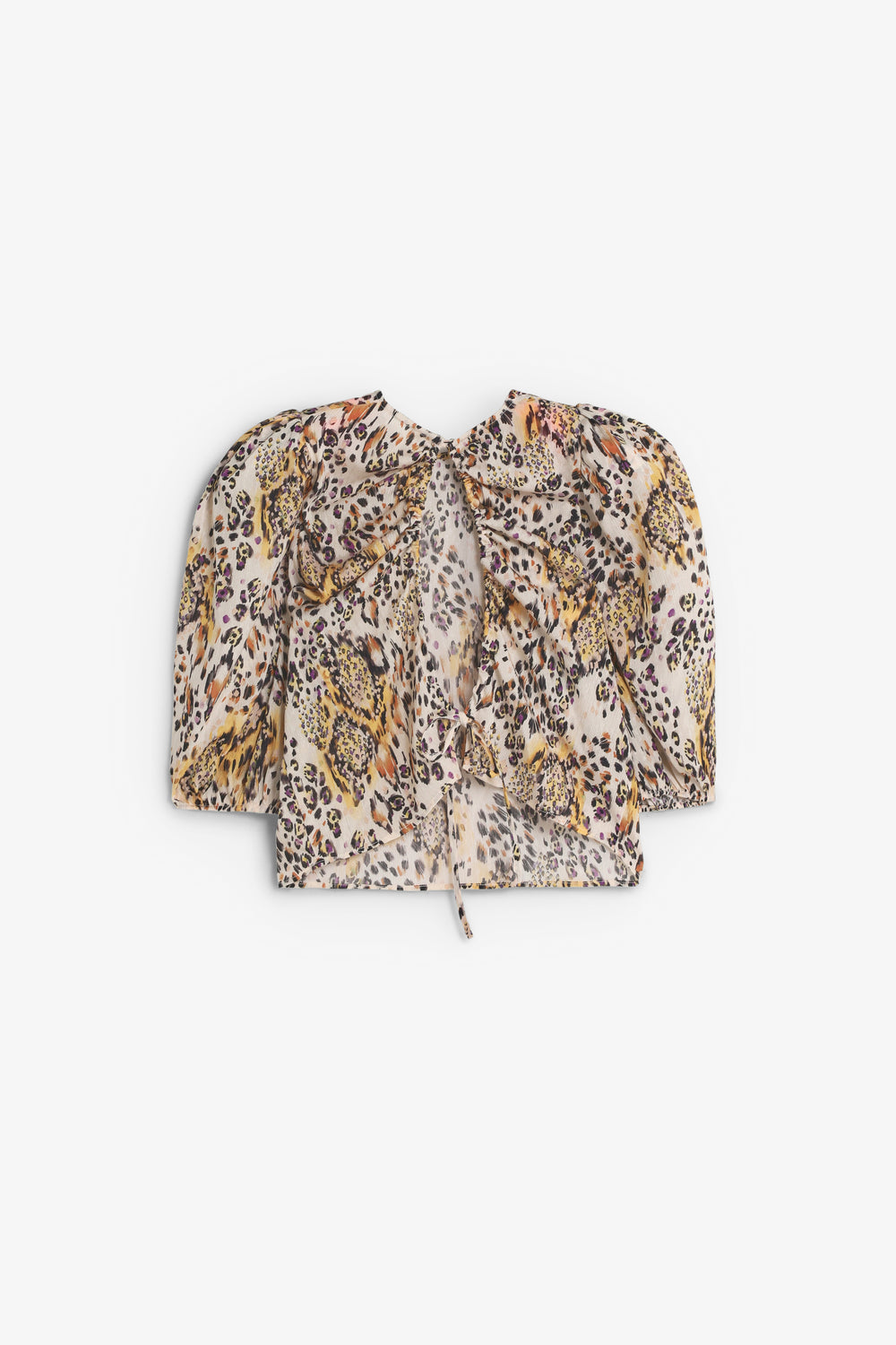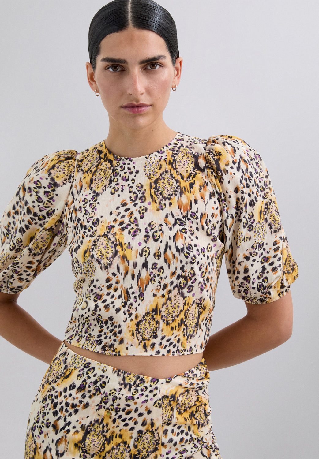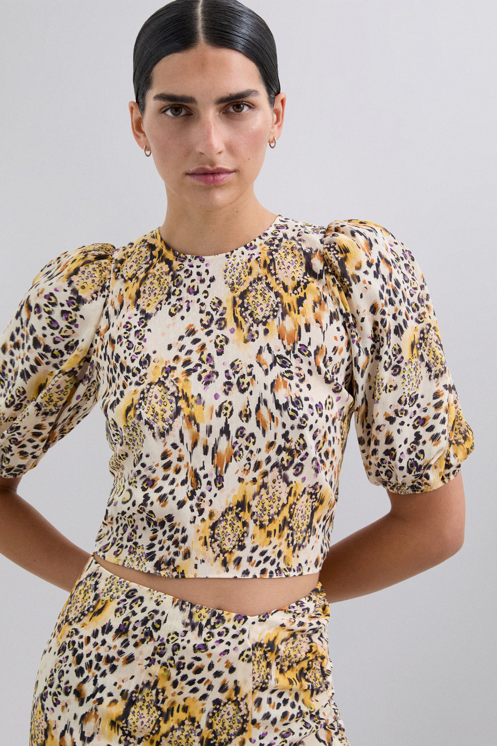 Top animal print. Cuello redondo y manga corta ligeramente abullonada. Espalda con cierre lazo.