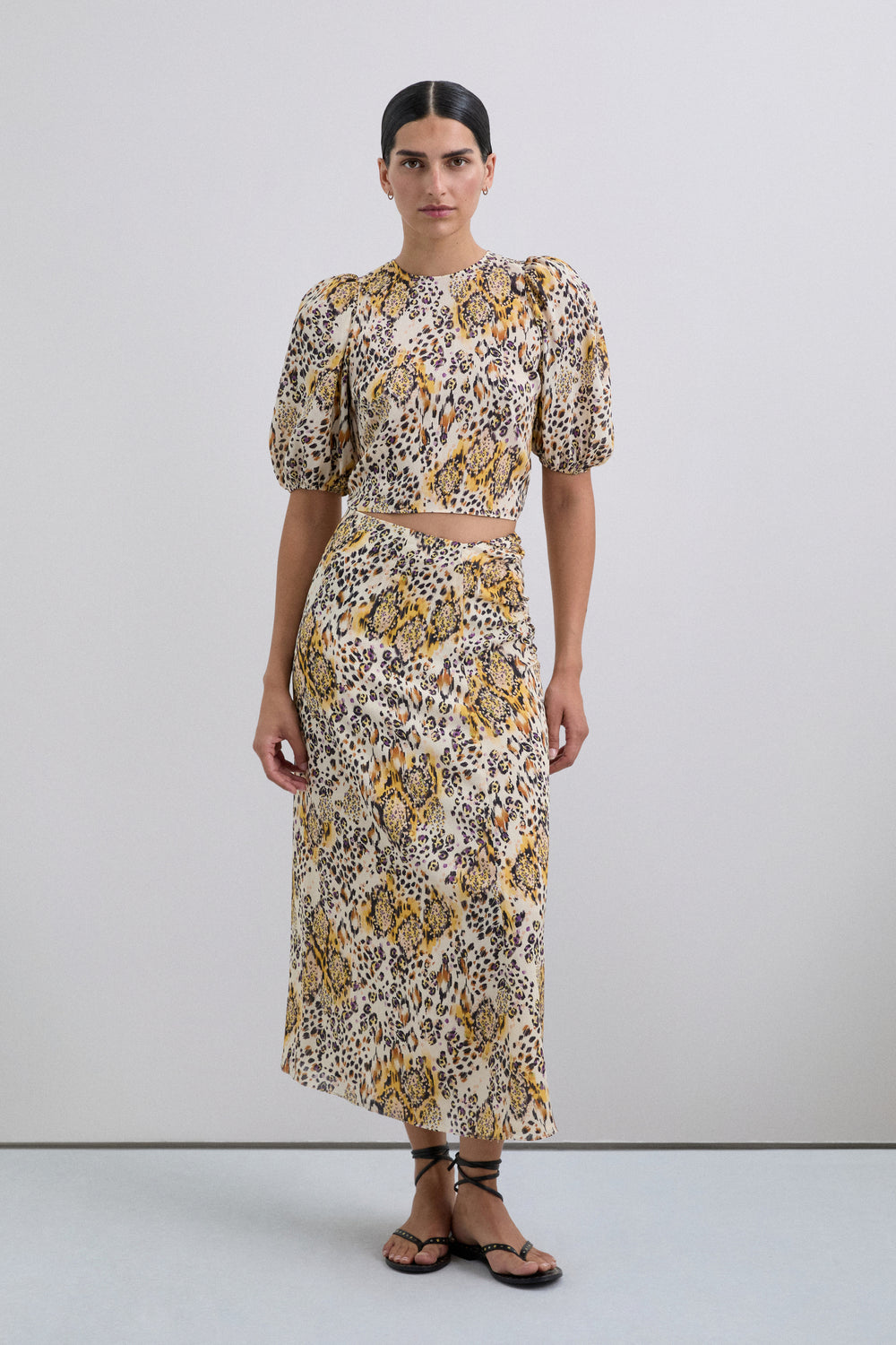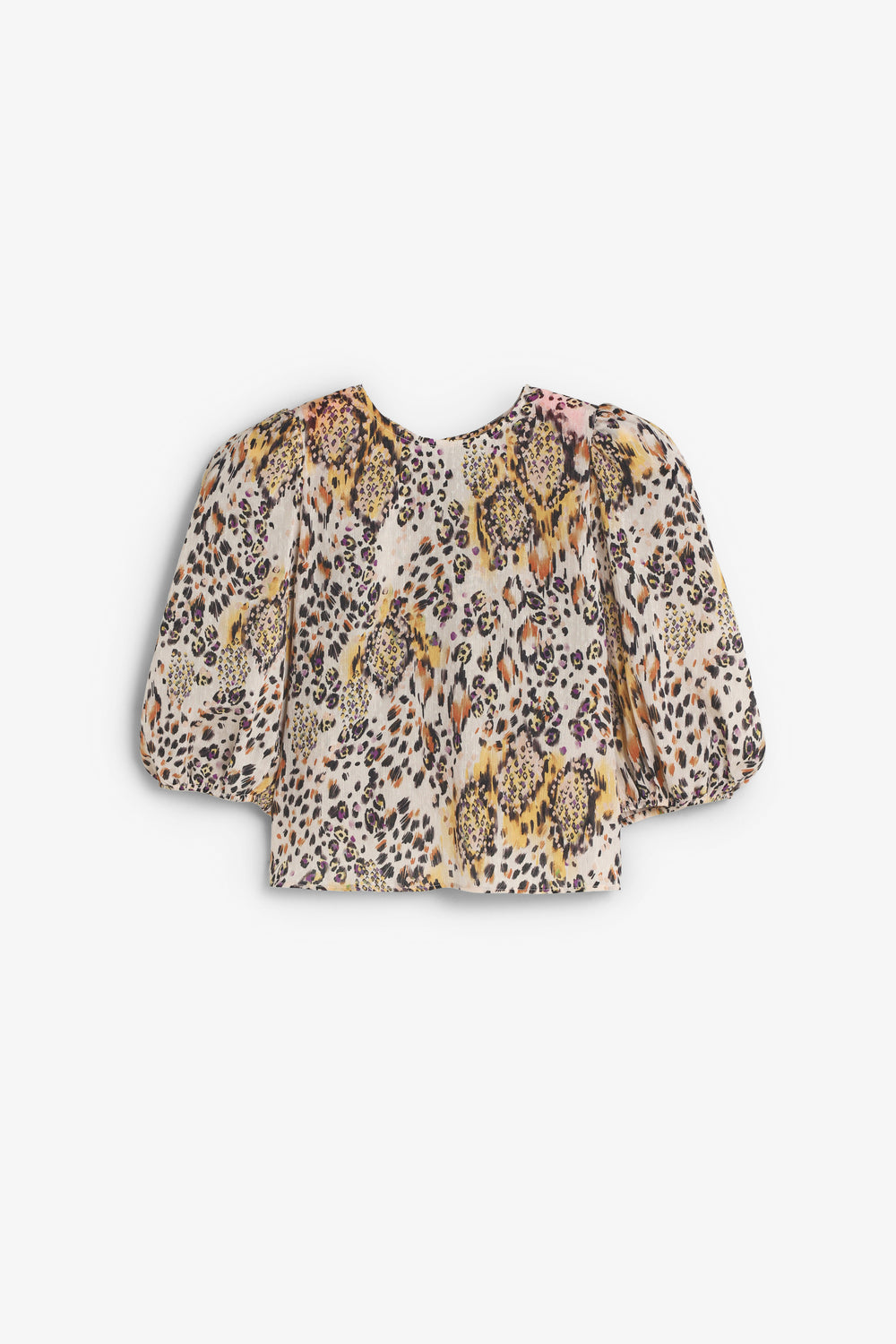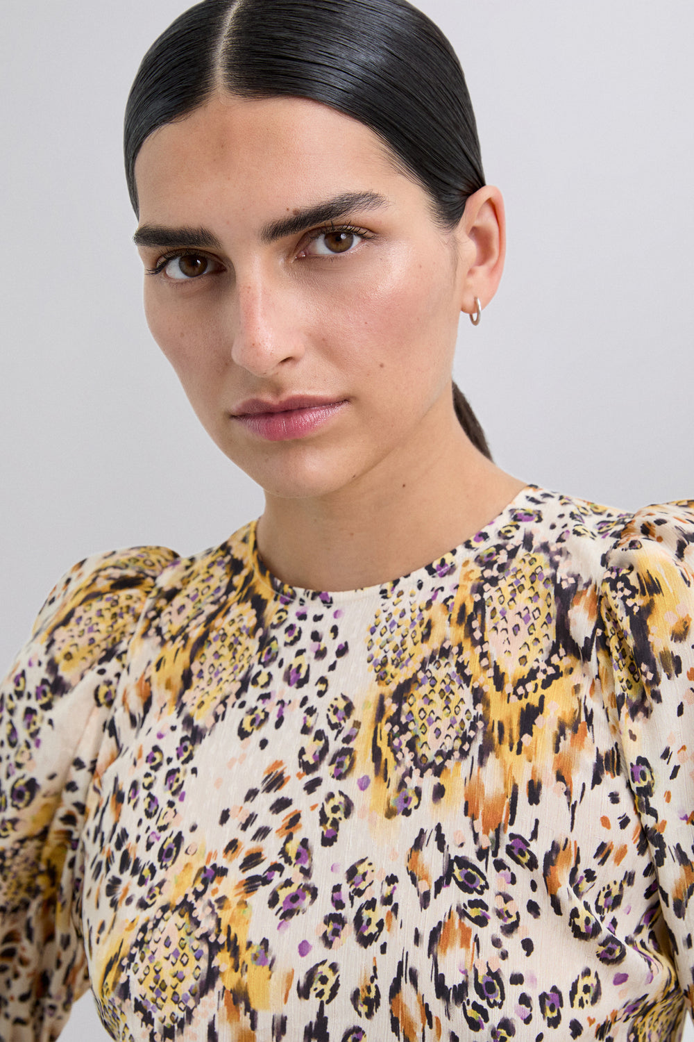 Top animal print. Cuello redondo y manga corta ligeramente abullonada. Espalda con cierre lazo.