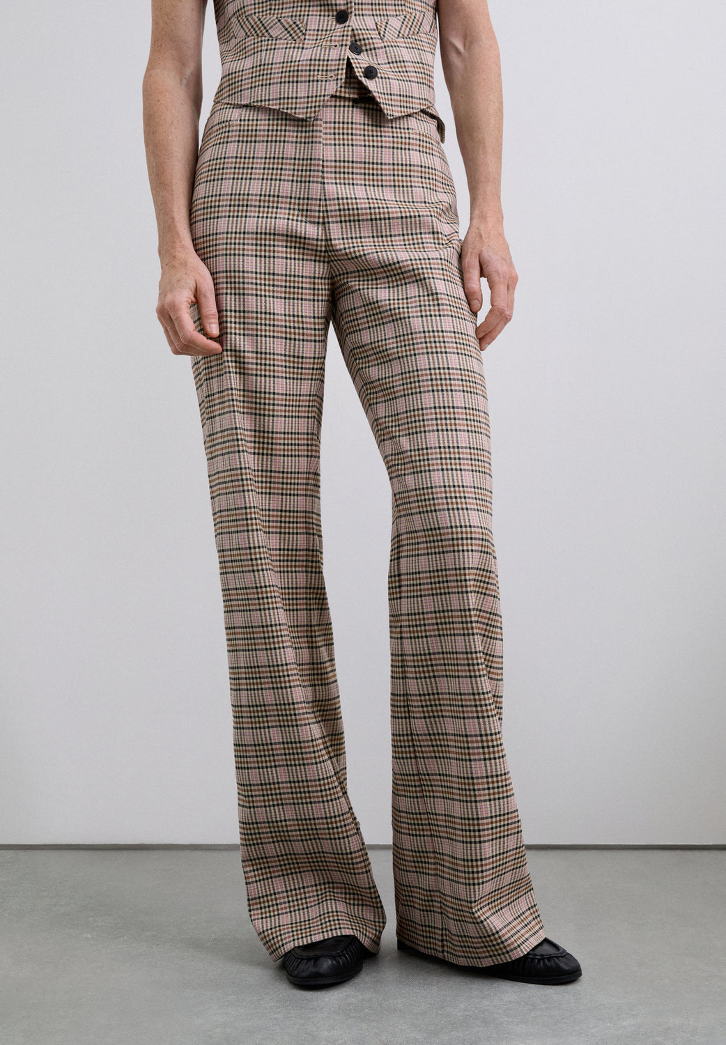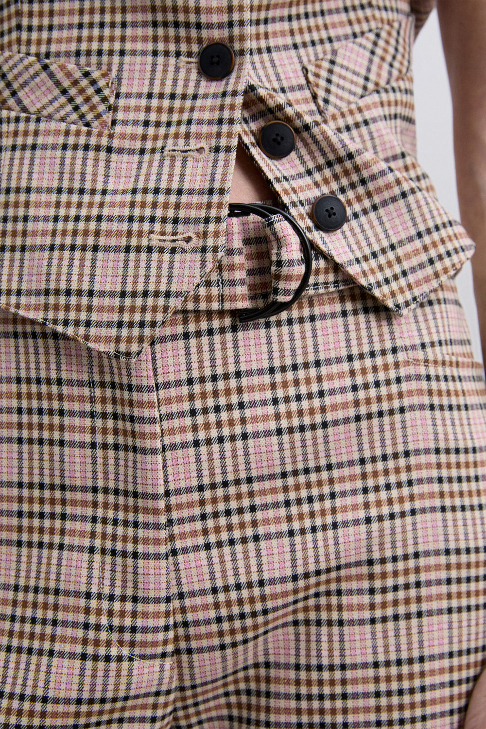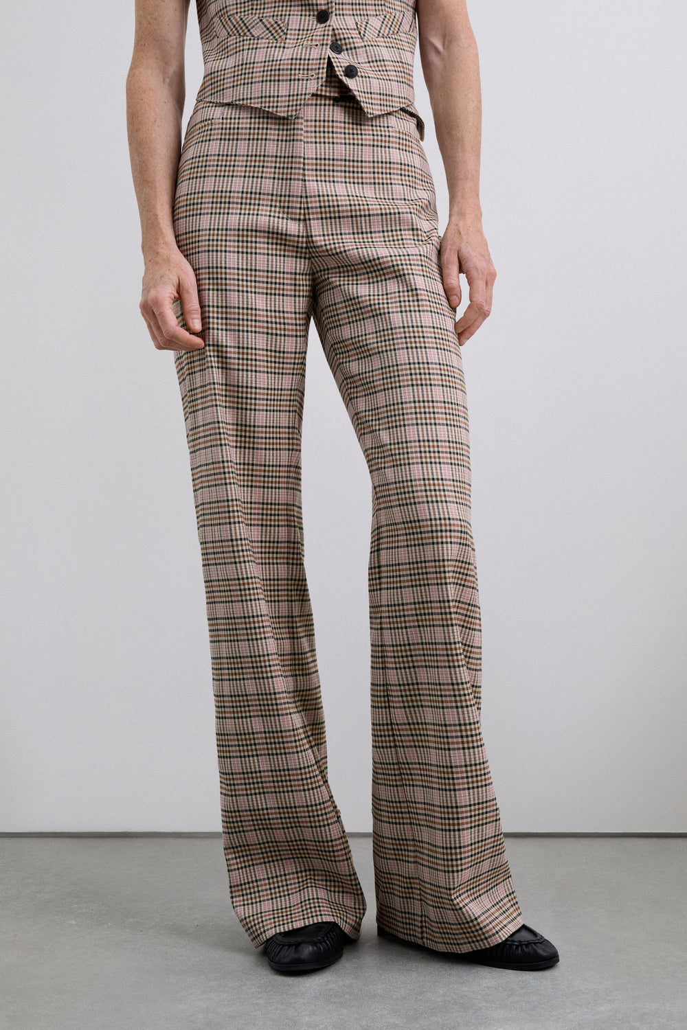Pantalones de campana. Bolsillos frontales. Bolsillo con solapa en la parte posterior. Trabillas en cintura. Estampado de cuadros.