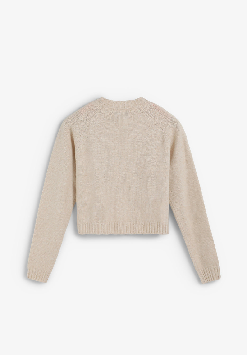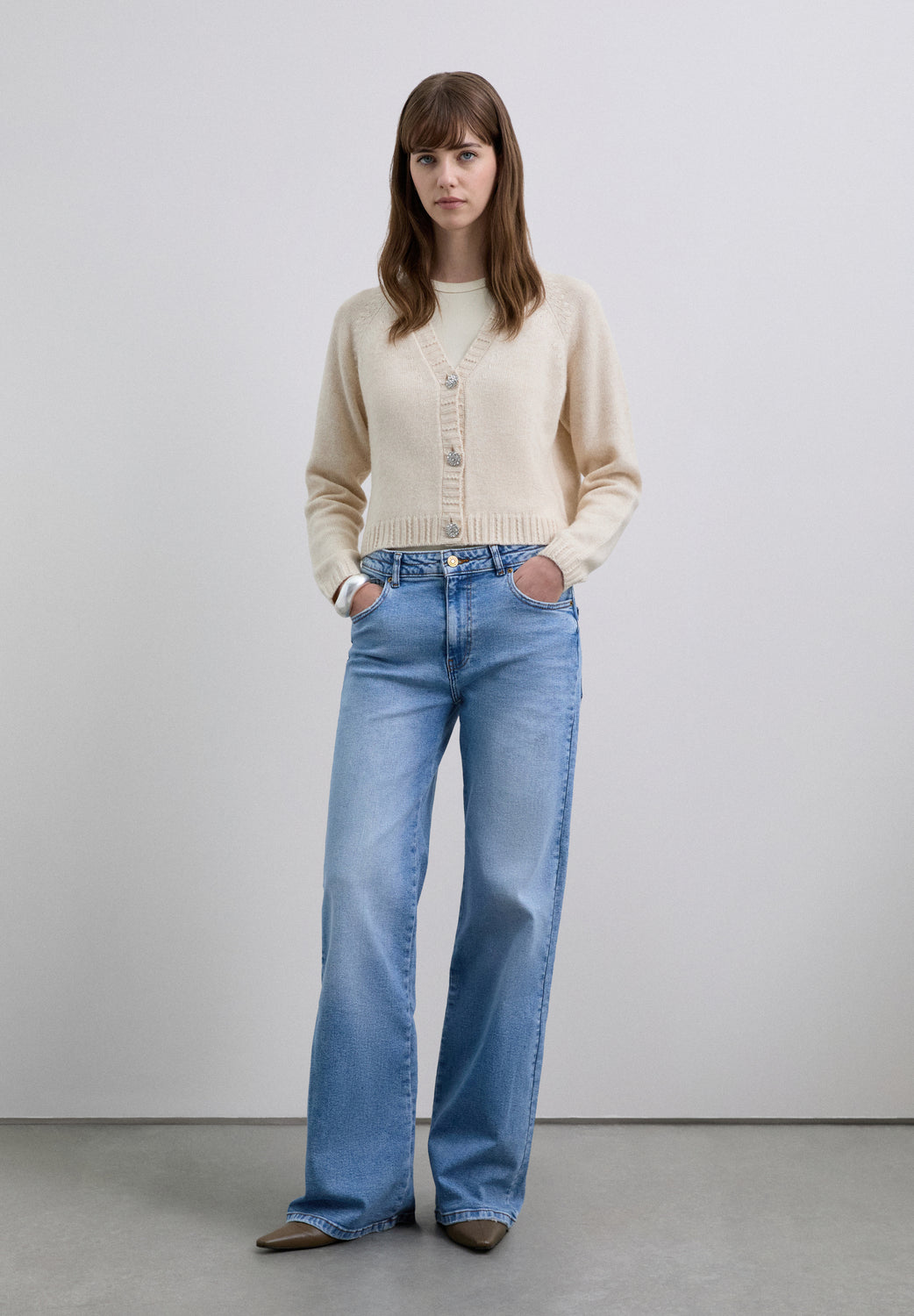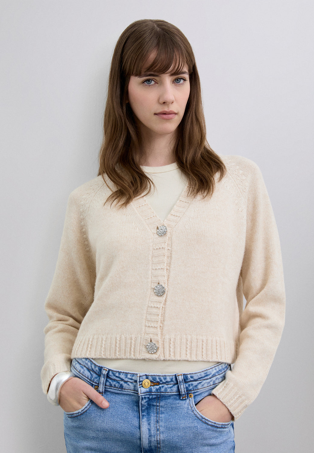 Cárdigan con escote en V y manga larga, de corte ligeramente cropped y silueta cuadrada. El escote, los puños y el bajo presentan acabado acanalado. Cierre frontal con botones adornados con strass.