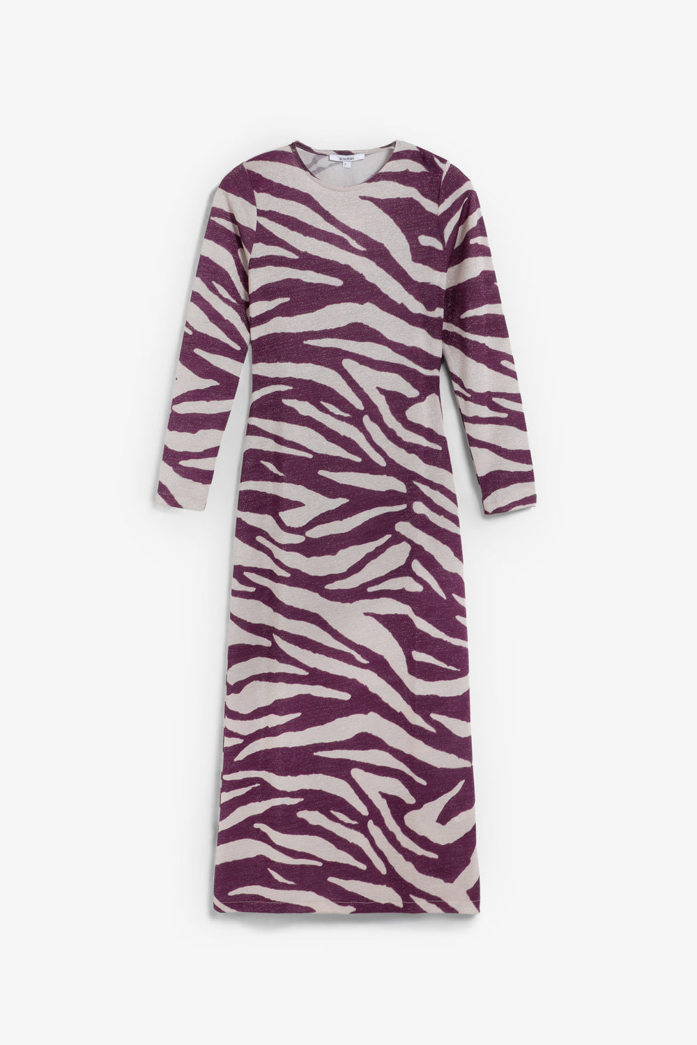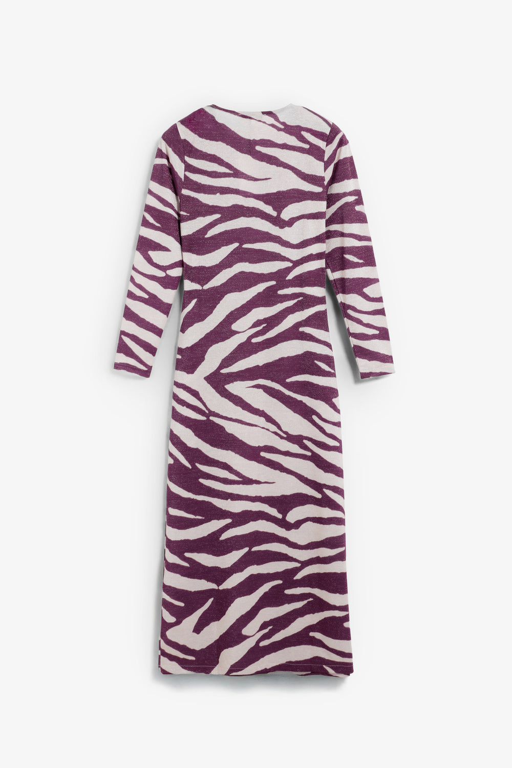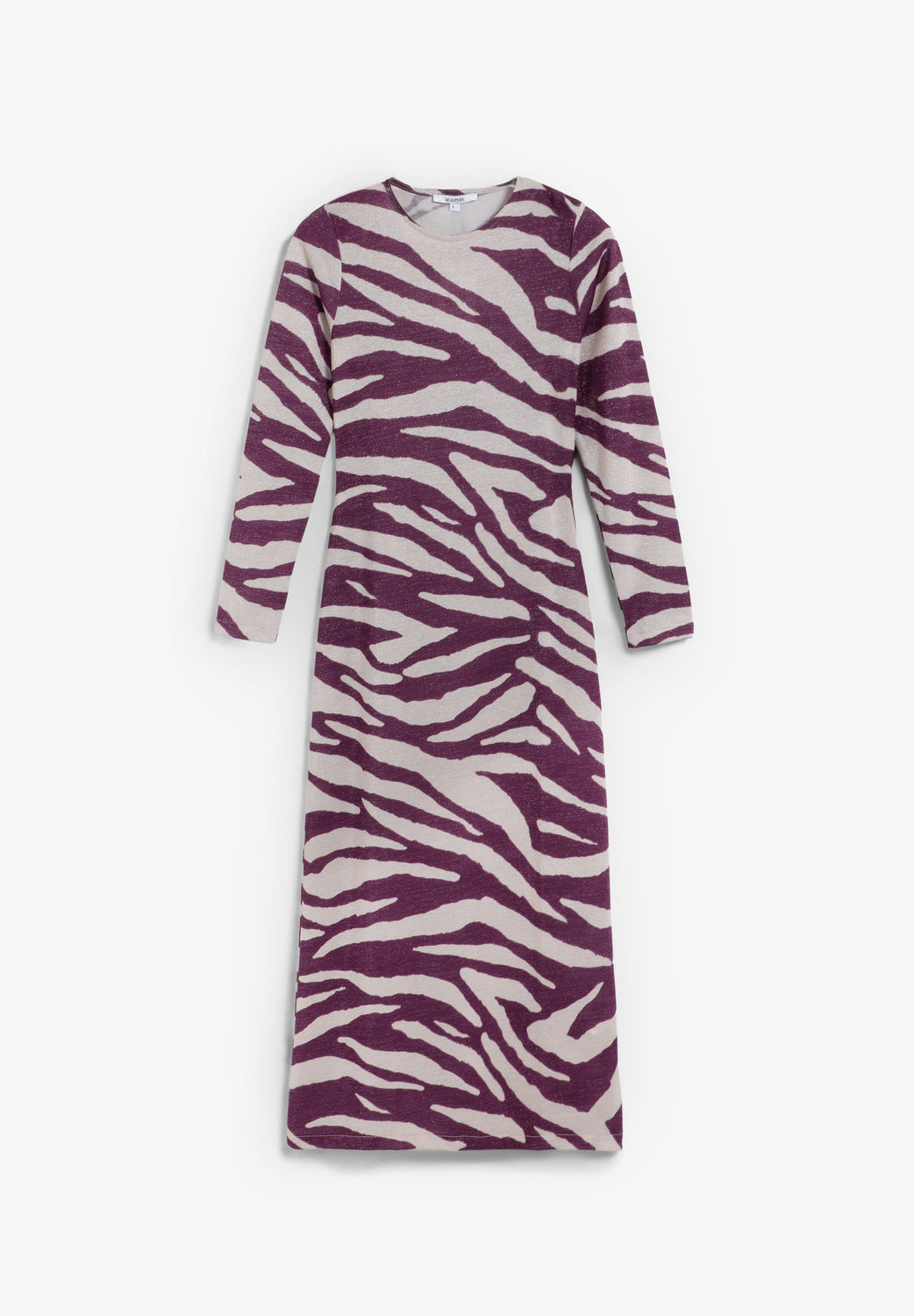 Vestido largo confeccionado en punto fino de lúrex ligeramente elástico. Estampado animal print. Cuello redondo y manga larga.