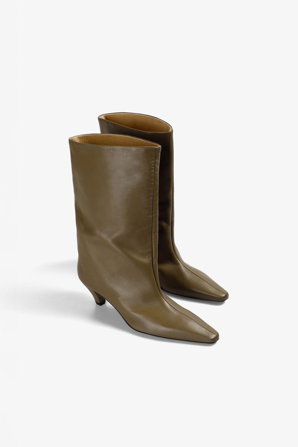 Bota confeccionada en 100% piel. Detalle de caña fruncida. Tacón Kitten medio. Acabado en punta.