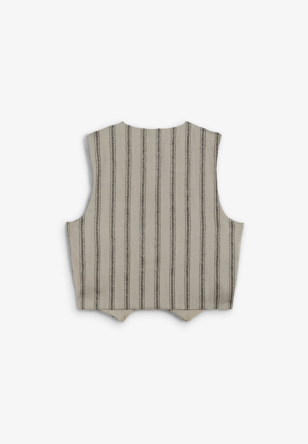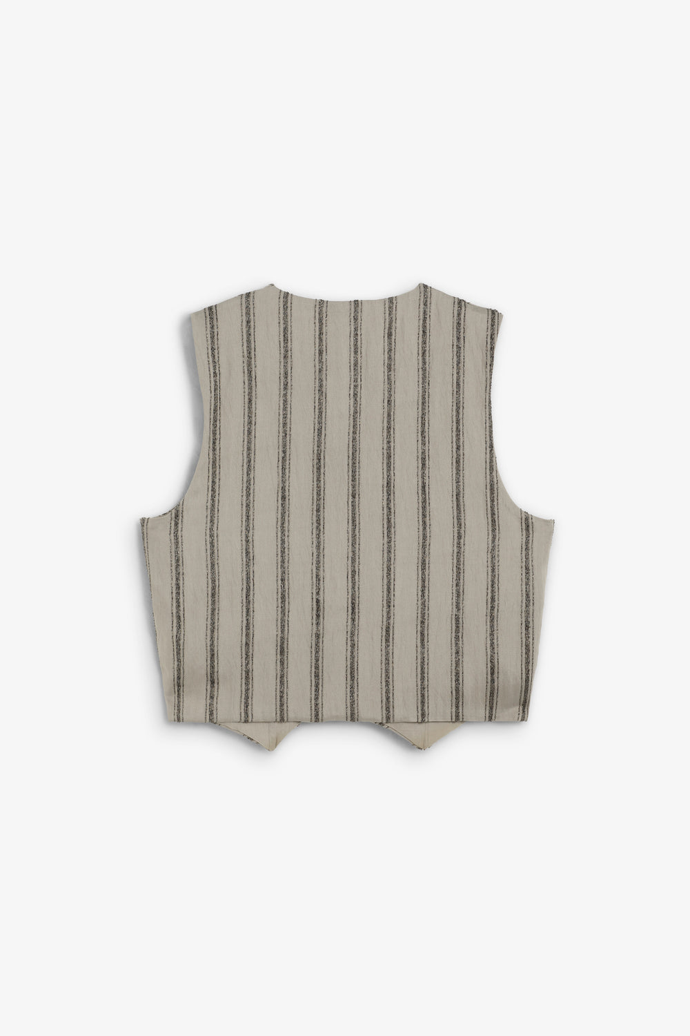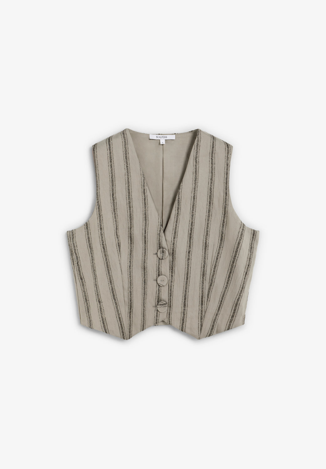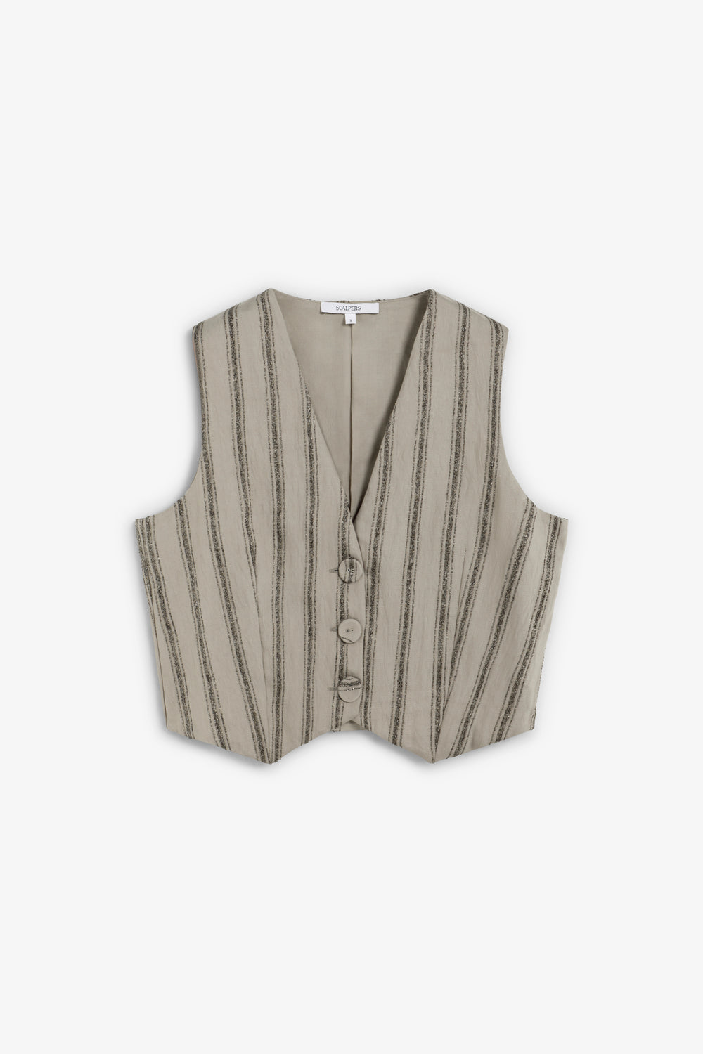 Chaleco de rayas con detalles de hilo metalizado. Confeccionado en tejido fluido. Corte Regular fit. Cierre con botones. Escote de pico. Manga en sisa.