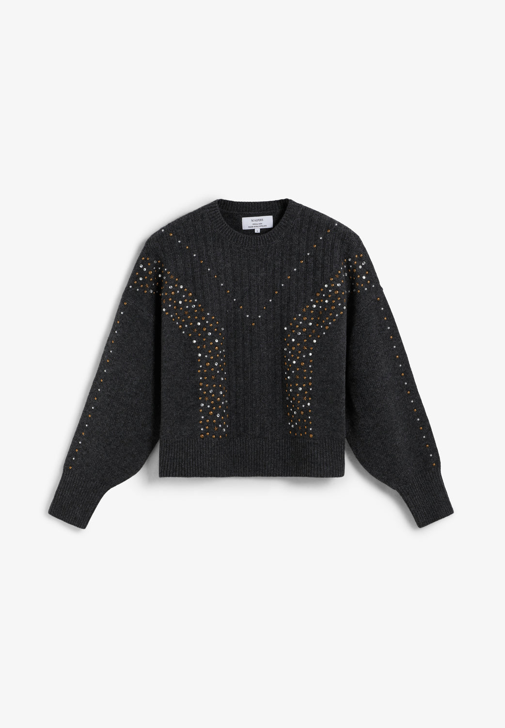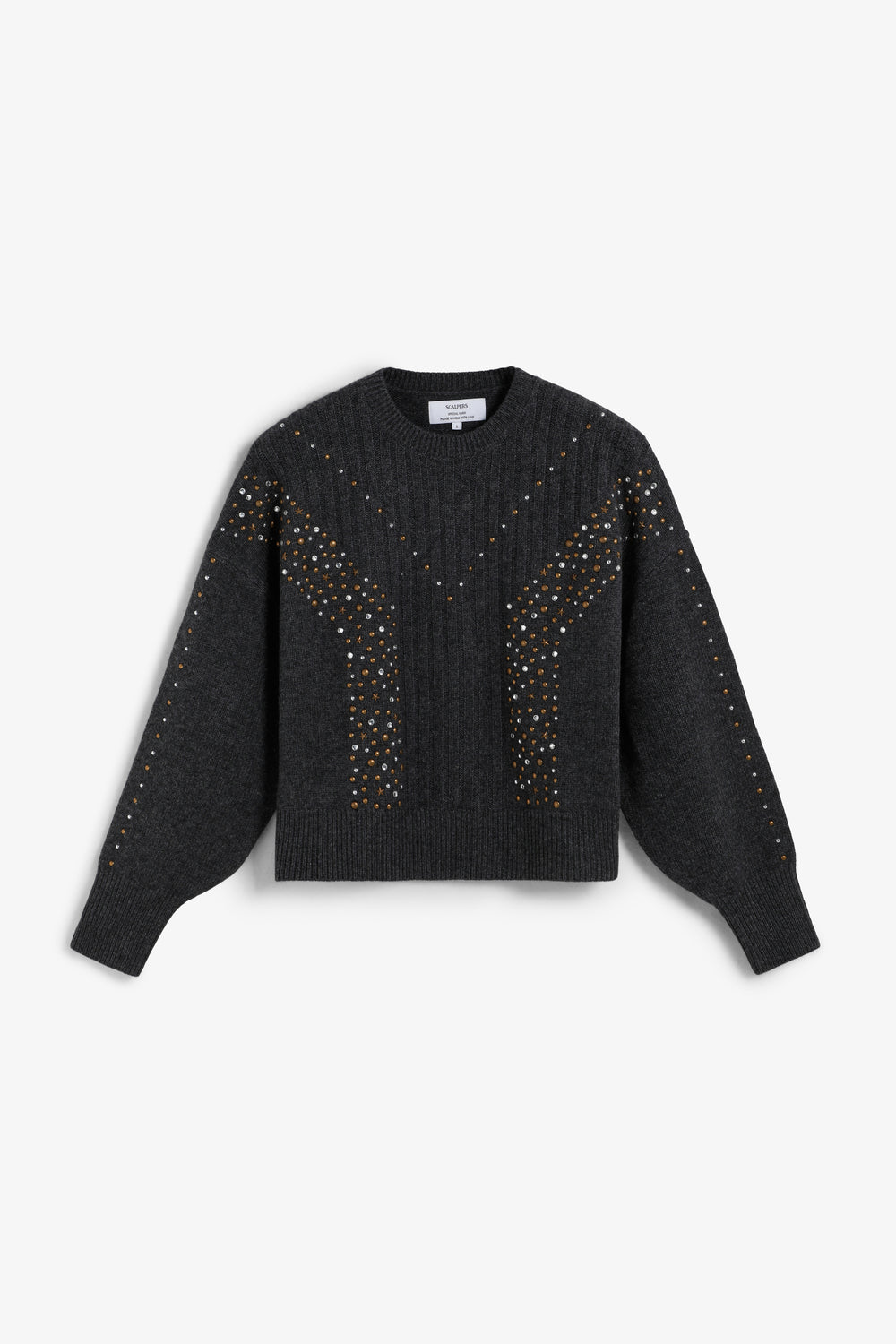 Jersey confeccionado en punto de canalé con detalles de tachuelas. Corte regular fit. Cuello redondo. Manga larga con puños acabados en rib.