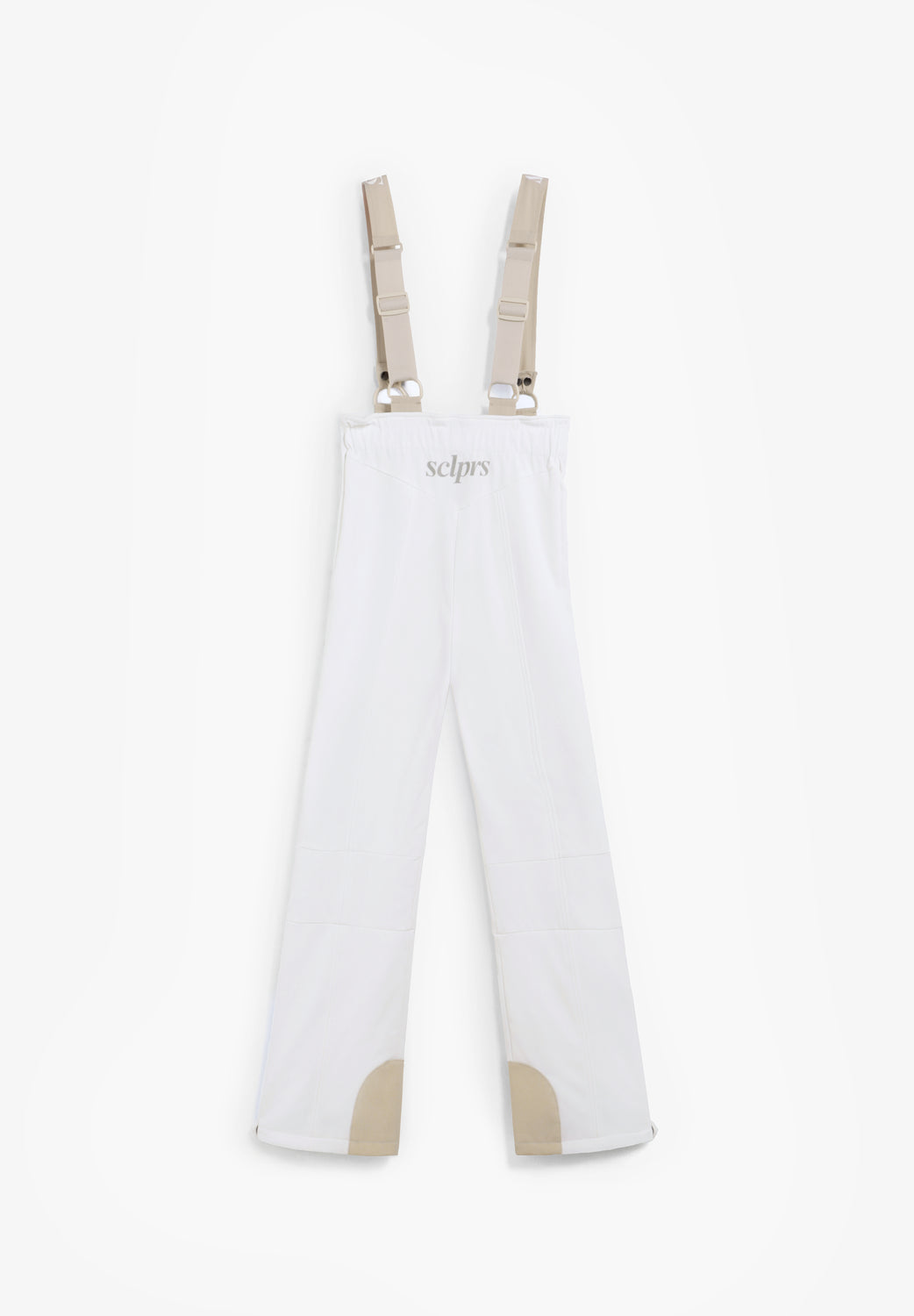 Pantalón de esquí con tirantes confeccionado en tejido técnico, de tiro alto y cierre con cremallera frontal centrada. Los tirantes son anchos y ajustables, con detalles del logo. Dispone de bolsillos delanteros con cremallera y cierre a presión. Los bajos incorporan cremalleras laterales y una capa interior ajustada. Incluye detalles a contraste.