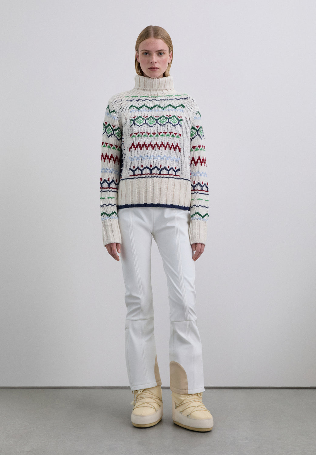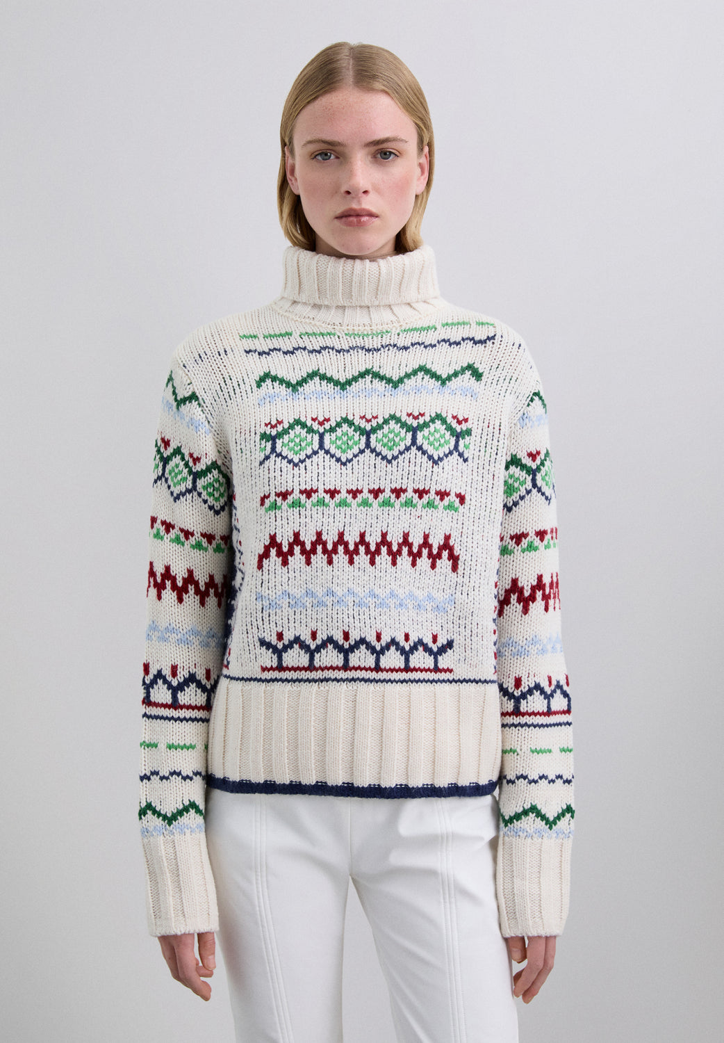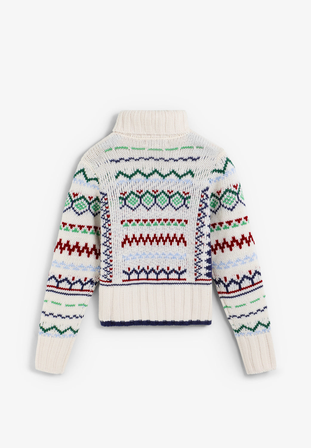 Jersey de cuello alto y manga larga, confeccionado en mezcla de lana. Presenta puños, cuello y bajo acanalados. Diseño de punto con estampado multicolor.