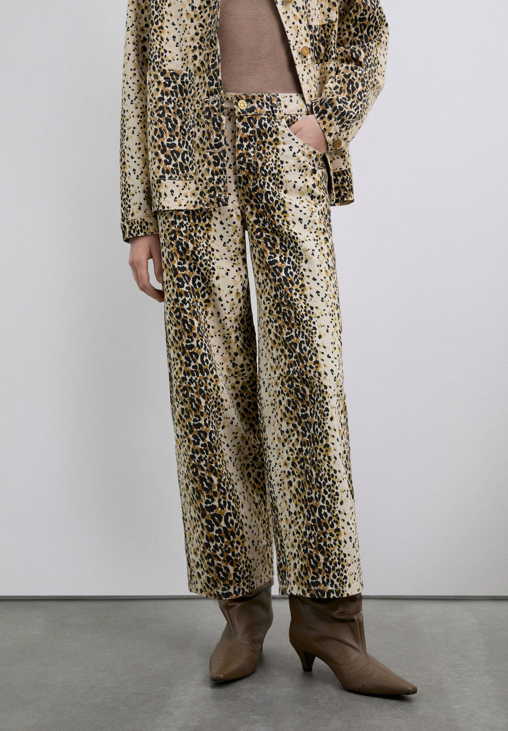 Pantalón confeccionado en algodón con estampado animal print. Corte culotte. Detalle de botón en dorado. Bolsillos en parte delantera y atrás.