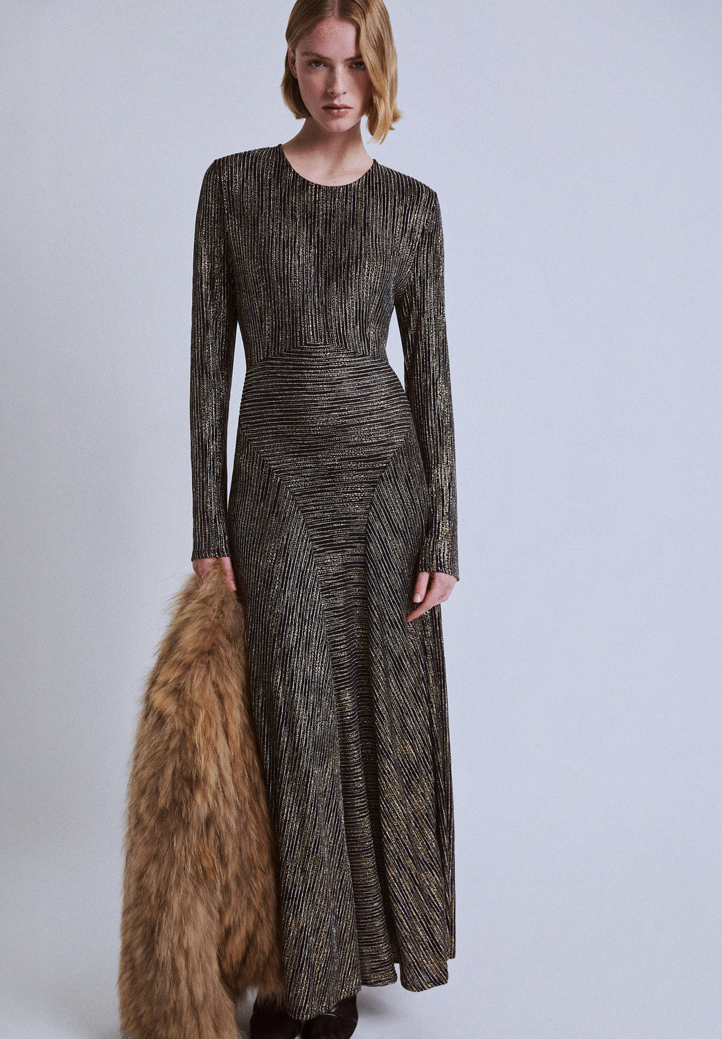 Vestido confeccionado en tejido fluido ligeramente elástico con estampado de rayas con hilo metalizado. Corte slim fit. Cuello redondo. Manga larga. Corte frontal con panel.