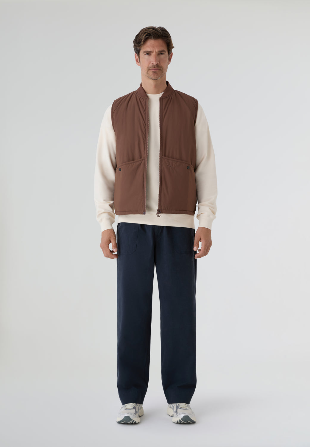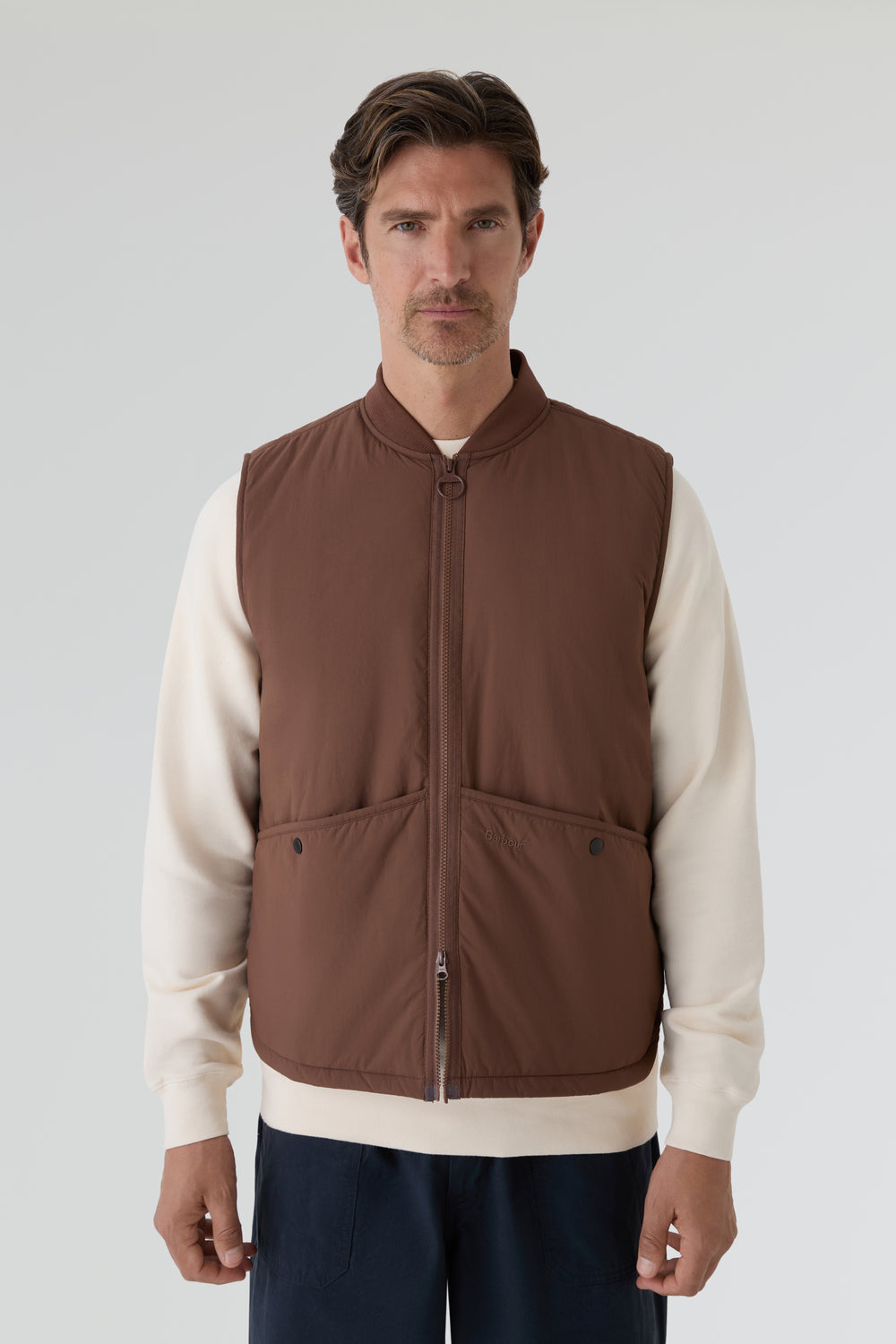 Chaleco Barbour confeccionado en tejido 100% poliamida con bolsillos delanteros y cierre de cremallera. Detalle bordado en el bolsillo izquierdo.