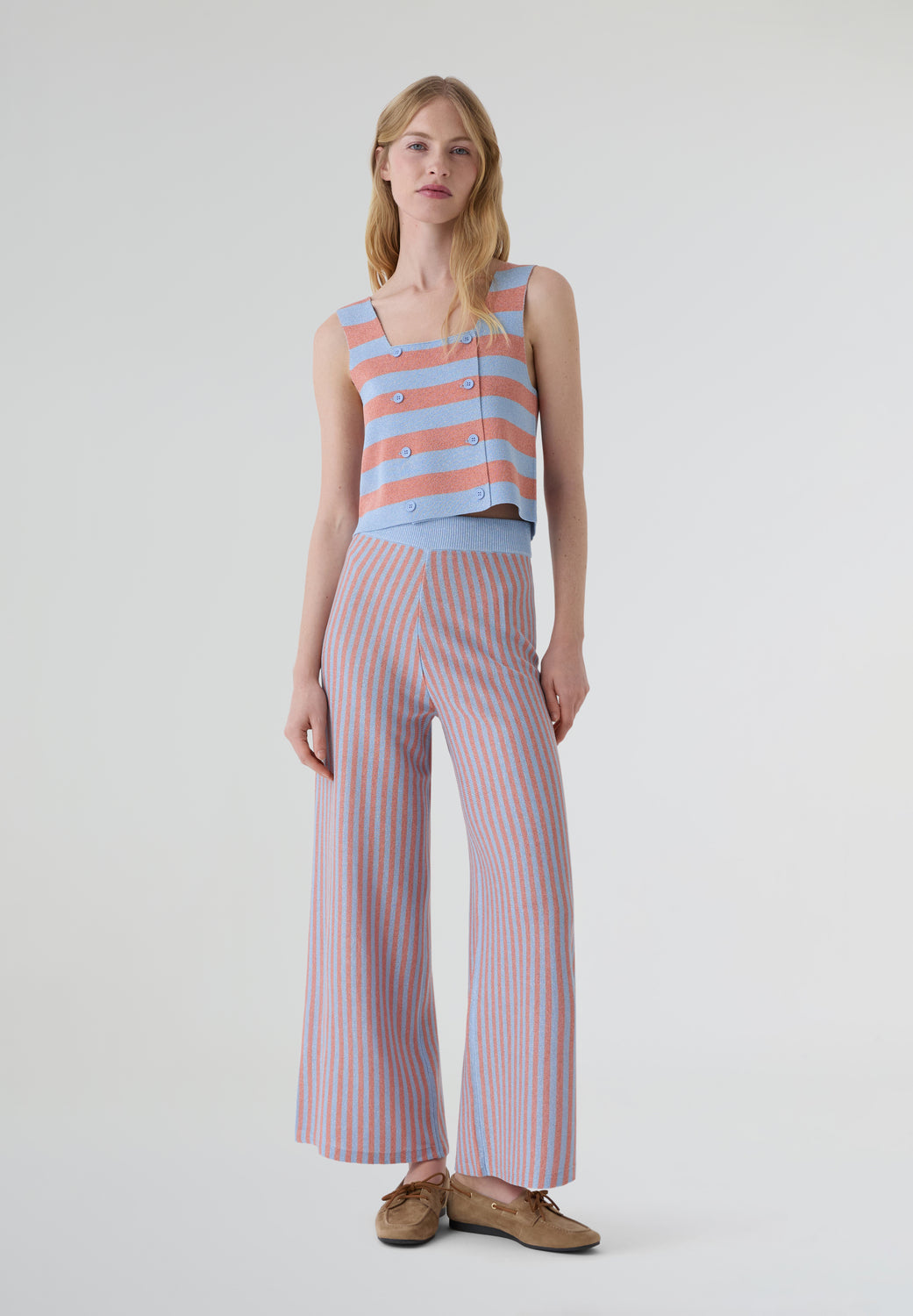 Pantalón Tiny Big Sister confeccionado en tejido viscoso con hilo metalizado a rayas y cinturilla elástica.