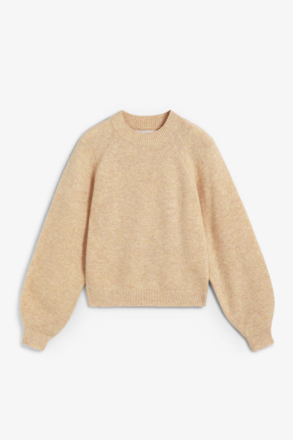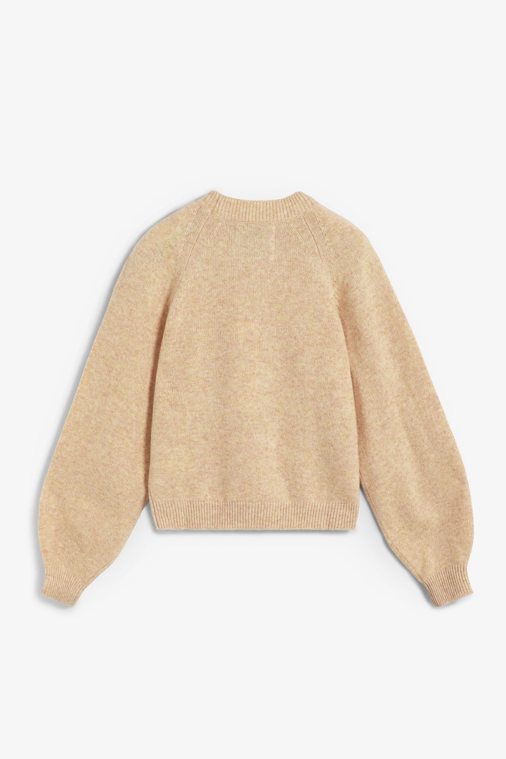 Jersey Bellerose confeccionado en 80% lana y 20% poliamida. Presenta un ajuste regular, cuello redondo, mangas raglán con sutiles costuras de cable, escote, puños y dobladillo acanalados y mangas globo con detalles de costura en los puños.