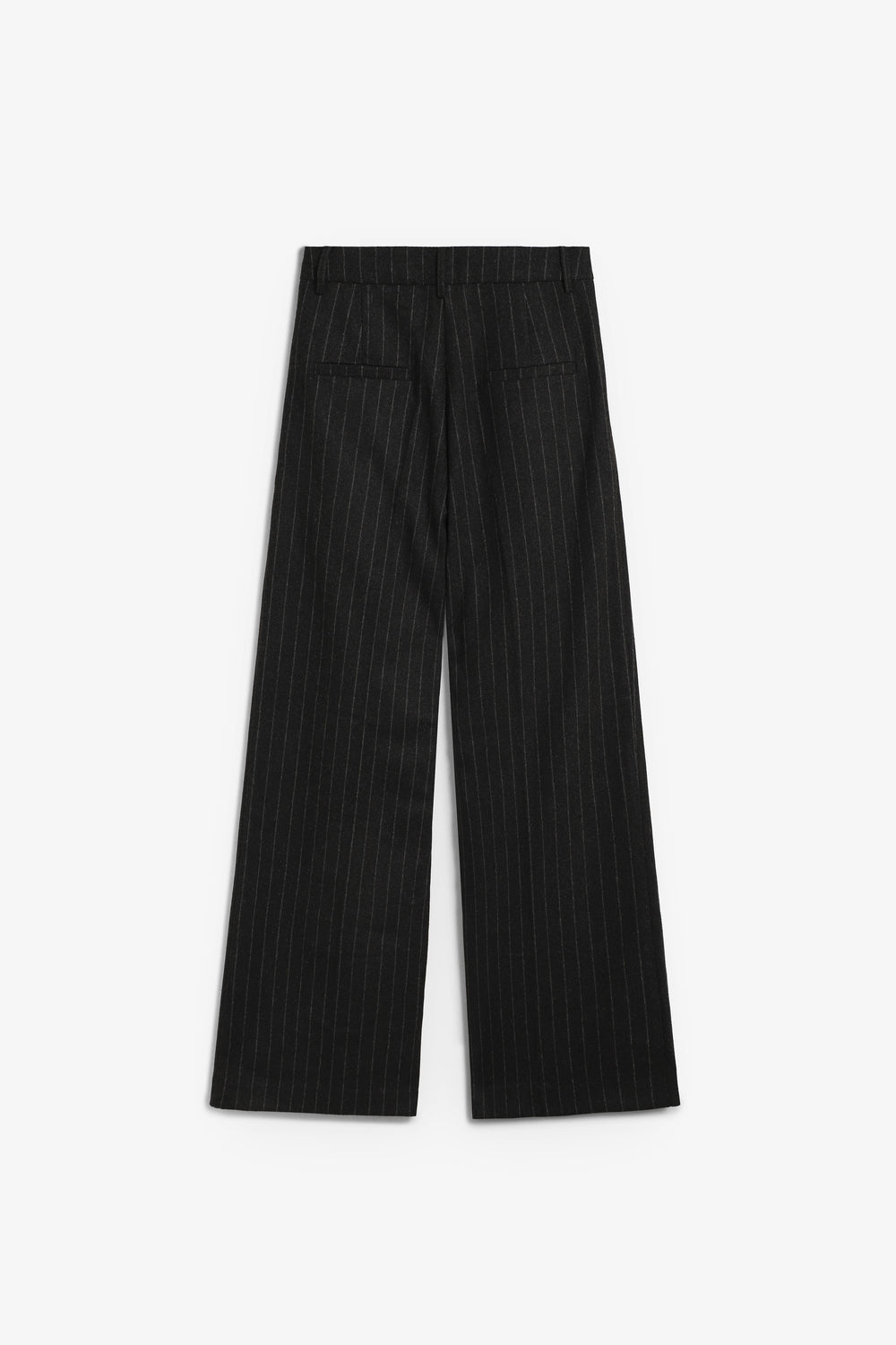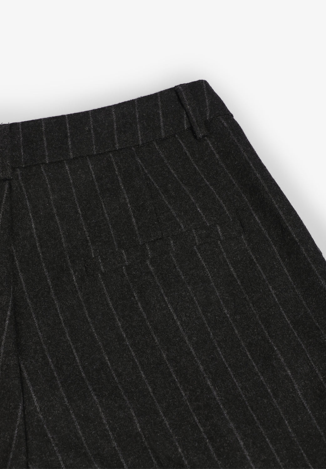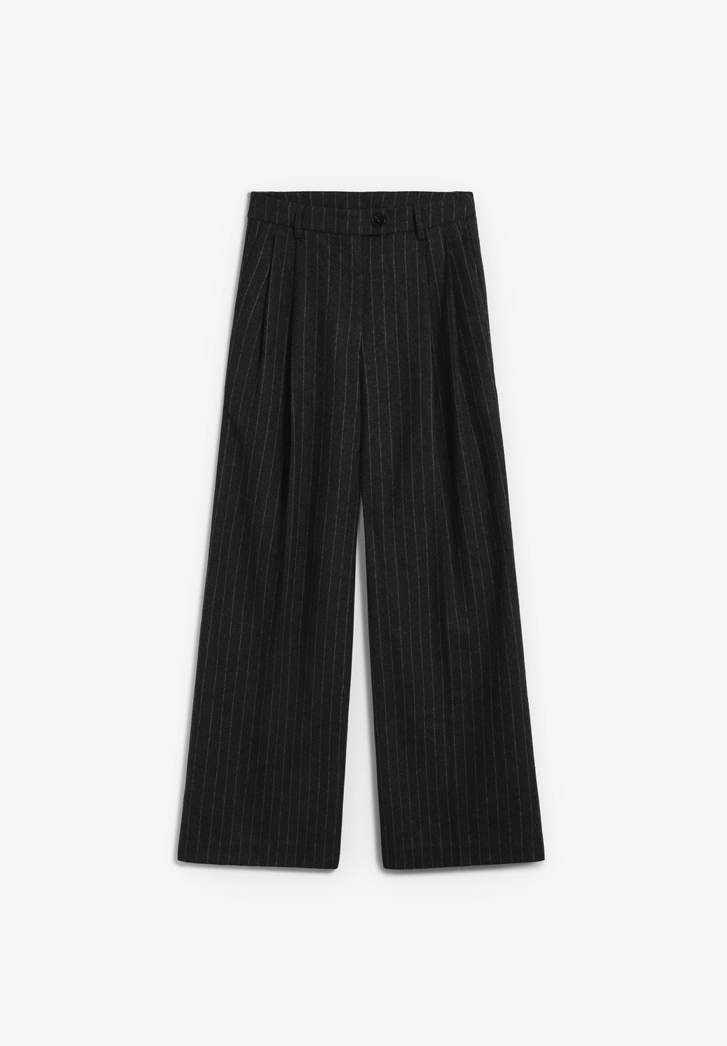 Pantalón Grace & Mila confeccionado en 85% poliéster y 15% lana. Presentan una pernera ancha, diseño de rayas finas y pliegues en la parte delantera, corte recto y detalles como el botón con efecto cuerno y bolsillos italianos.