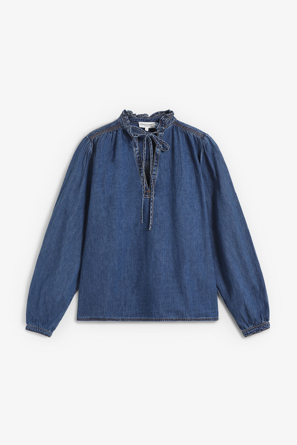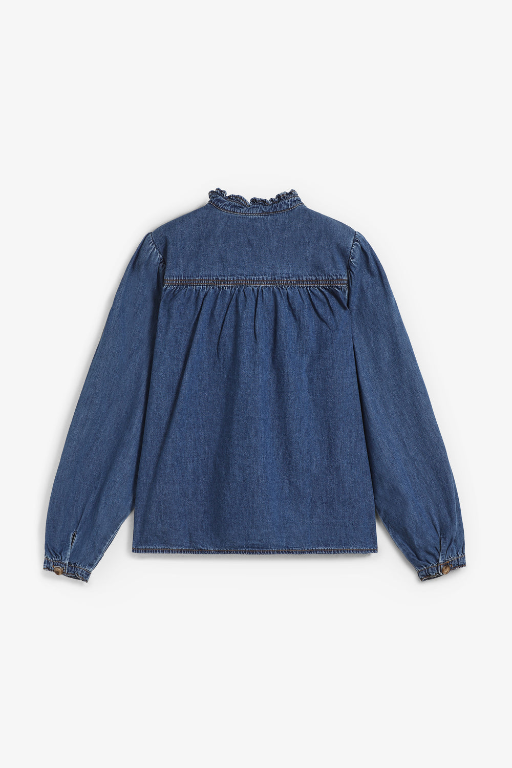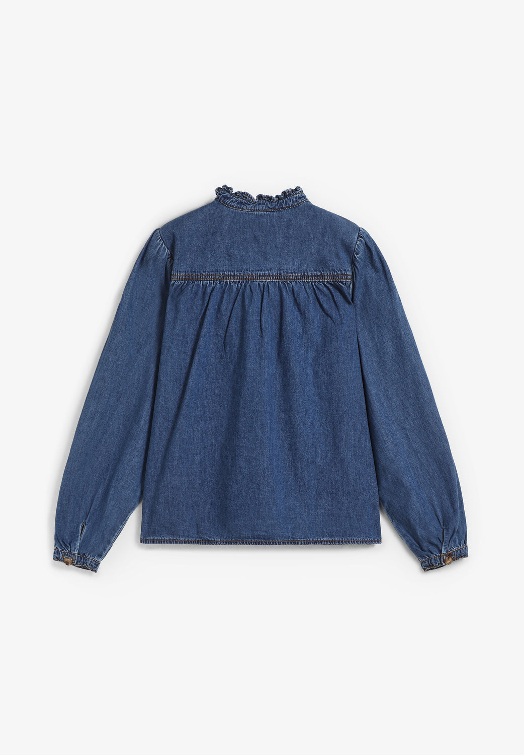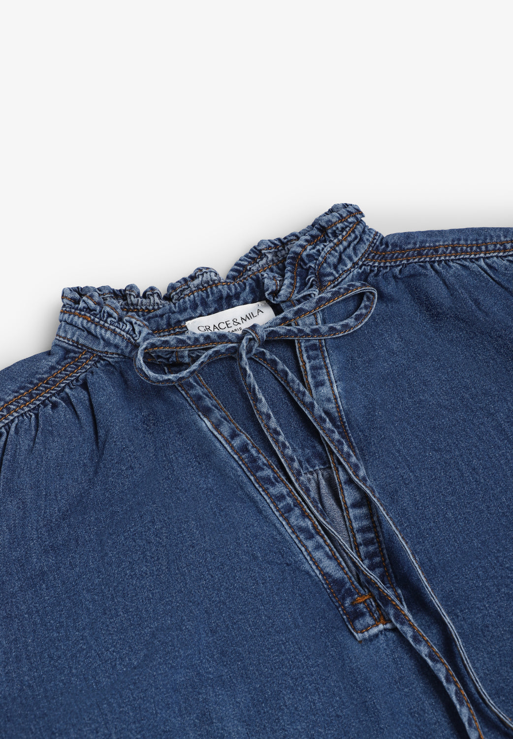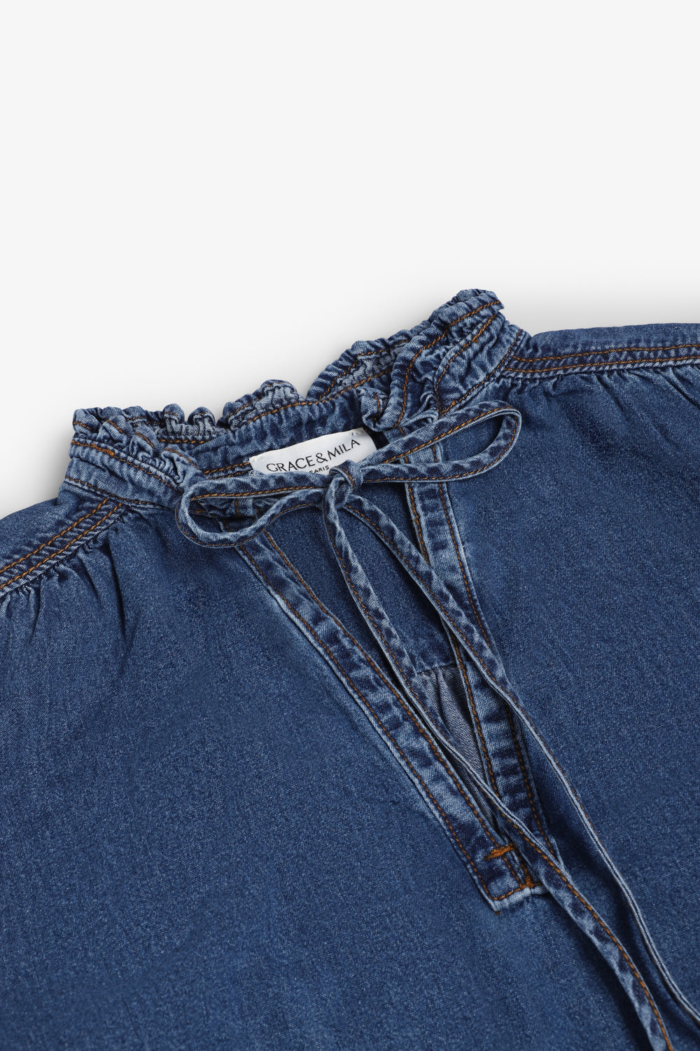 Camisa Grace & Mila en tejido denim, corte recto, cuello en V y mangas abullonadas con ribetes.