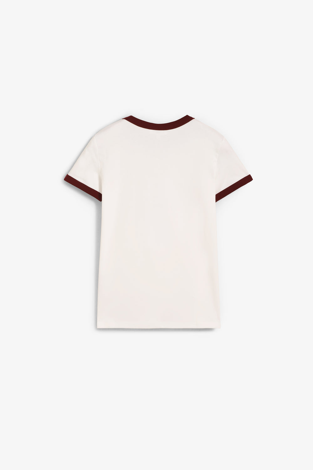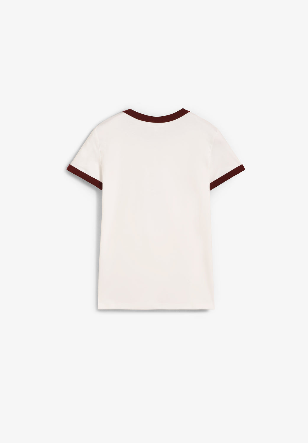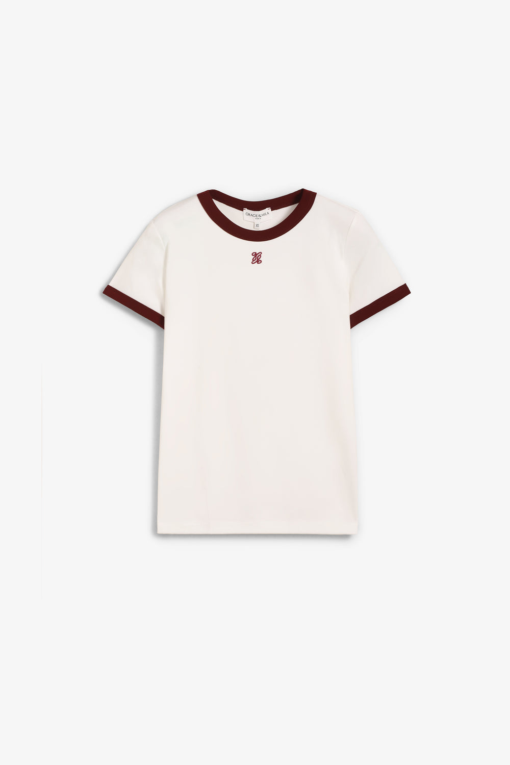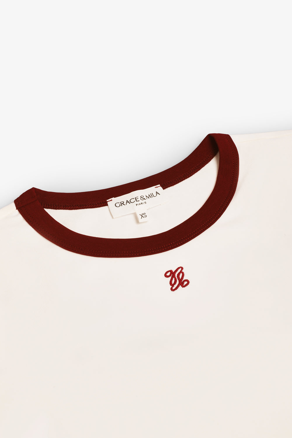 Camiseta Grace & Mila confeccionada en 92% algodón y 8% elastano. Presenta manga corta, inspiración retro y monograma G&M bordado en la parte delantera. Ribetes de colores contrastantes en el cuello y las mangas.