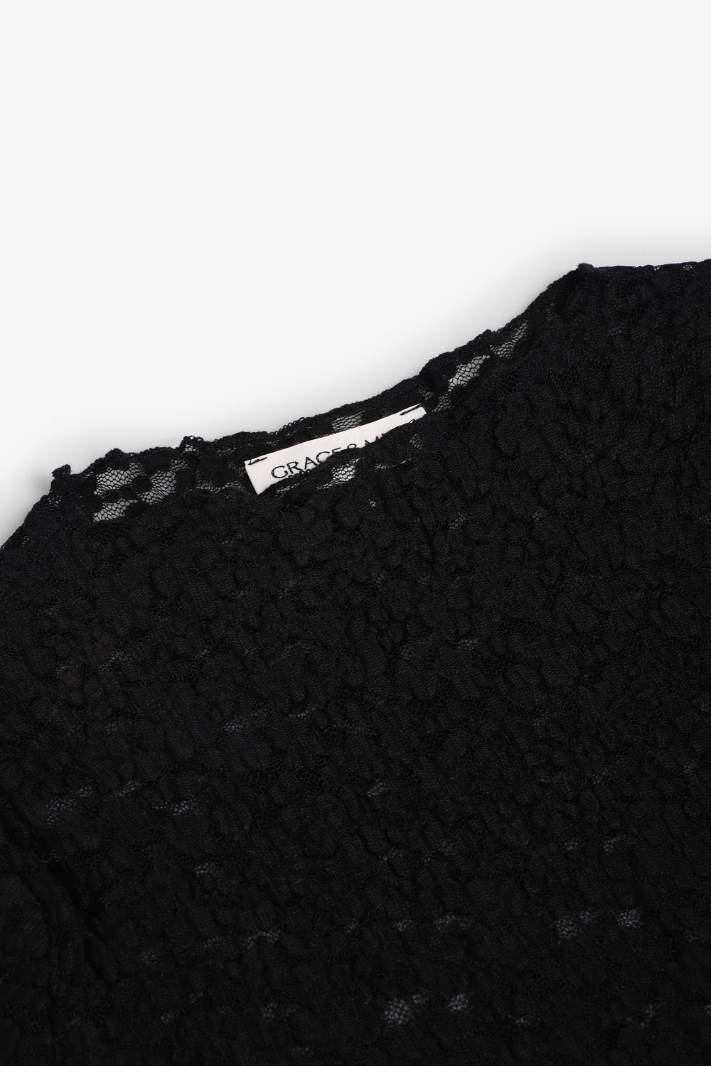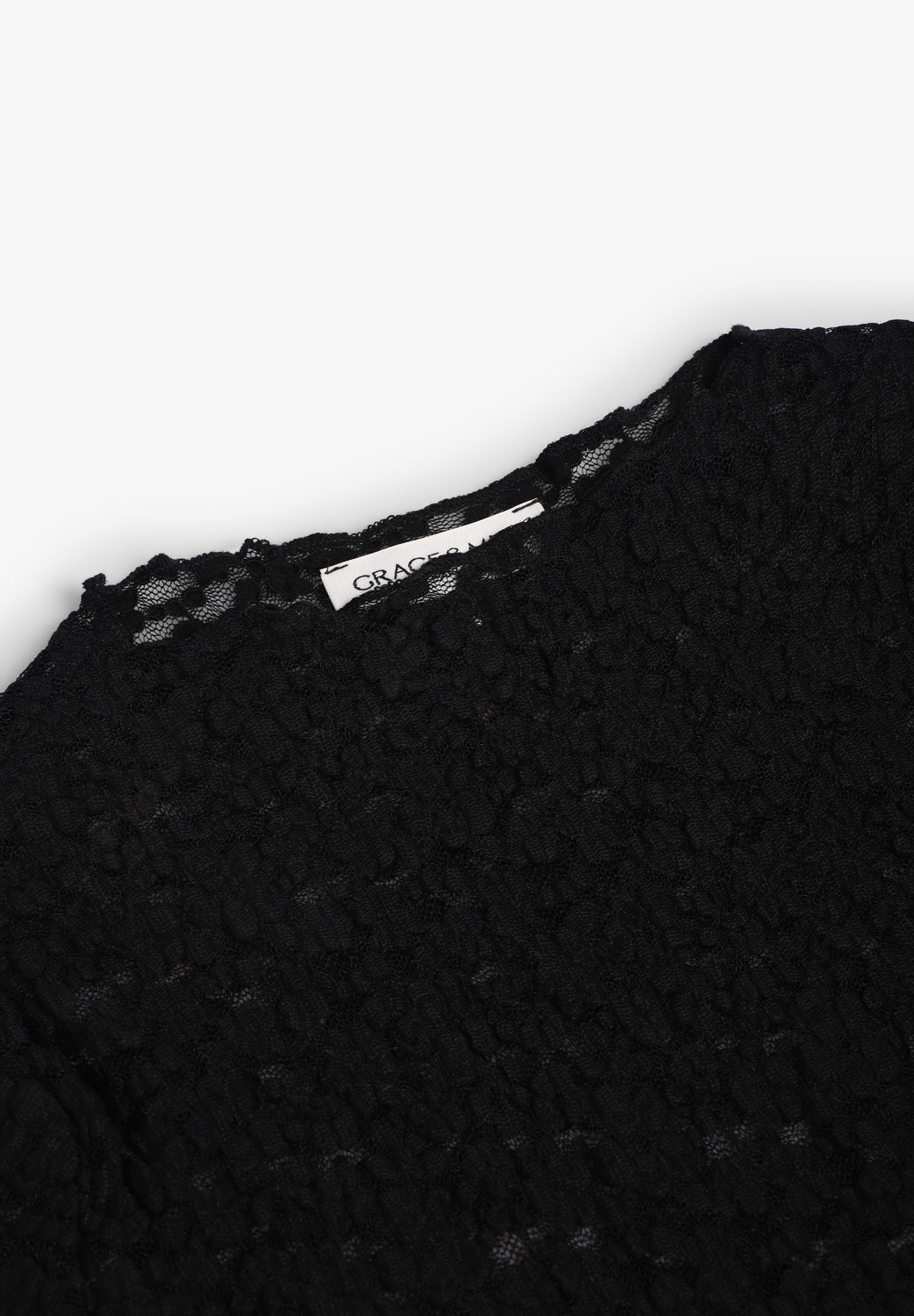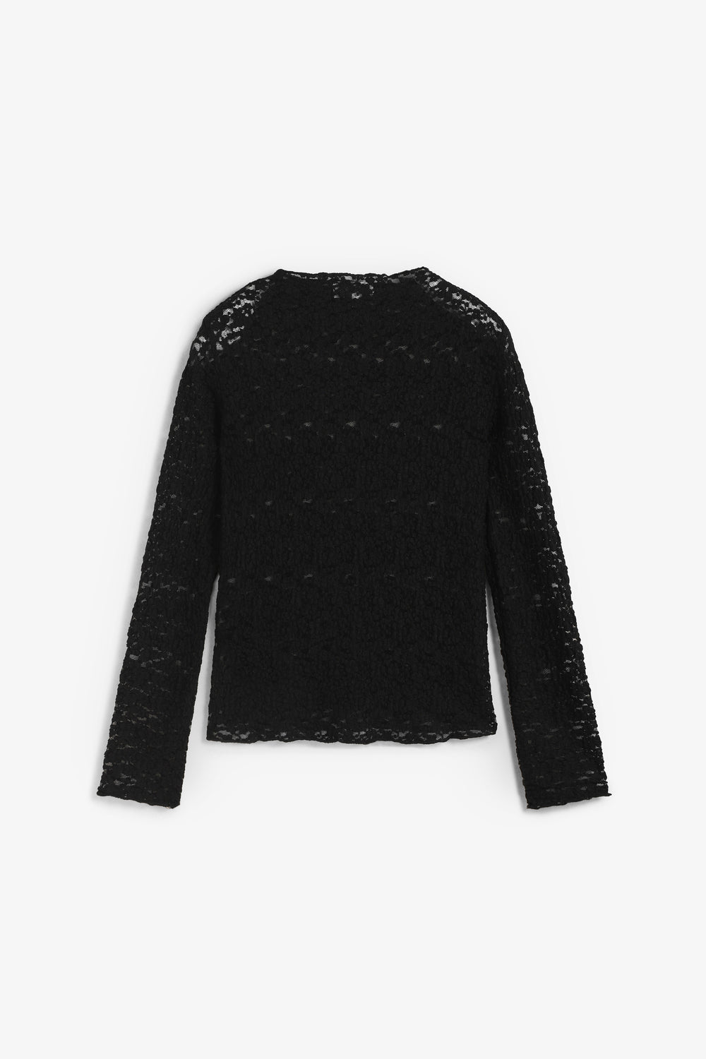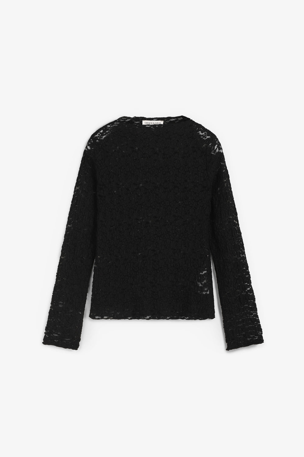 Camiseta de encaje Grace & Mila confeccionada en 60% poliamida, 30% algodón y 10% elastano. Presenta un corte ajustado, tejido transparente y escote alto con acabados ondulados.