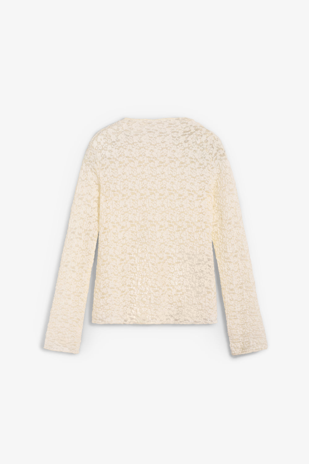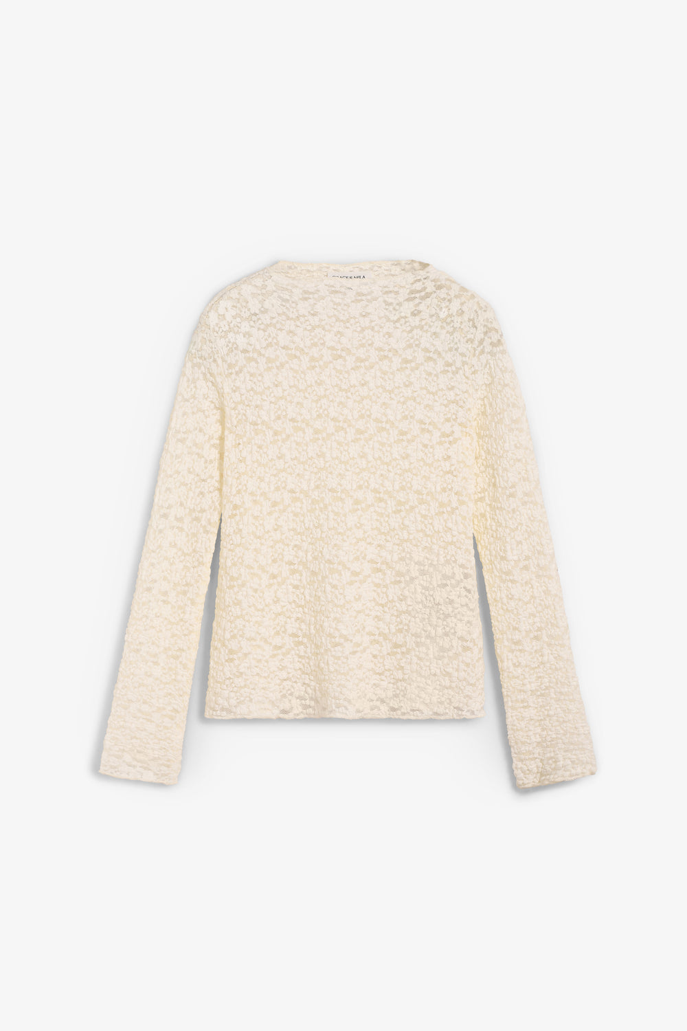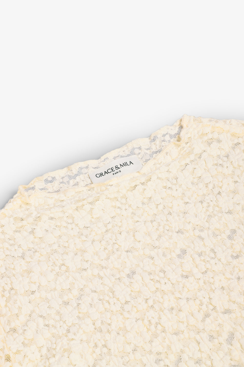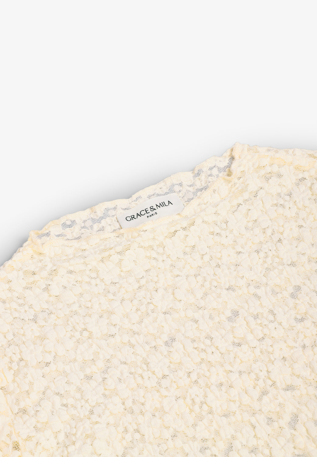 Camiseta de encaje Grace & Mila confeccionada en 60% poliamida, 30% algodón y 10% elastano. Presenta un corte ajustado, tejido transparente y escote alto con acabados ondulados.