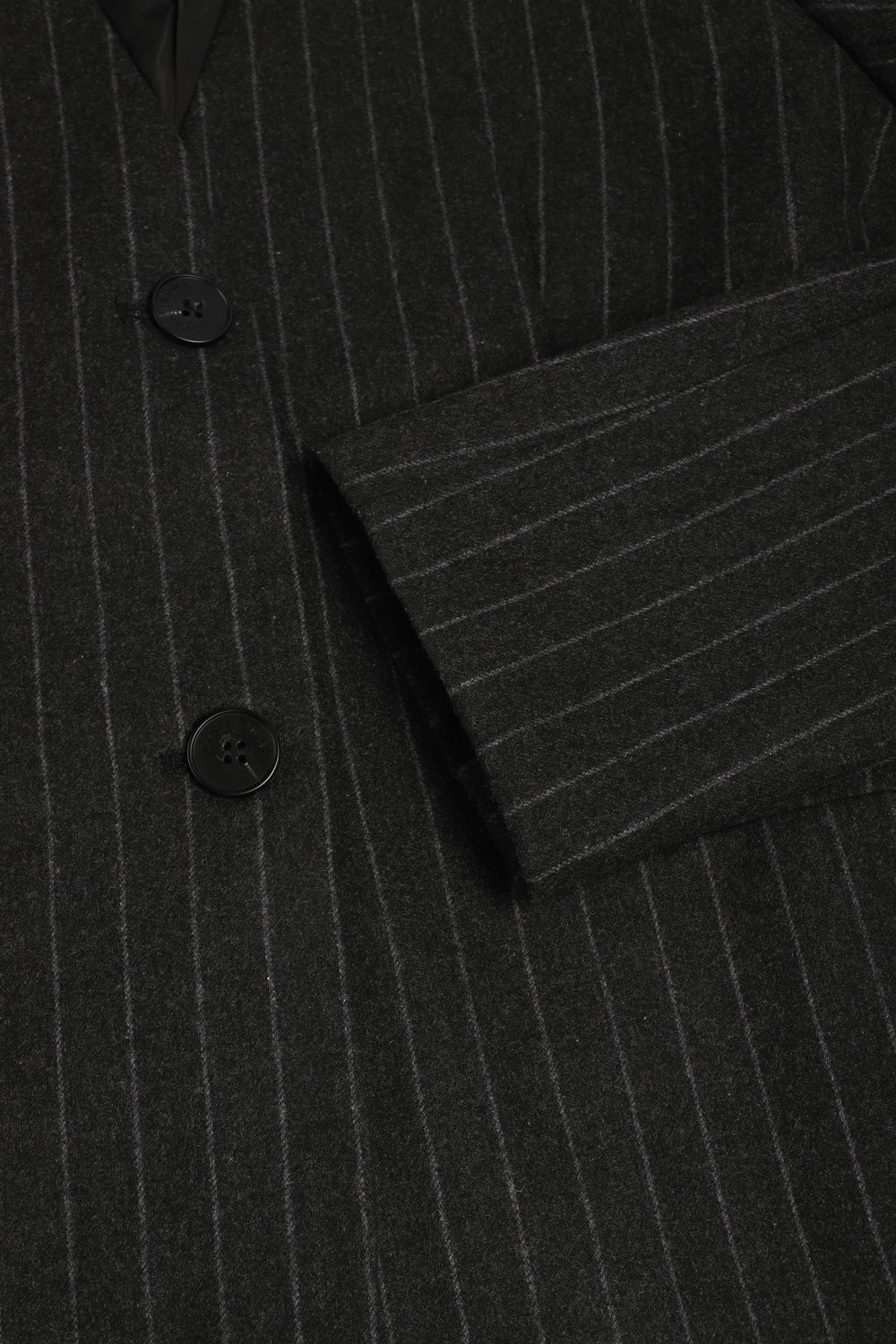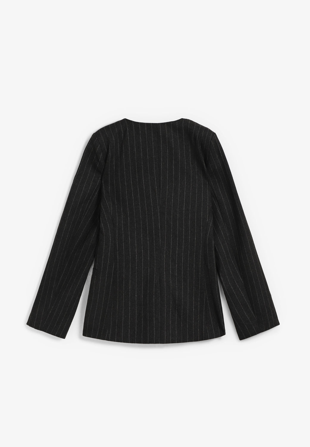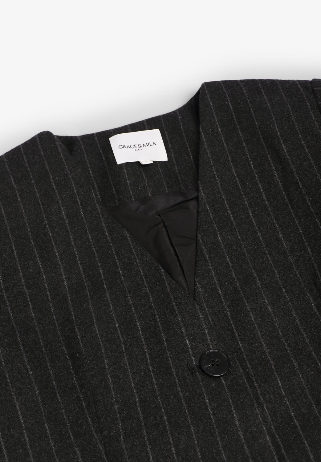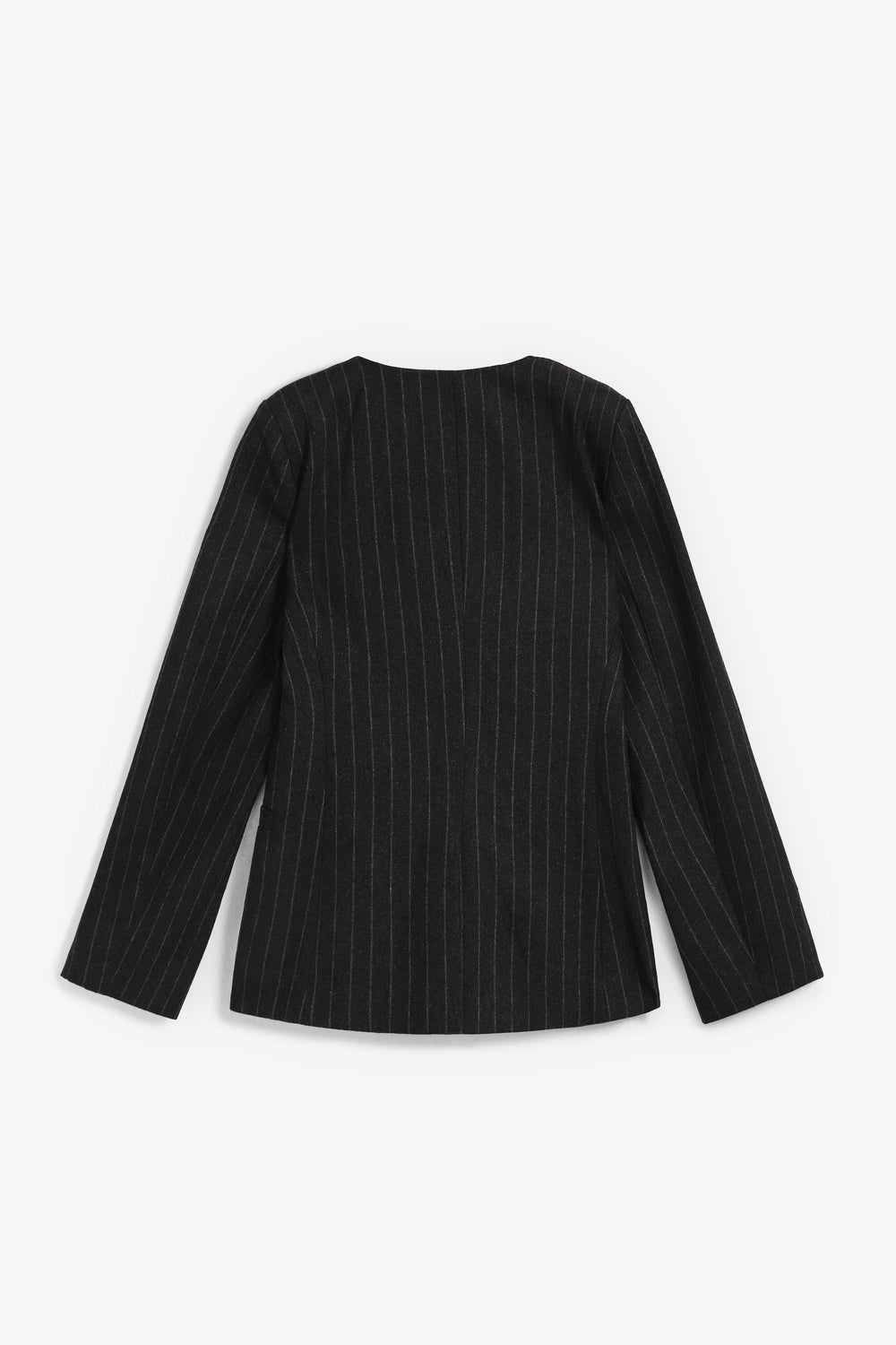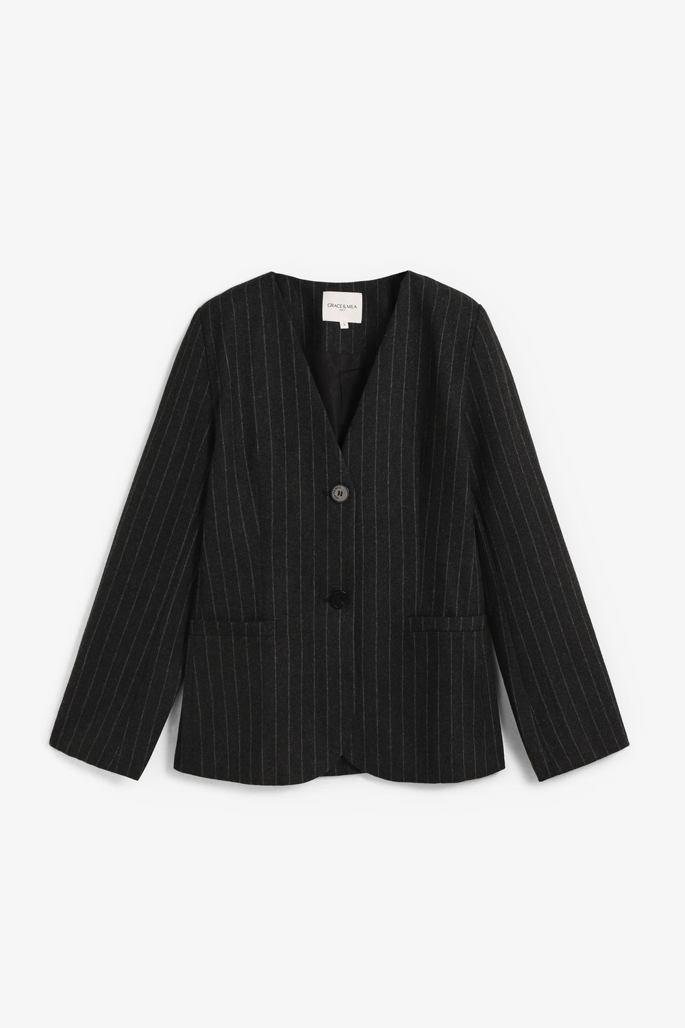 Blazer Grace & Mila confeccionada en 85% poliéster y 15% lana. Presenta un diseño de rayas en contraste, sin cuello y con un corte entallado. Está forrada e incorpora un cierre de botonadura sencilla y bolsillos de ribete en la parte delantera.