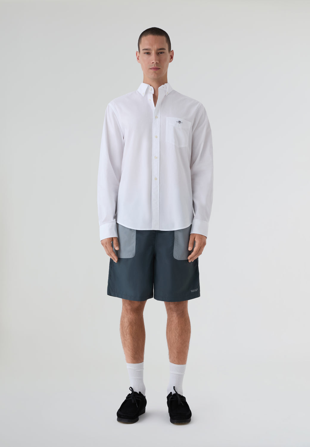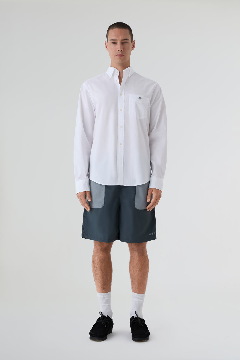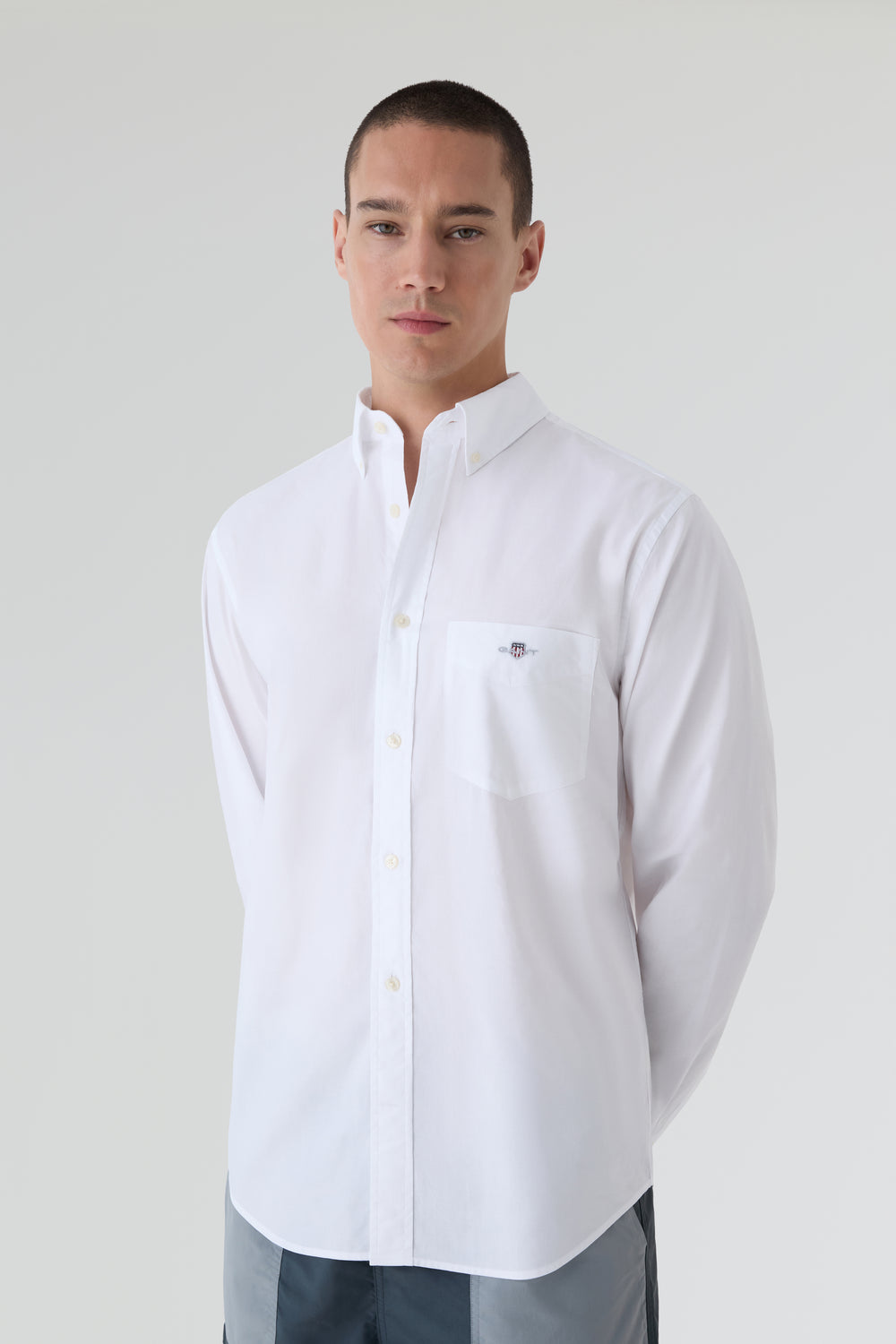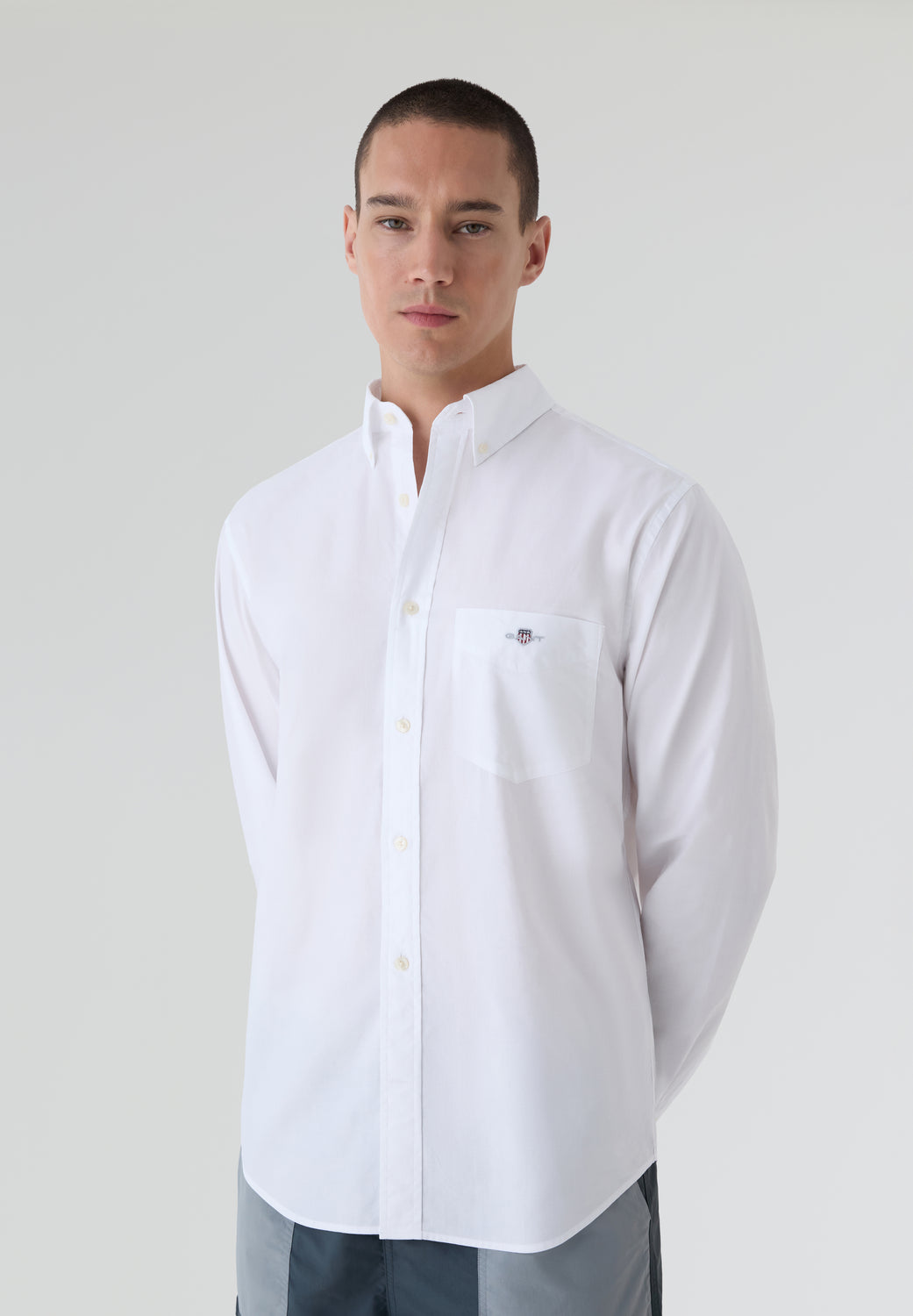 Camisa Gant confeccionada en tejido de popelina. Cuenta con el logotipo bordado en el pecho, bajo curvado, puños normales y cuello francés.