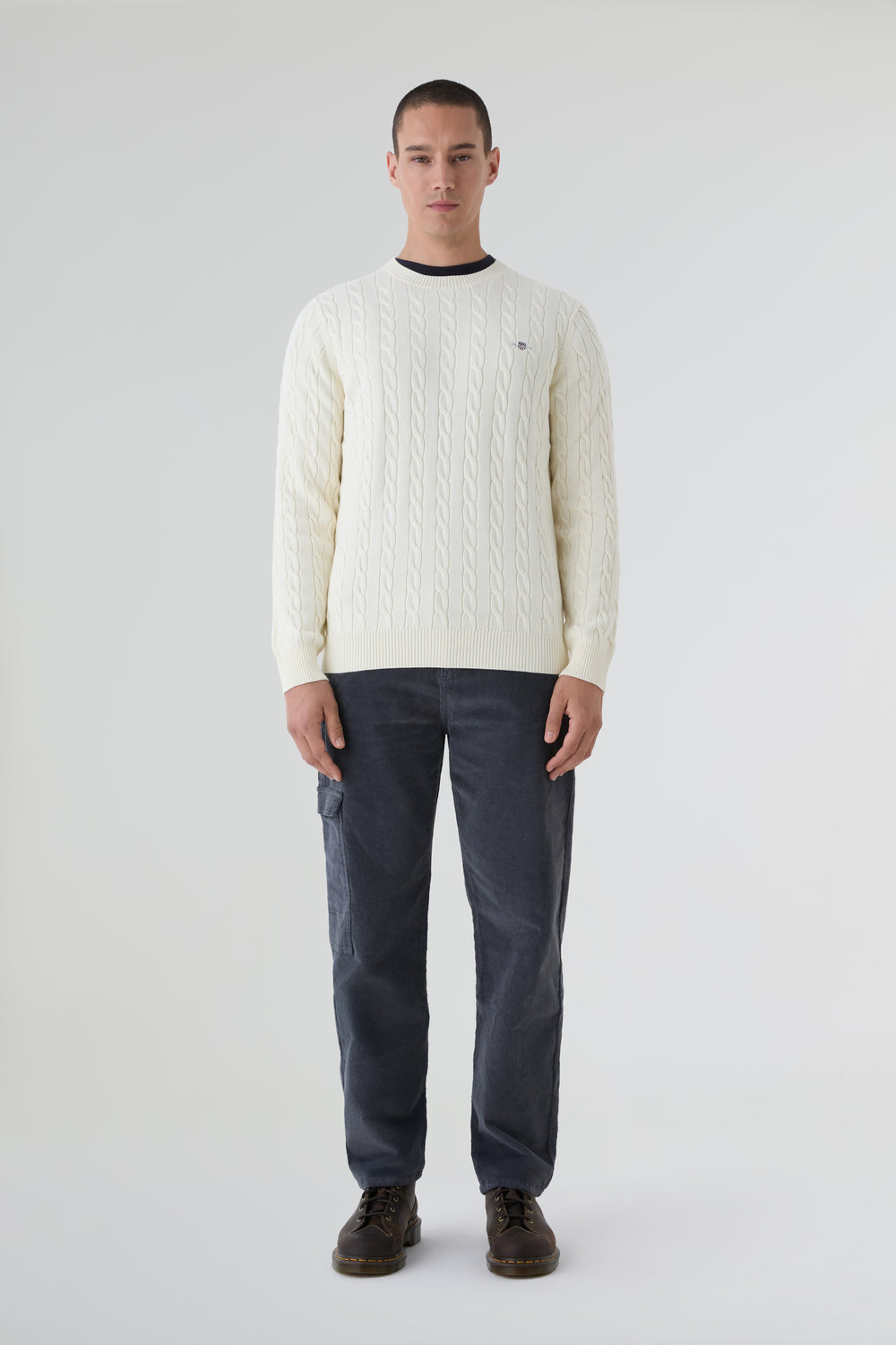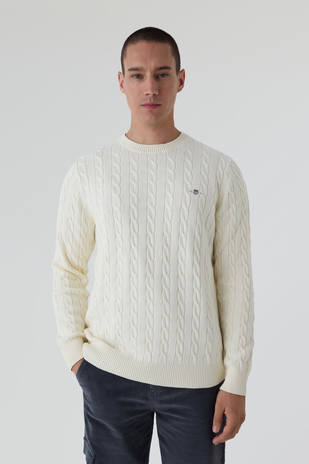 Jersey Gant confeccionado en 100% algodón con un diseño de punto de ochos, corte regular y cuello redondo. Detalle insignia Gant bordada en el pecho y terminaciones acanaladas en el cuello, el bajo y los puños.