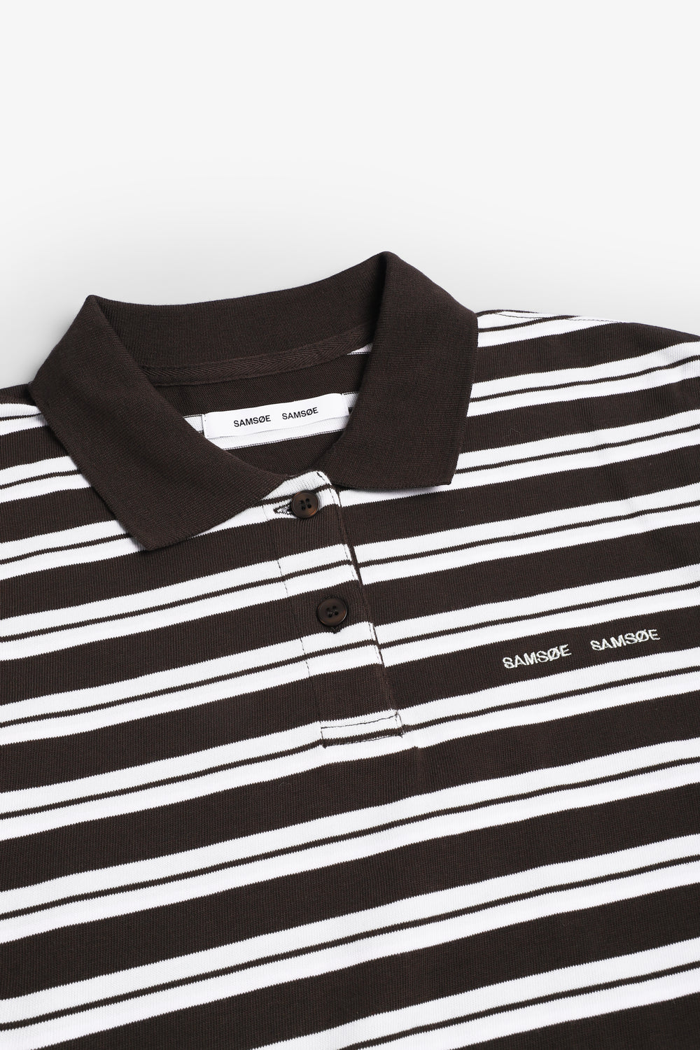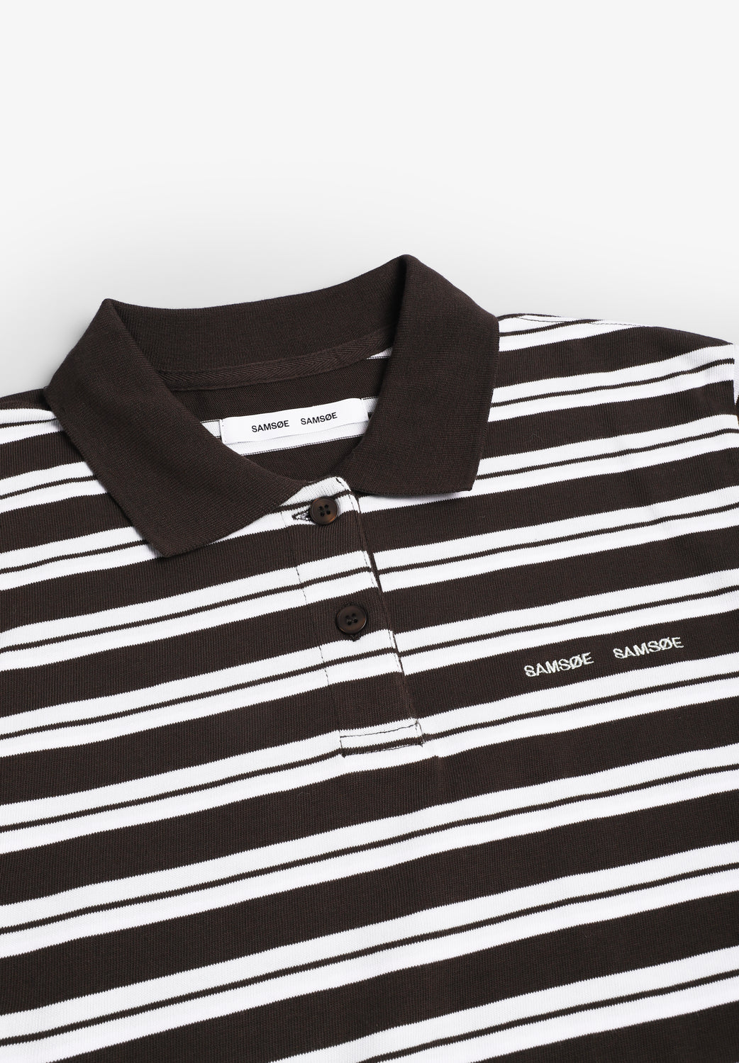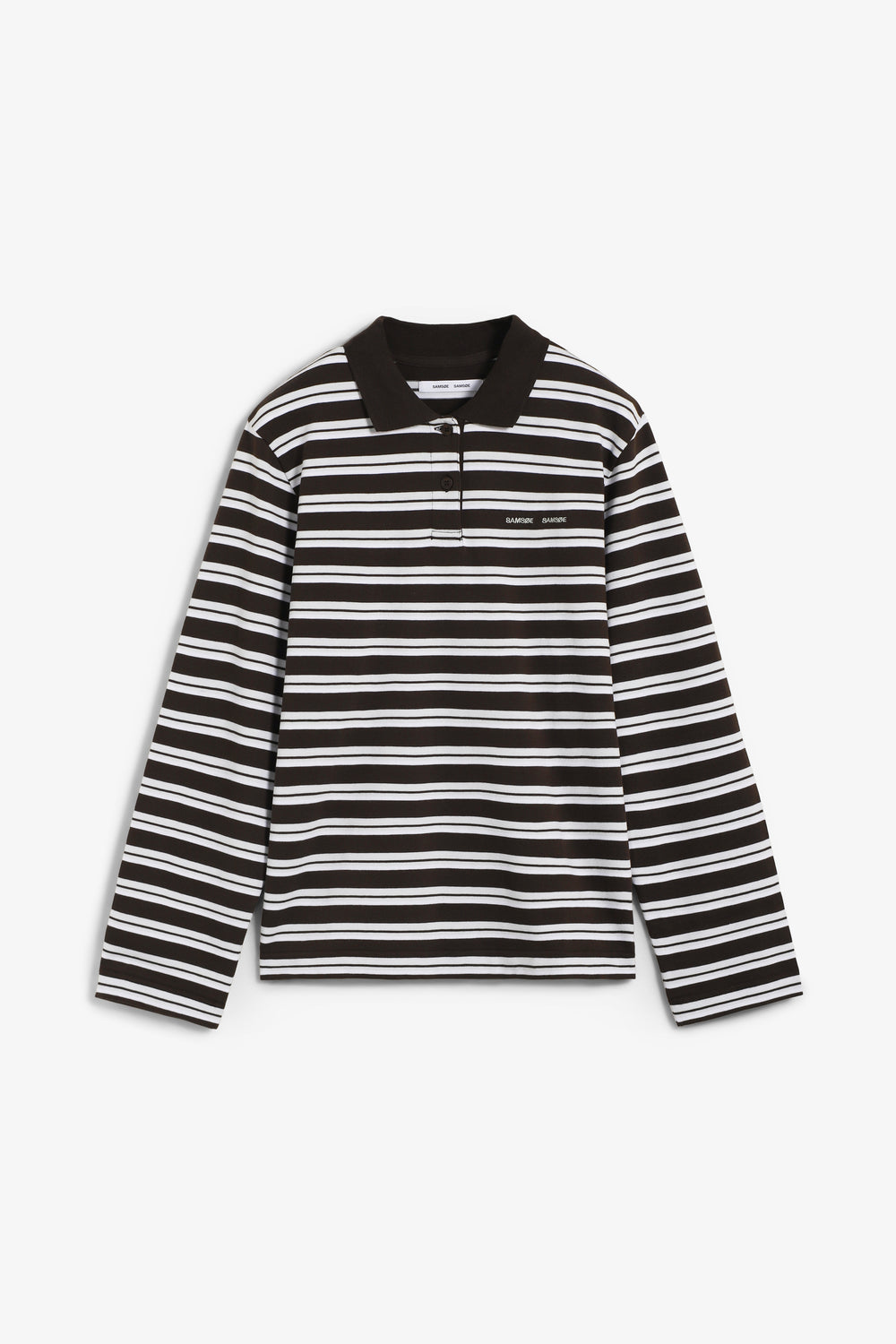 Polo a rayas Samsoe Samsoe confeccionado en 100% algodón orgánico, corte holgado y mangas caídas. Cuenta con cierre frontal con botones cortos, cuello polo de punto acanalado y logotipo bordado en el pecho. Certificación GOTS.