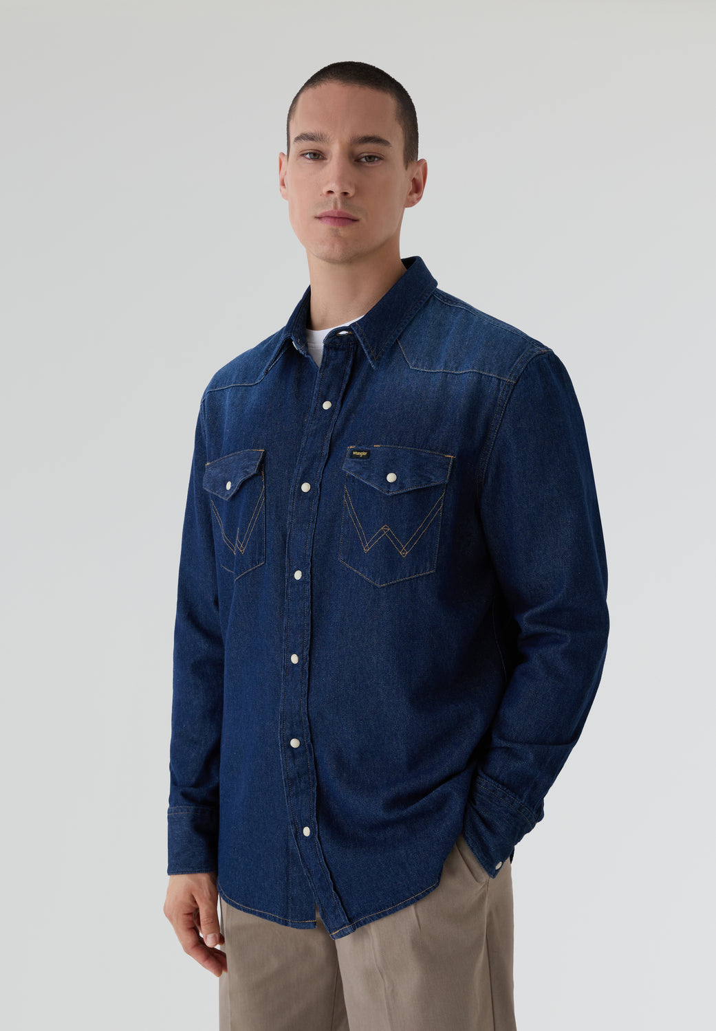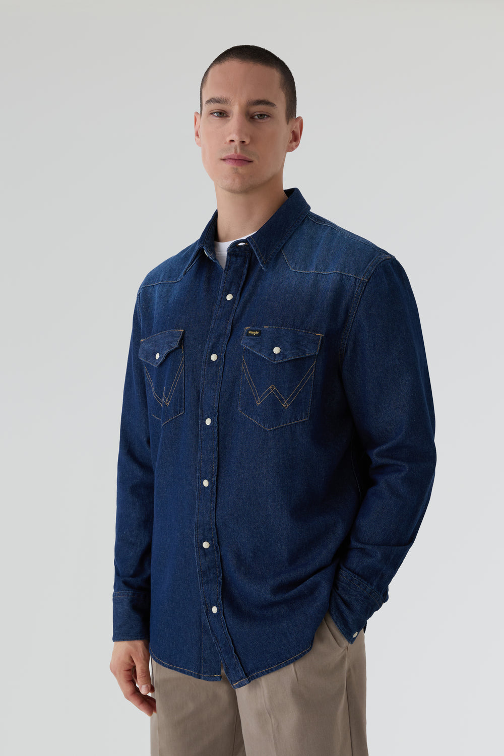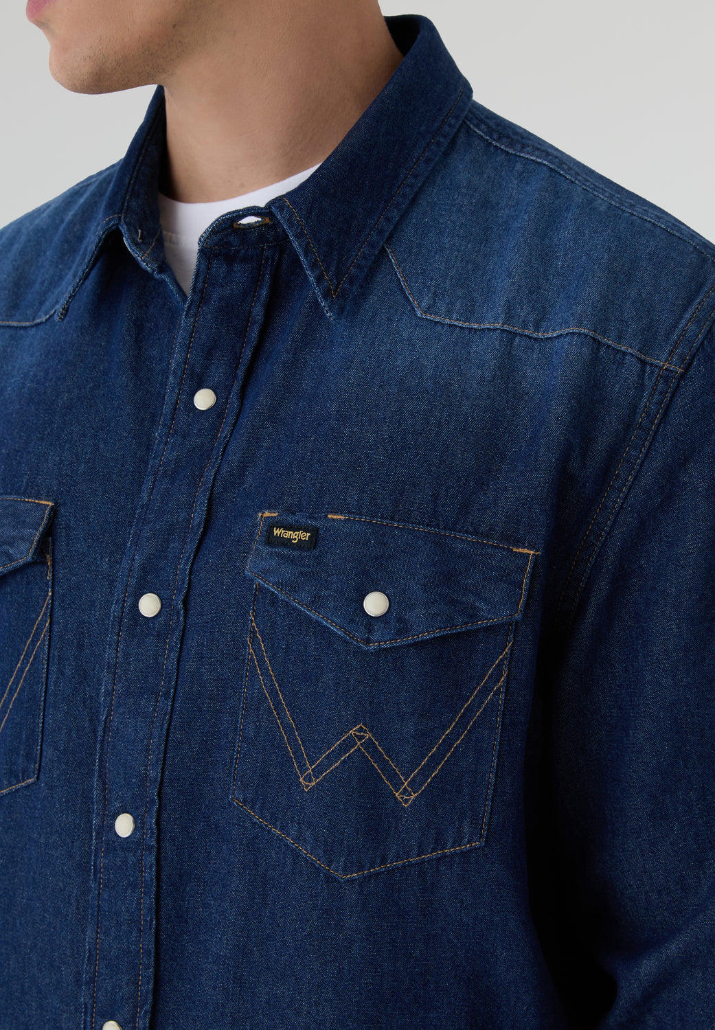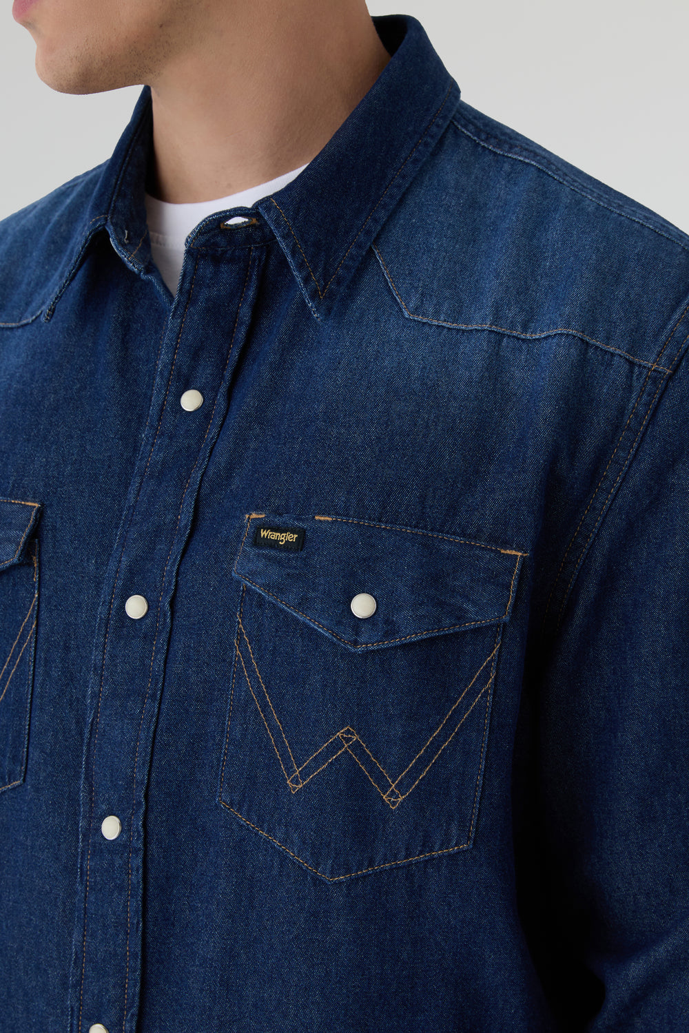 Camisa Wrangler confeccionada en 100% algodón sin elasticidad, de corte regular y con detalles como un yugo tejano, cuello en punto, cierre de botón a presión y bolsillos de solapa parejos.