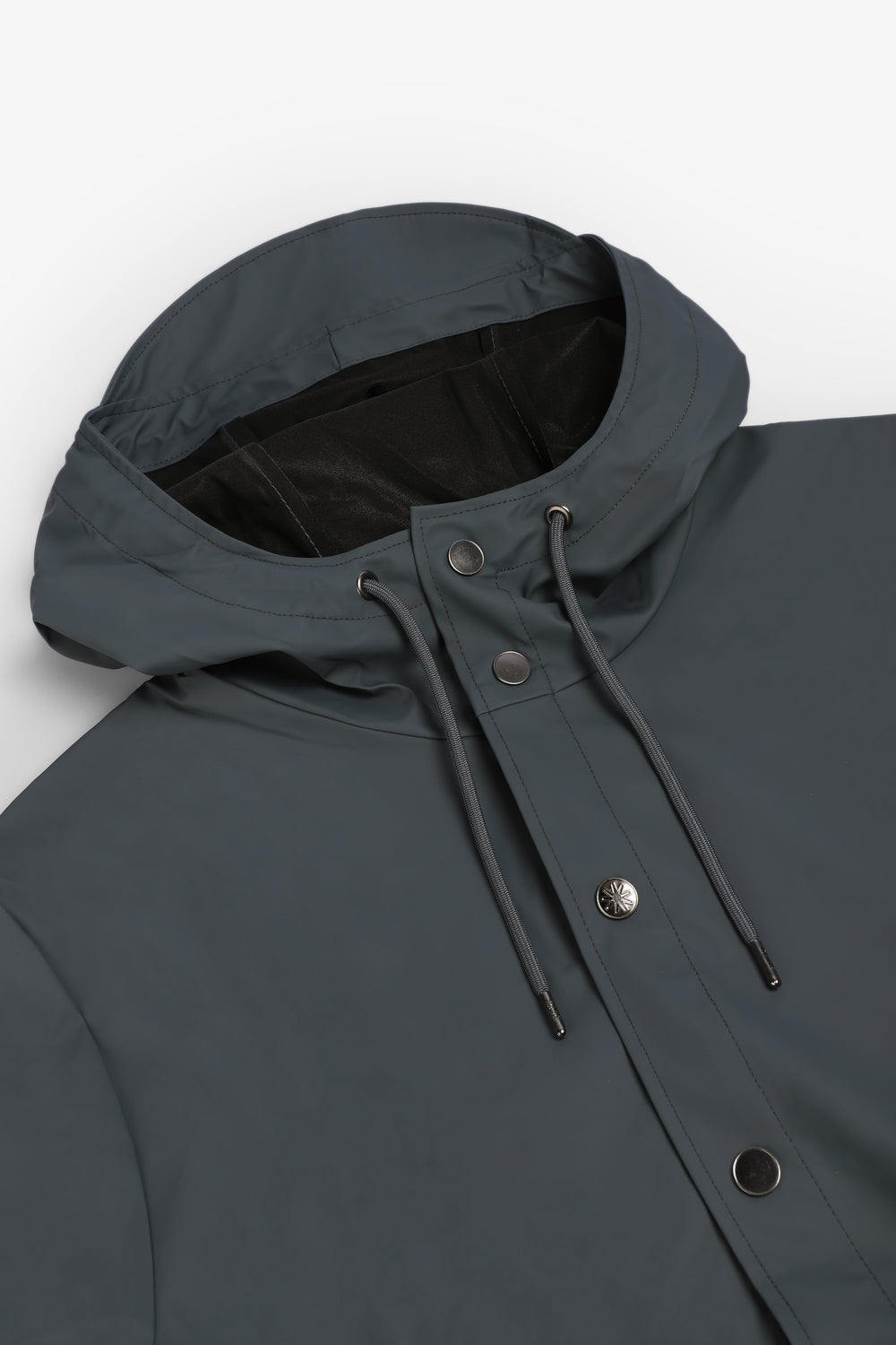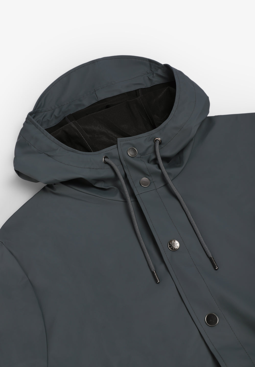 Chaqueta Rains W3 confeccionada en 100% poliéster. Impermeable que presenta una tapeta con botones de presión, capucha con visera incorporada y dos bolsillos laterales con botones a presión. Las mangas presentan botones de presión que permiten un ajuste suelto o recogido. Cuenta con ojales en las axilas y un cenesú trasero con orificios de ventilación ocultos para mayor comodidad y transpirabilidad. Costuras selladas y corte largo.