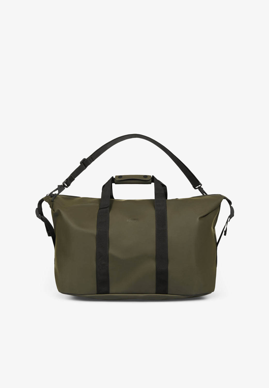 Bolsa Rains confeccionada en tejido 100% poliéster. Presenta un acabado impermeable, una cremallera integral con revestimiento, correas de ajuste laterales y asas de transporte tipo cincha, con una cómoda pieza envolvente de agarre, junto con anillas para enganchar la correa desmontable para el hombro que viene incluida. Detalle logo marca grabado.