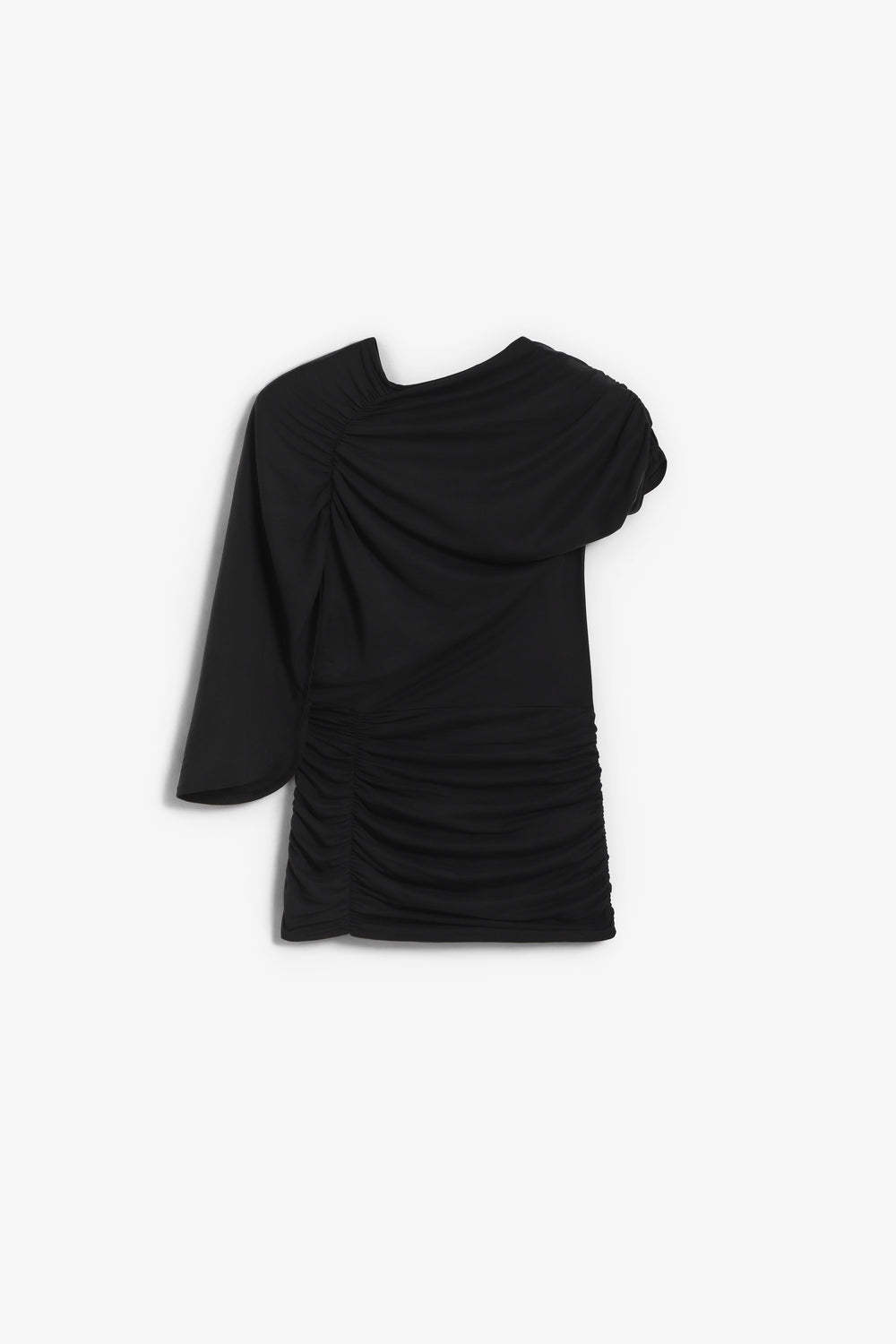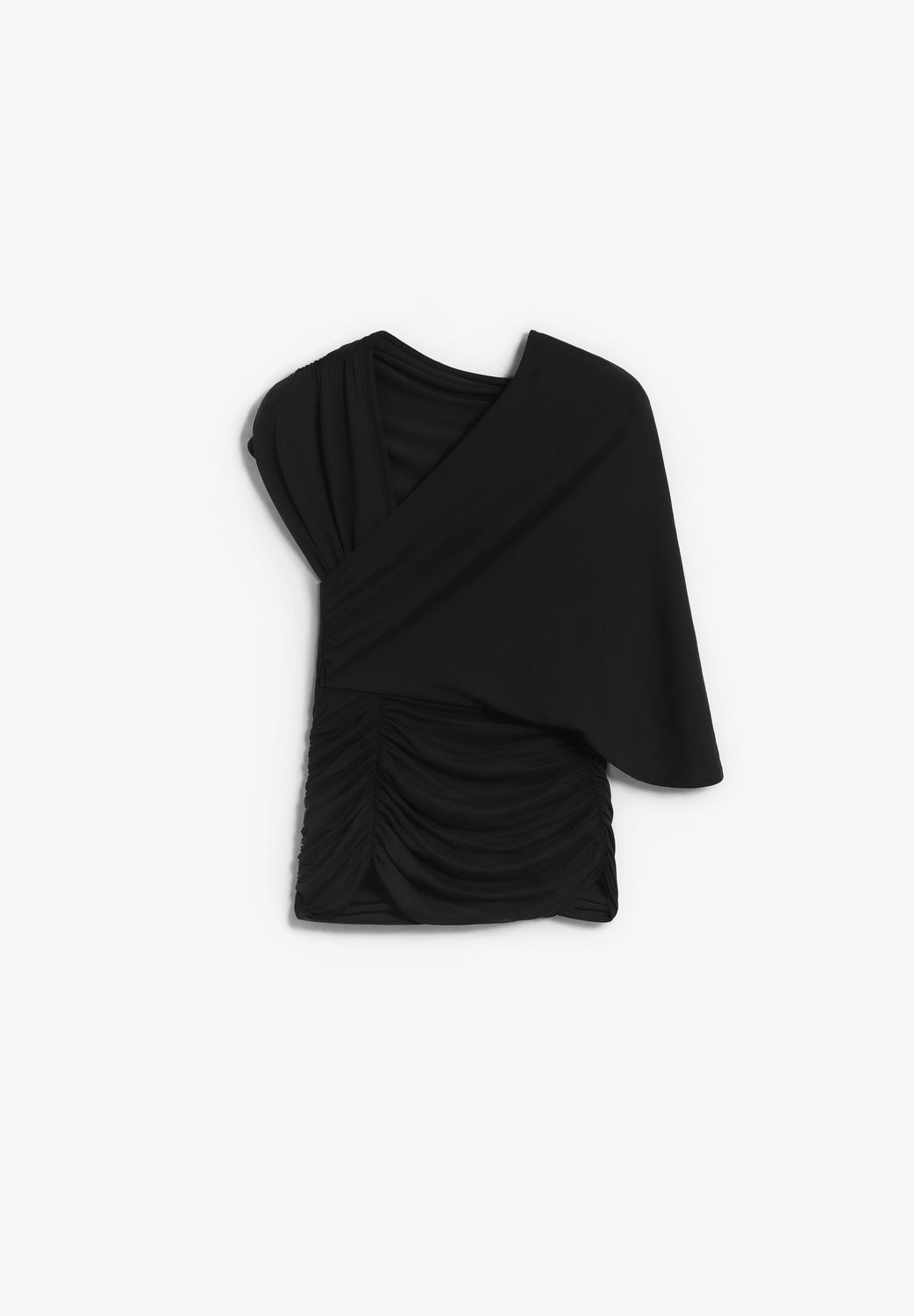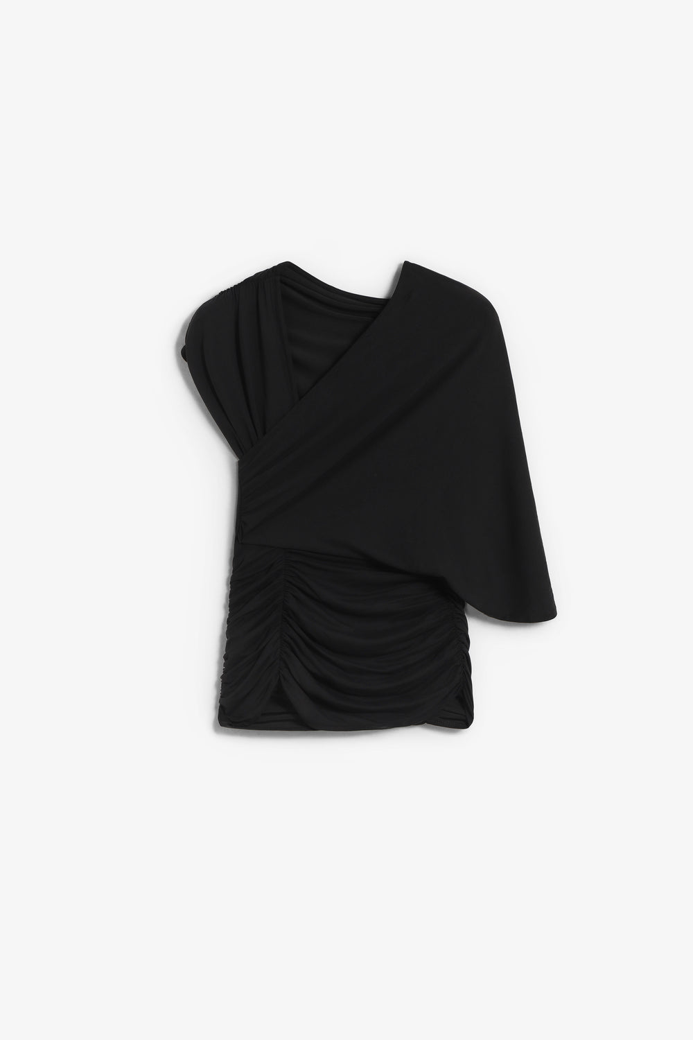 Top Laagam asimétrico confeccionado en 70% modal y 30% poliéster. Pieza drapeada en el escote de un lado y pieza de manga en el otro, desde el hombro hasta la espalda. Cuenta con la espalda abierta y drapeado en la cintura con detalles en los laterales.