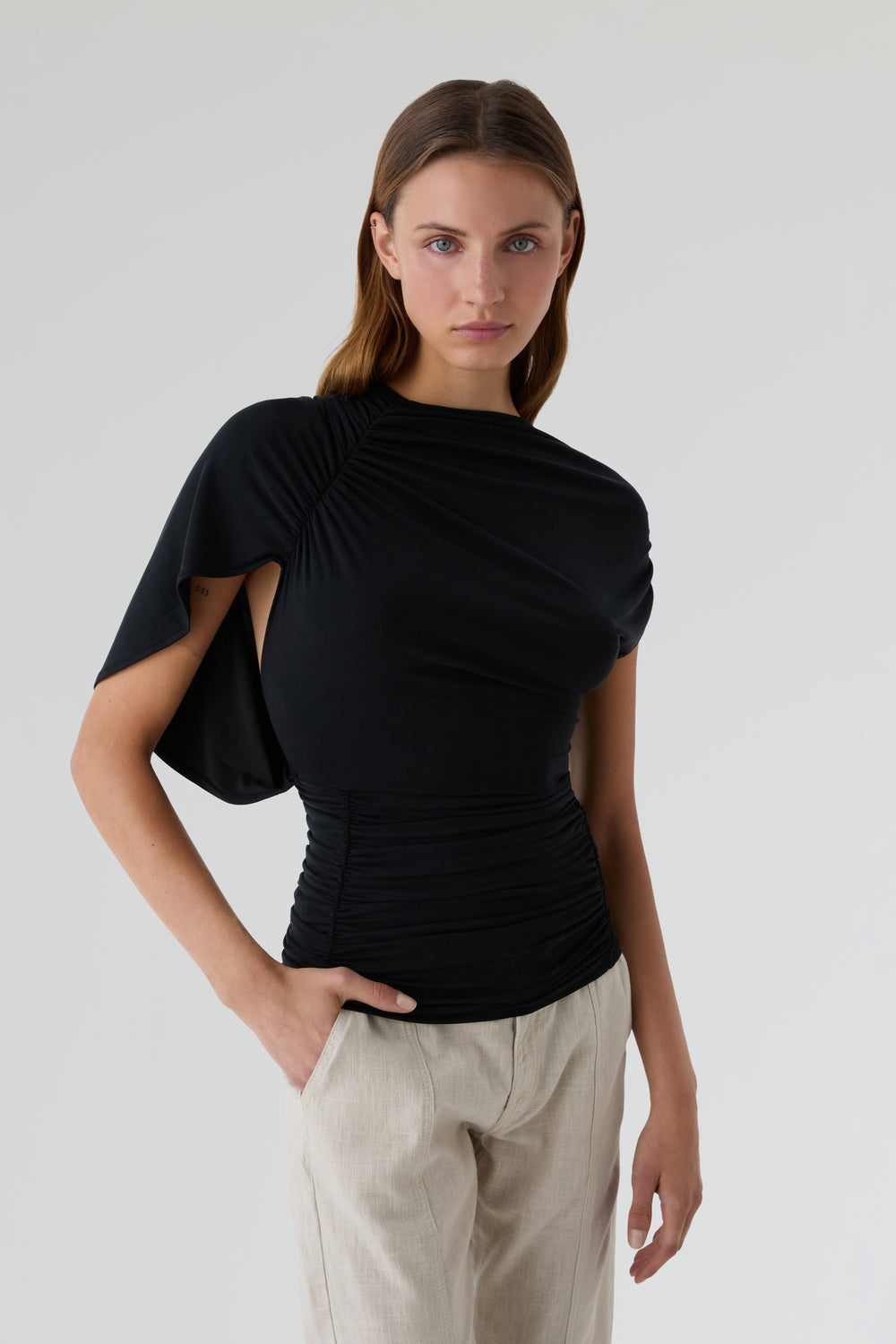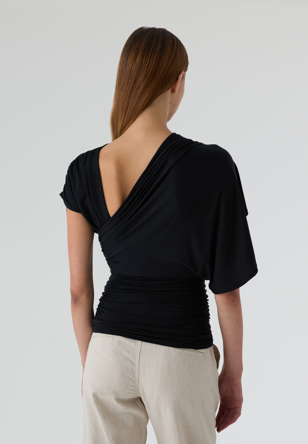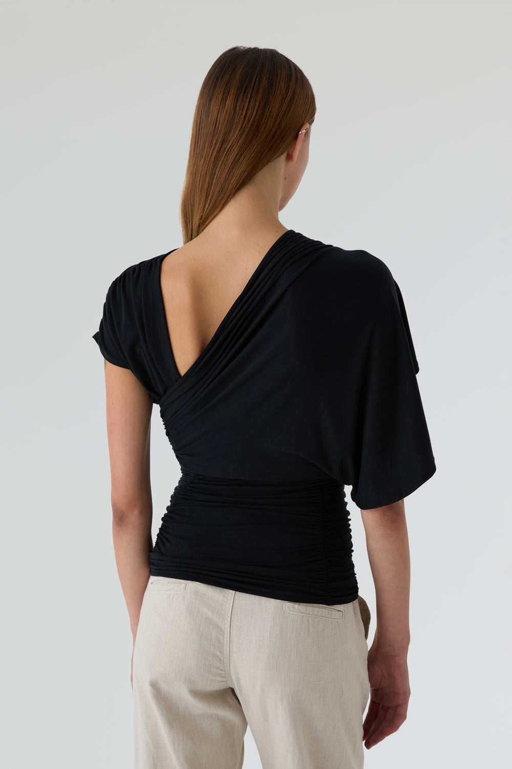 Top Laagam asimétrico confeccionado en 70% modal y 30% poliéster. Pieza drapeada en el escote de un lado y pieza de manga en el otro, desde el hombro hasta la espalda. Cuenta con la espalda abierta y drapeado en la cintura con detalles en los laterales.