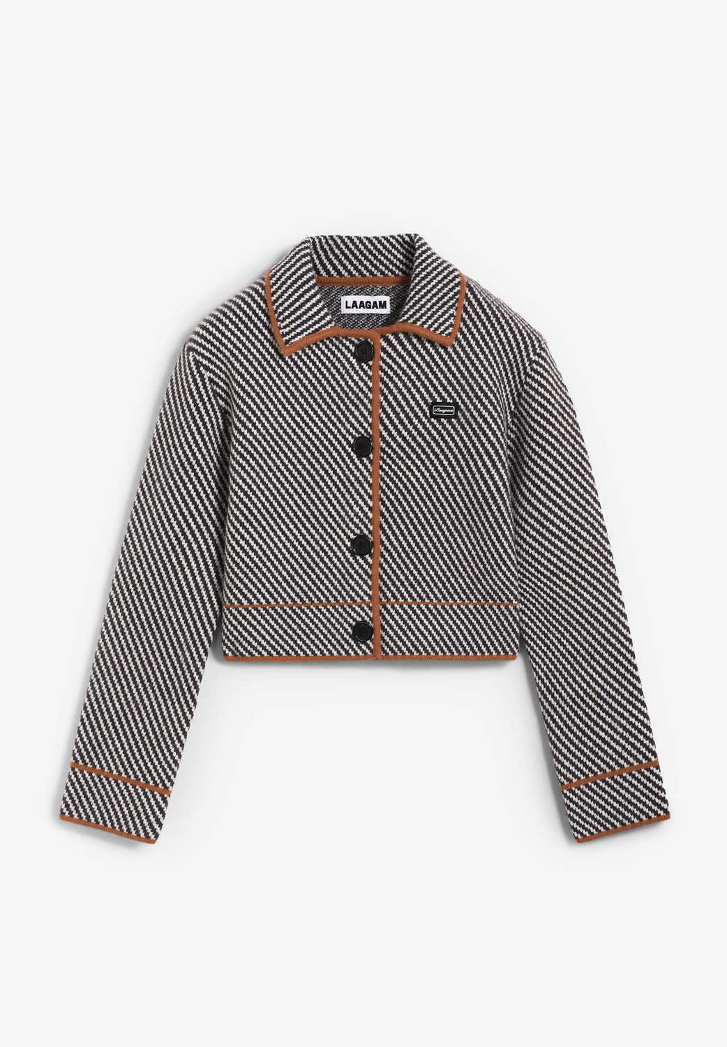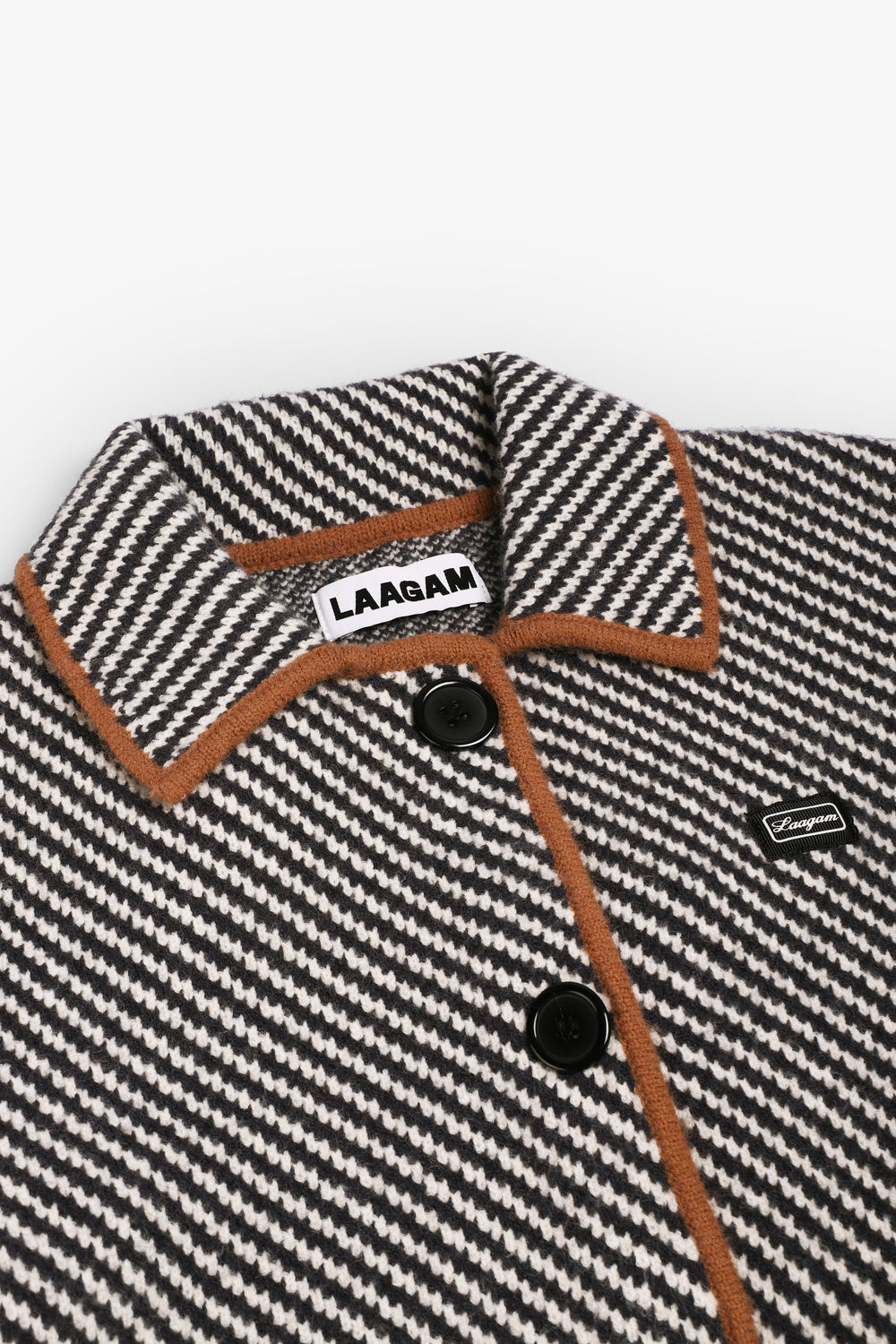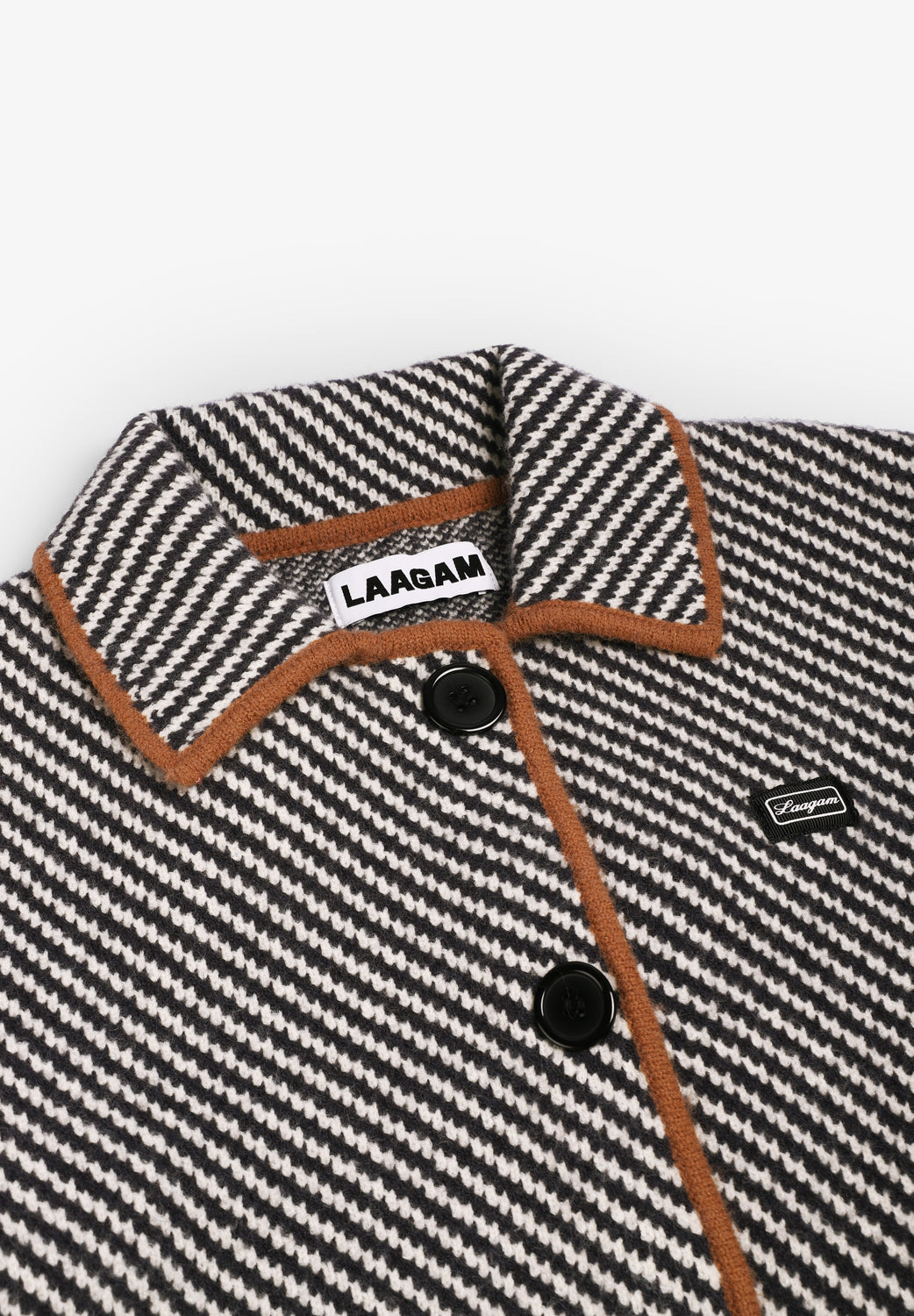 Cardigan Laagam confeccionado en un tejido suave y transpirable, garantizando calidez sin volumen. Cuenta con ribetes burdeos intensos y cuello abierto.