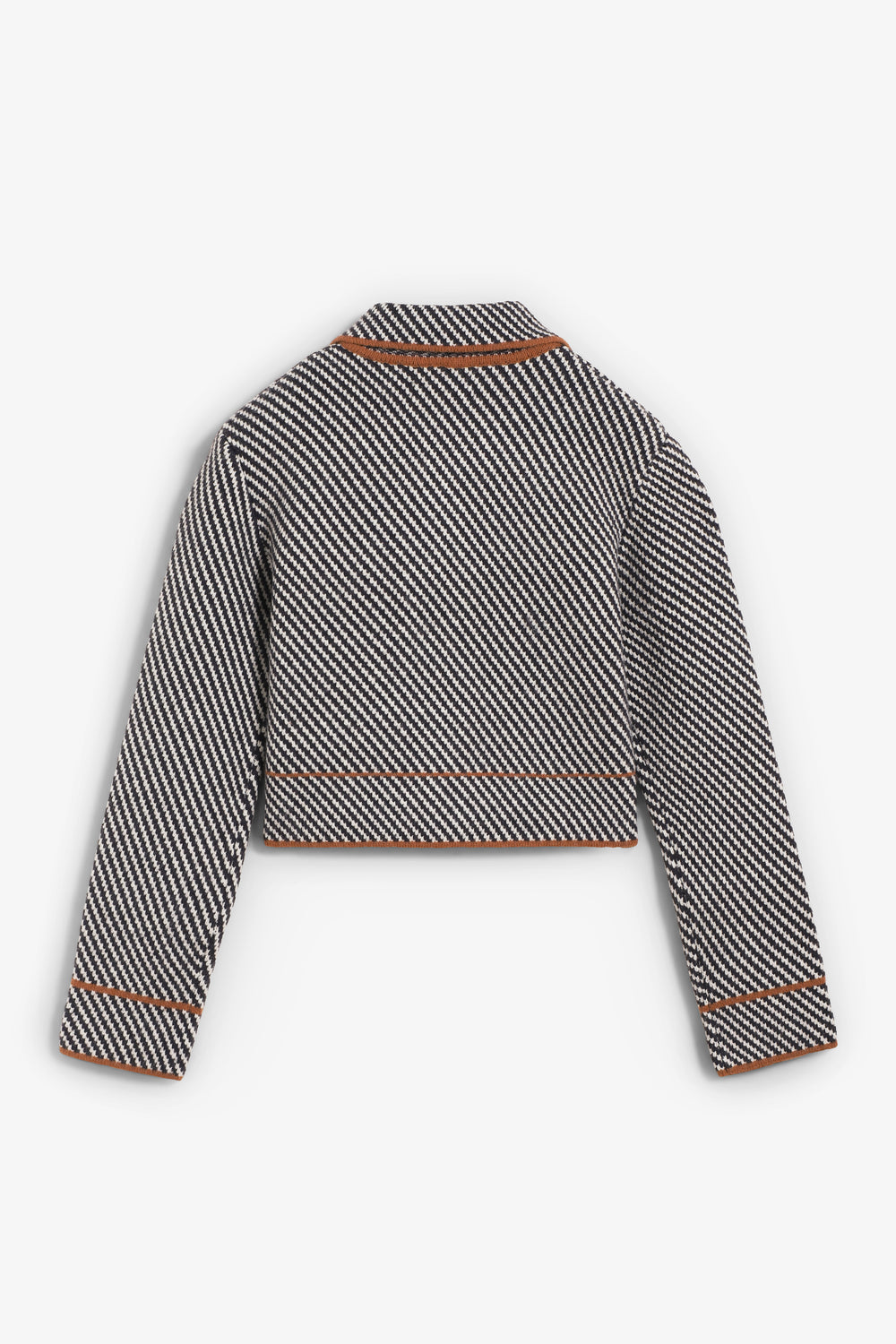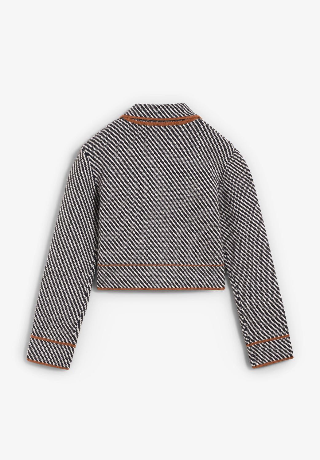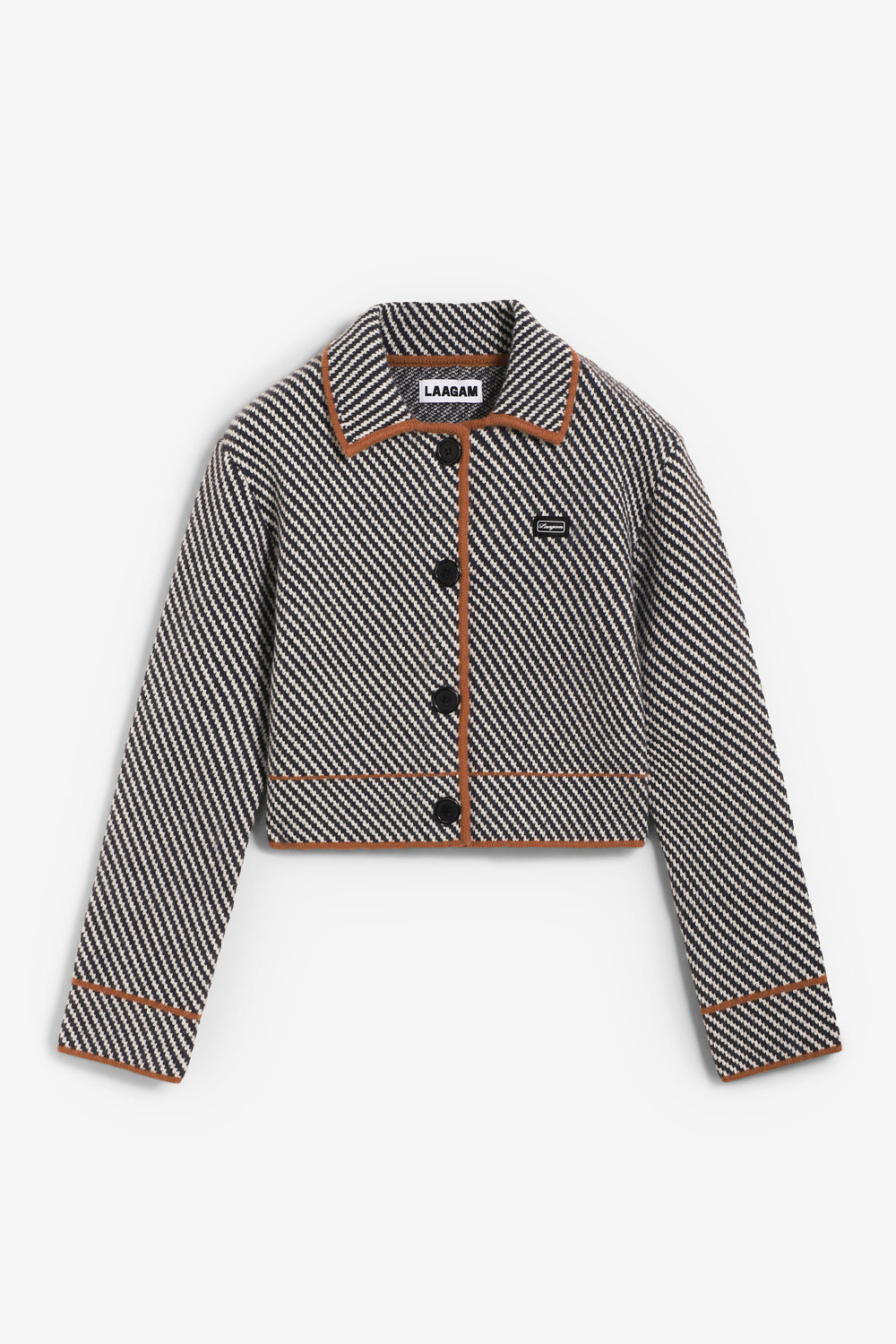 Cardigan Laagam confeccionado en un tejido suave y transpirable, garantizando calidez sin volumen. Cuenta con ribetes burdeos intensos y cuello abierto.