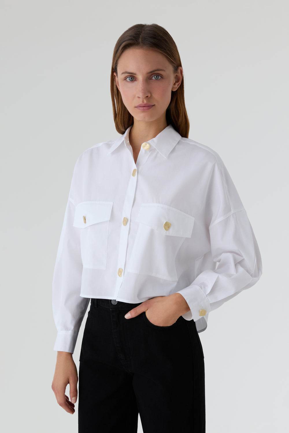 Camisa Sessun confeccionada en 100% algodón y corte cropped en popelín. Presenta cierre de botones tipo joya, manga larga, bolsillos de parche con solapa y detalle de pliegues planos en la parte trasera, las sisas y los puños.