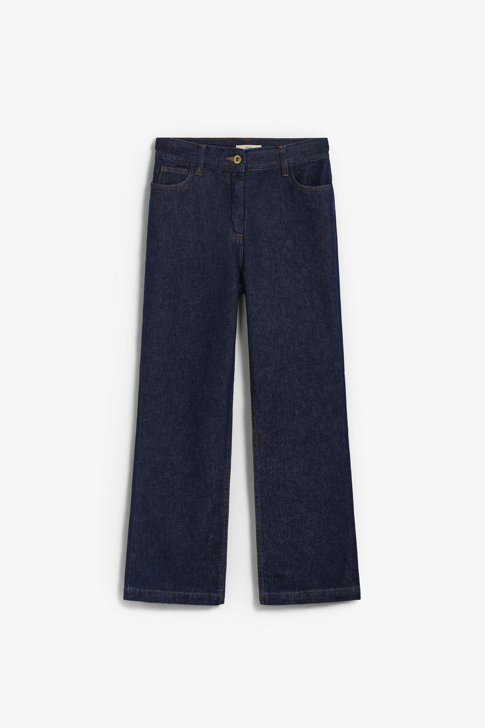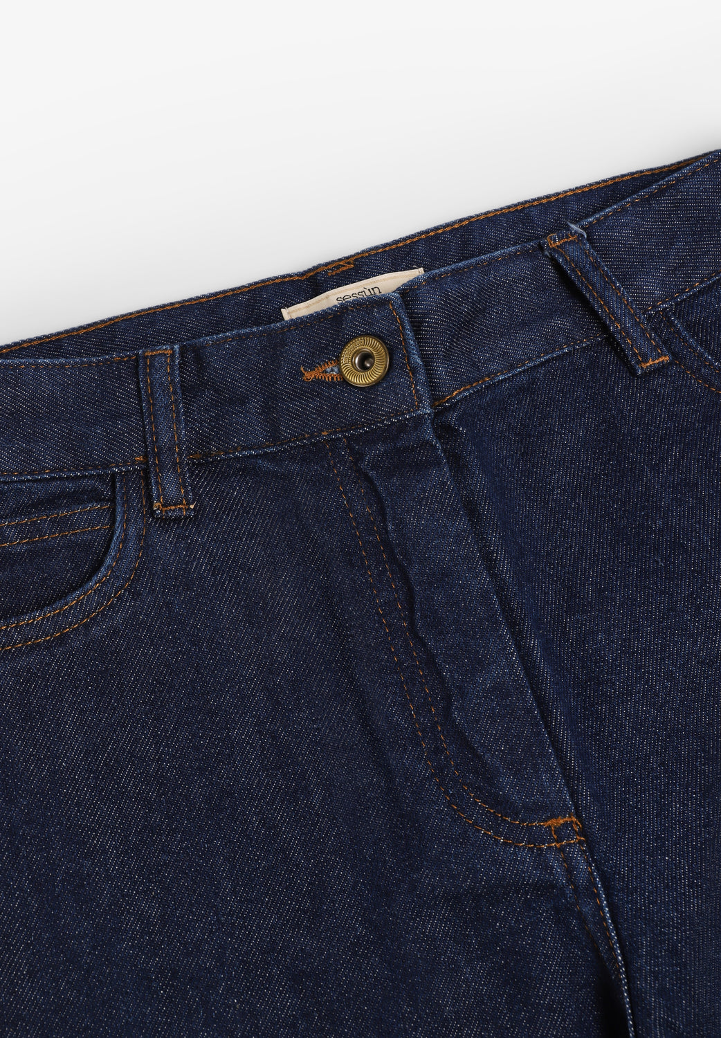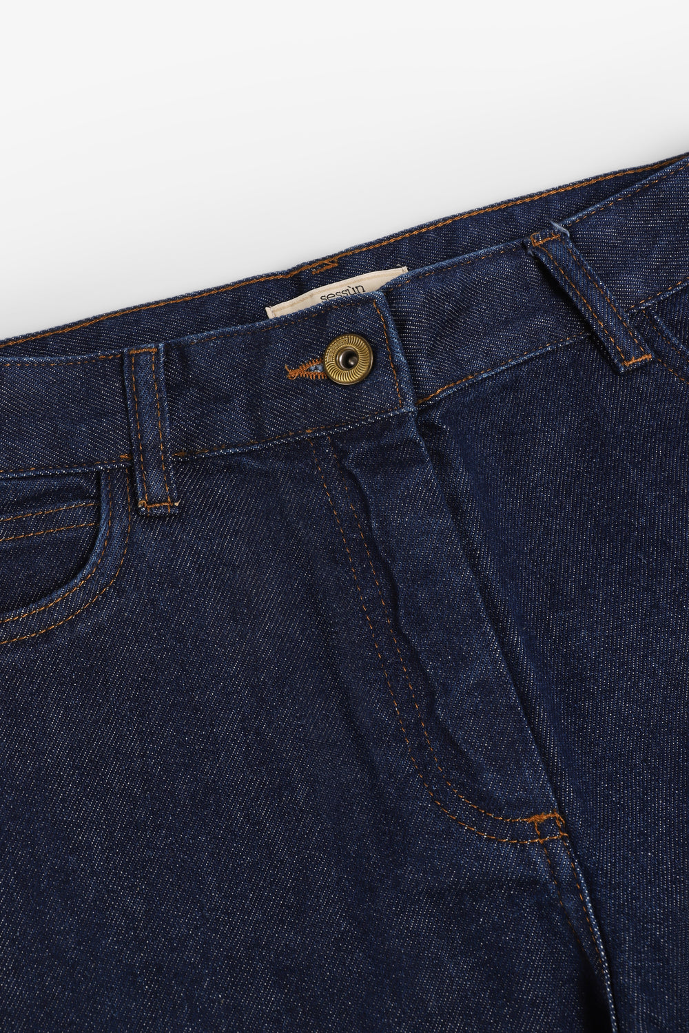 Pantalón vaquero Sessun confeccionado en 100% algodón, de corte recto y talle medio-ato. Cuenta con la pernera ligeramente acampanada, largo tobillero y puntadas a contraste. Cierre de botón en la cintura y cremallera oculta, bolsillos delanteros de relojero y bolsillos traseros de parche.